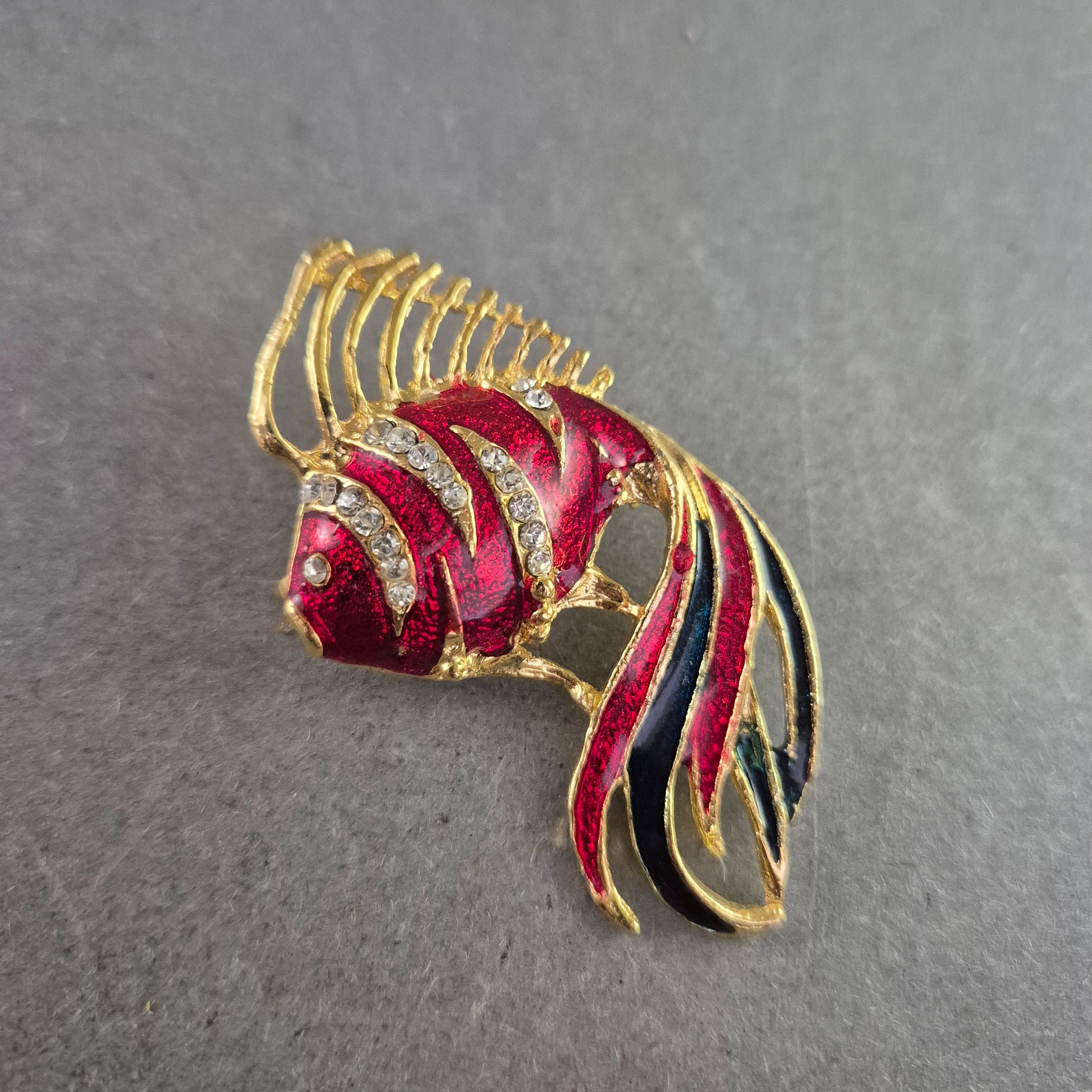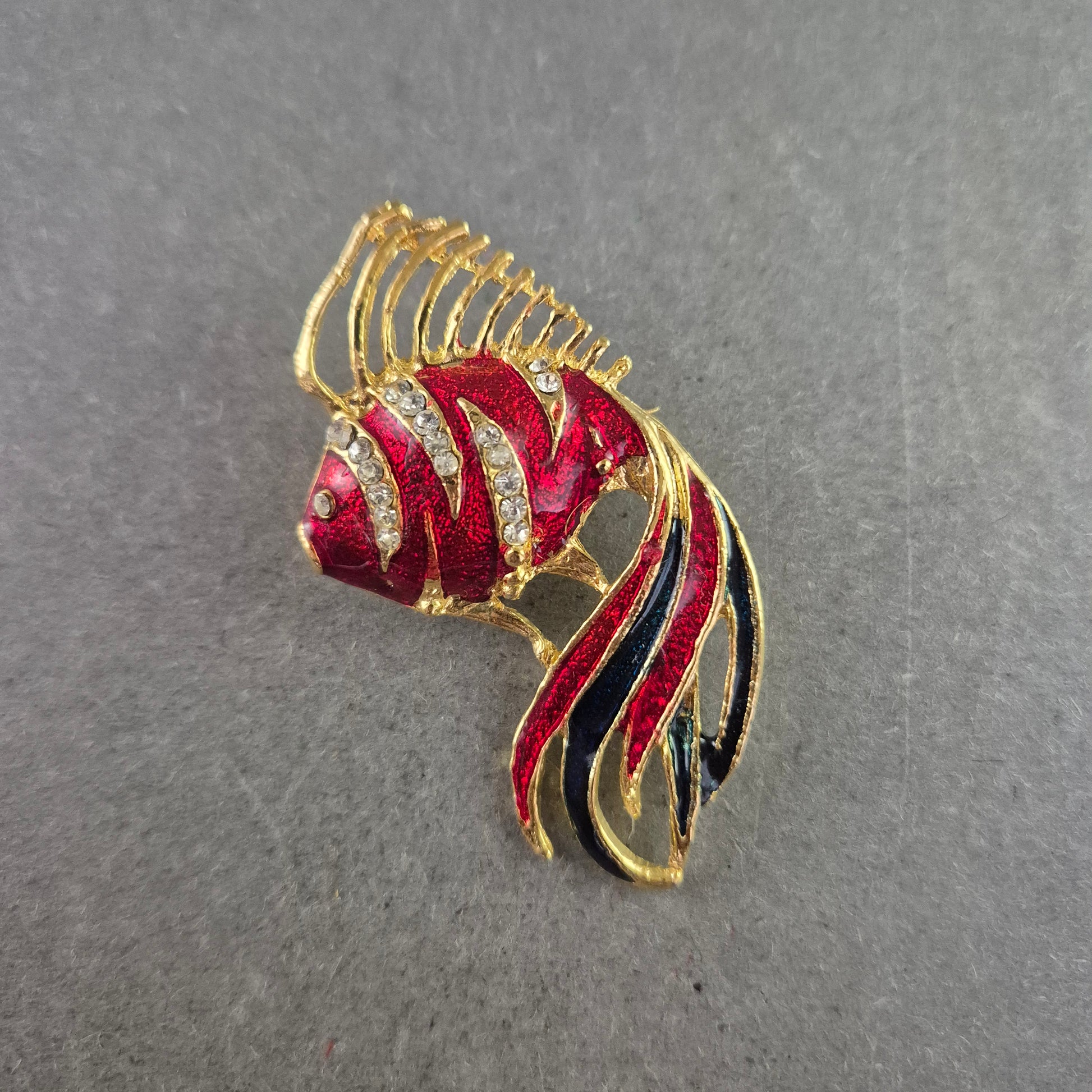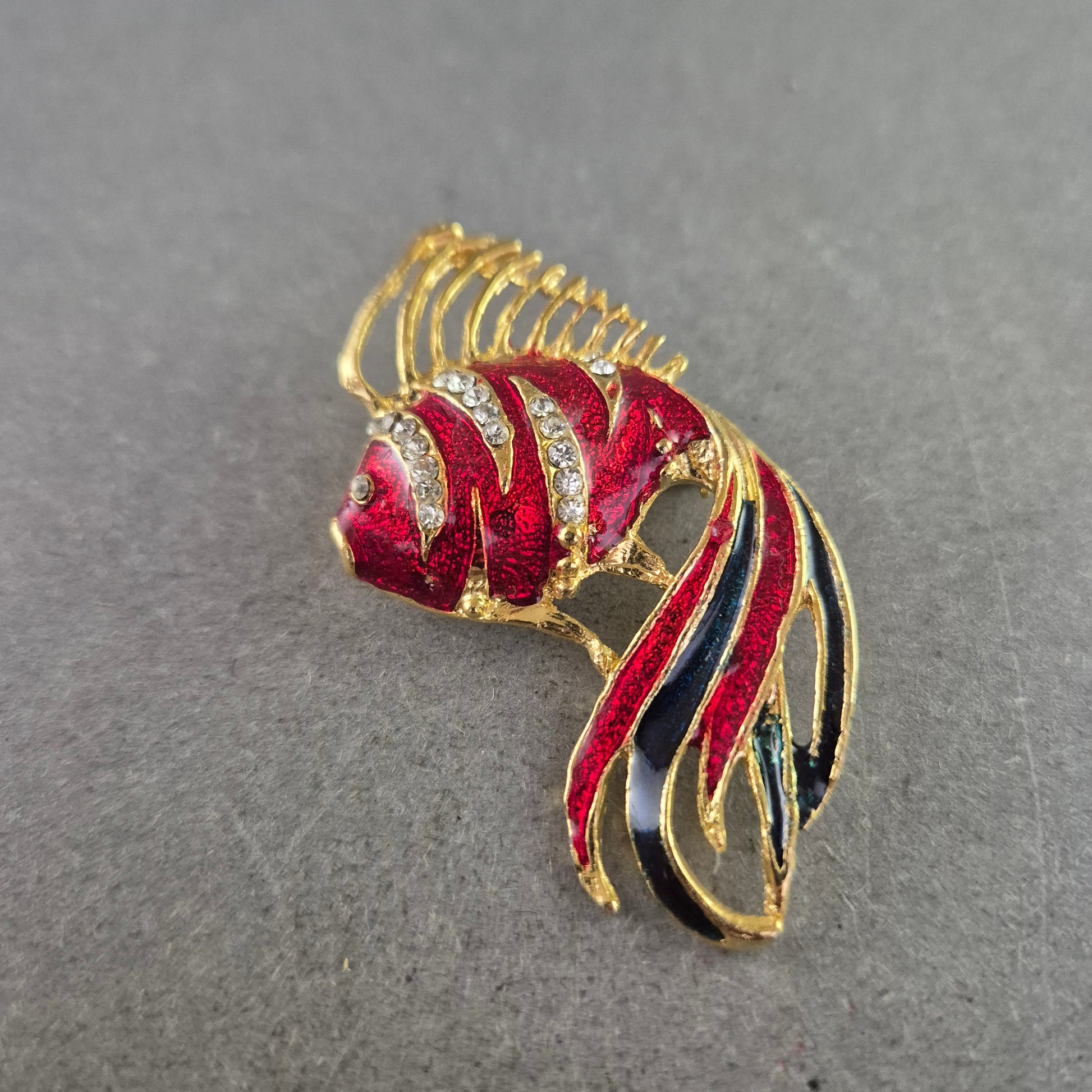 Diese kunstvolle Vintage-Brosche zeigt einen stilisierten Fisch in auffälligem Rot mit schwarzen Akzenten, verziert mit funkelnden Strasssteinen. Die dynamische Gestaltung und leuchtende Emaille-Oberfläche machen sie zu einem Hingucker auf jedem Outfit. Perfekt für Liebhaber maritimer oder ausgefallener Schmuckstücke.