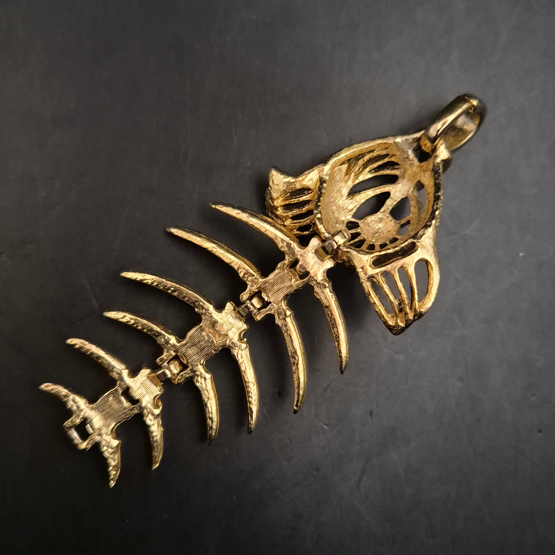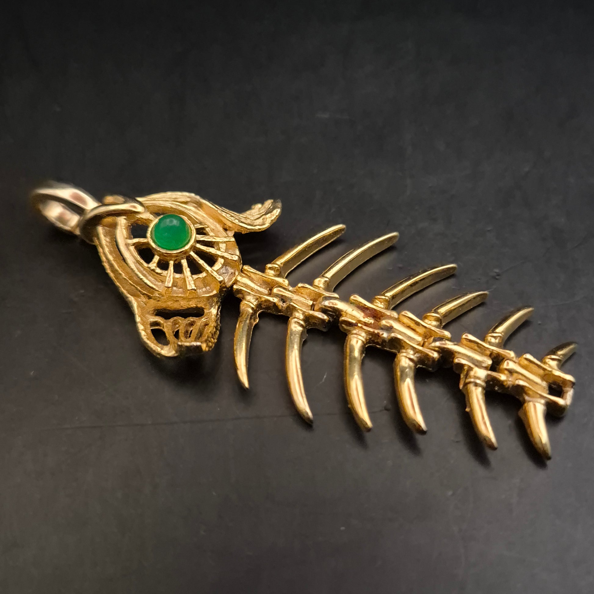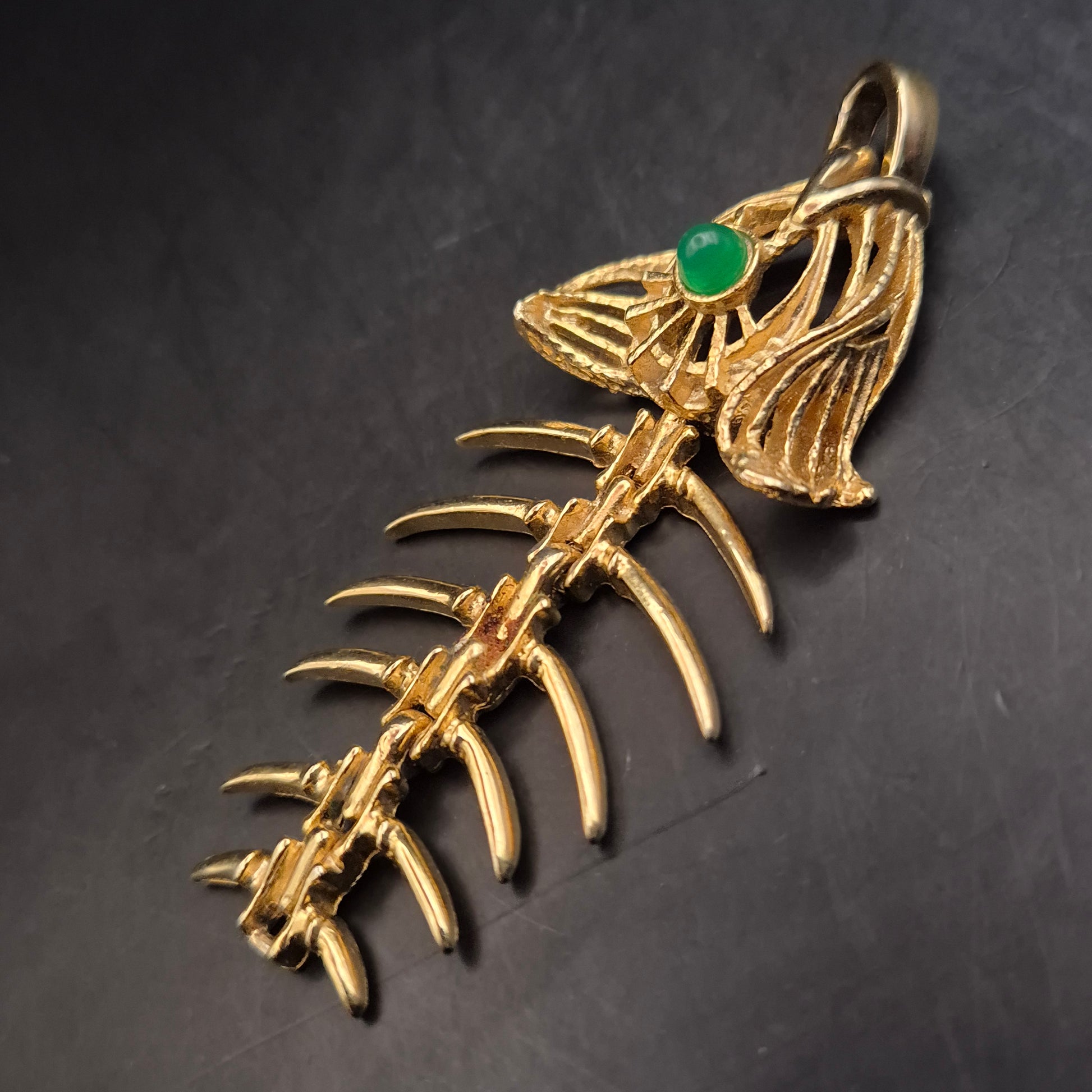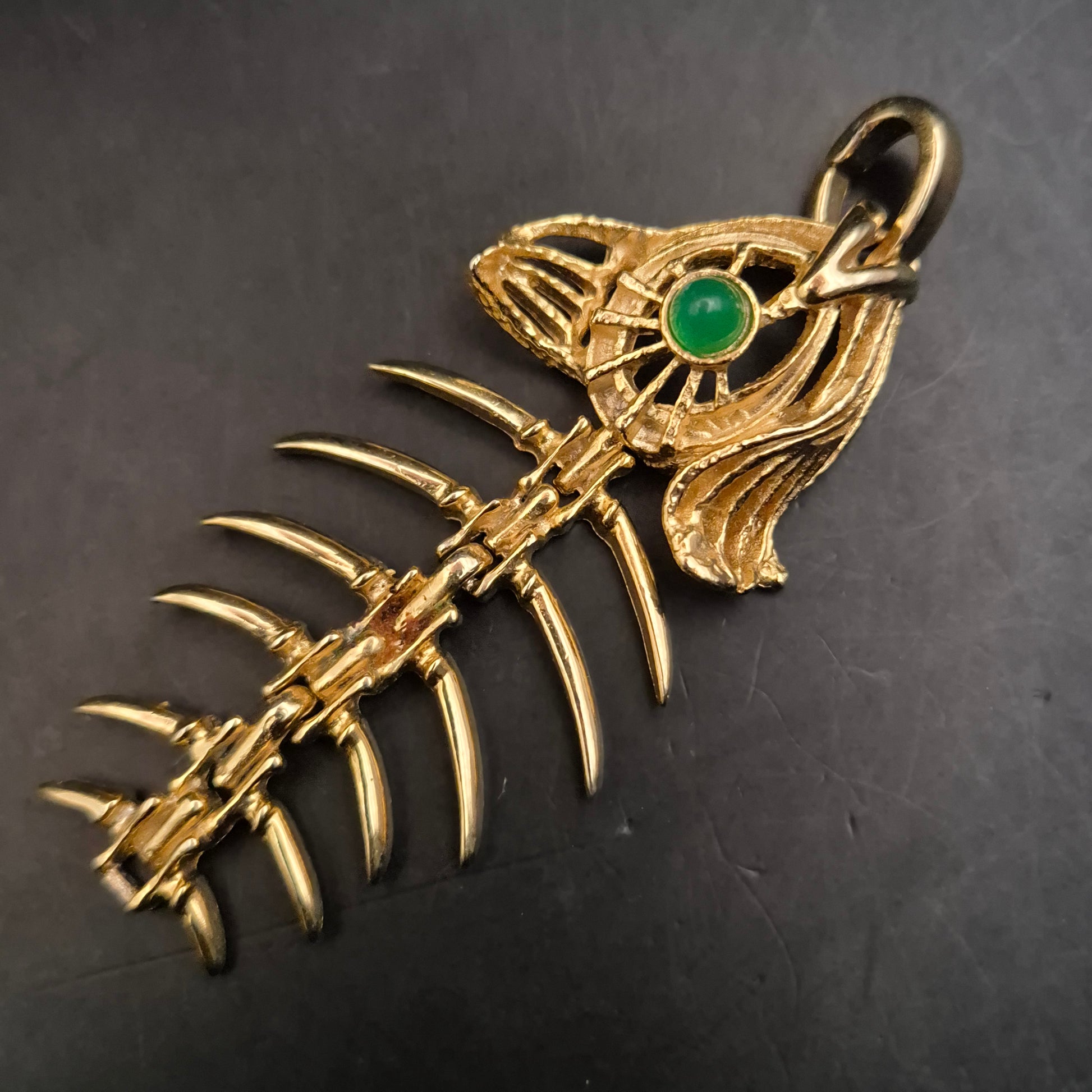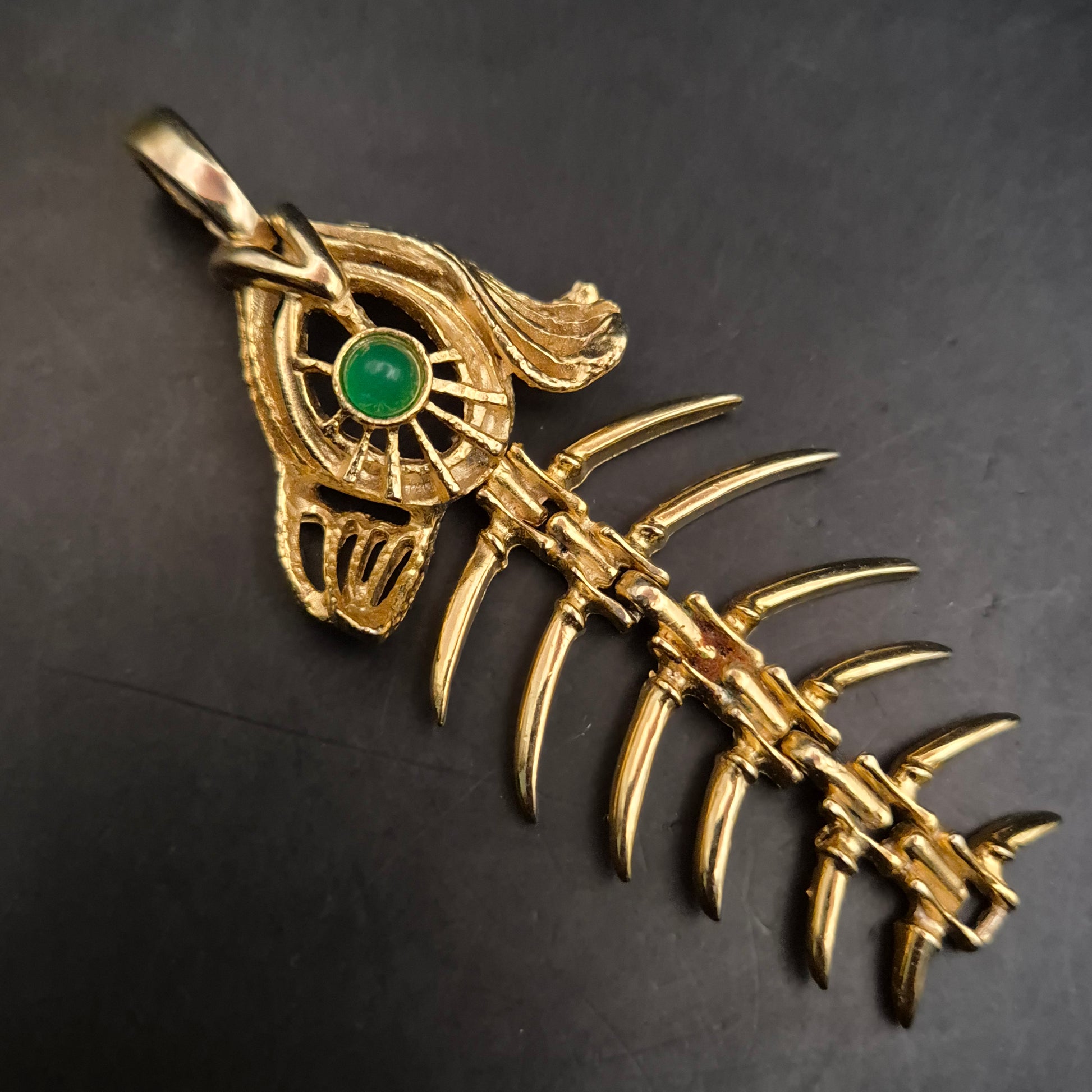 Ausgefallener Fischskelett Anhänger – Vergoldet mit grünem Stein