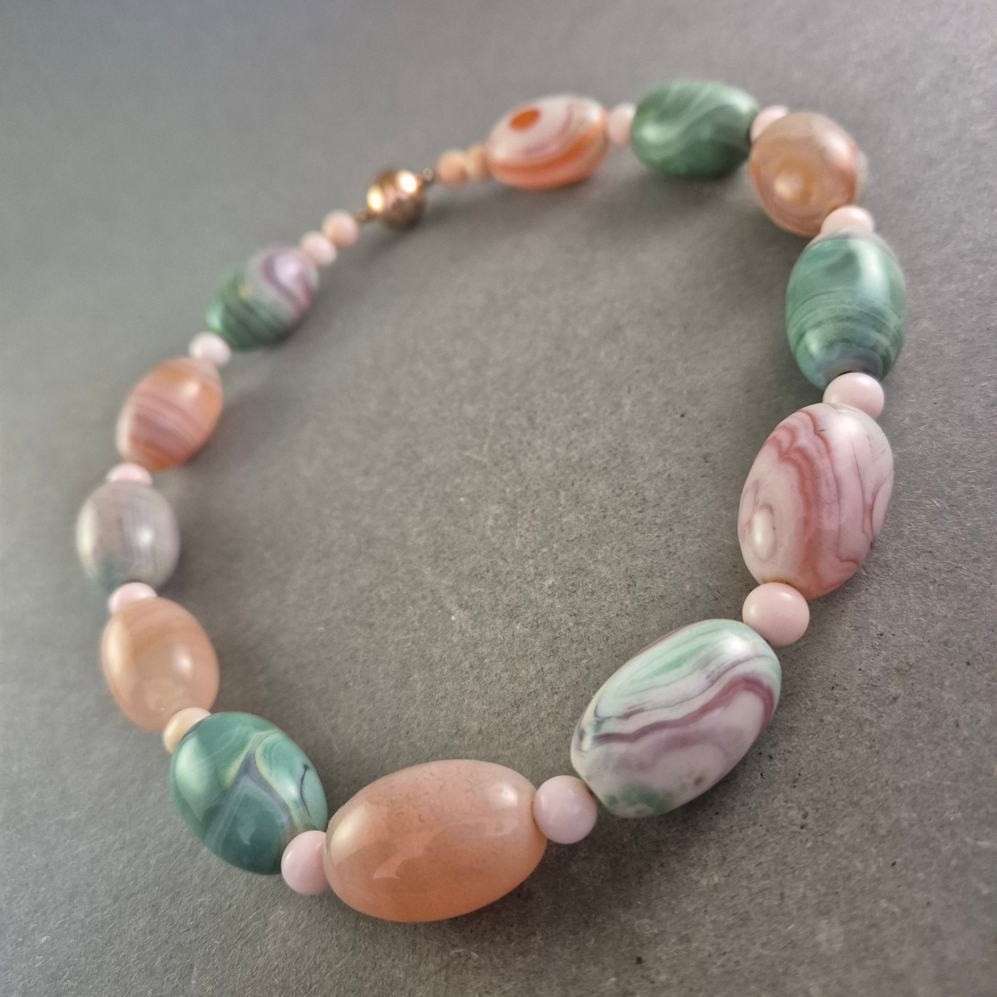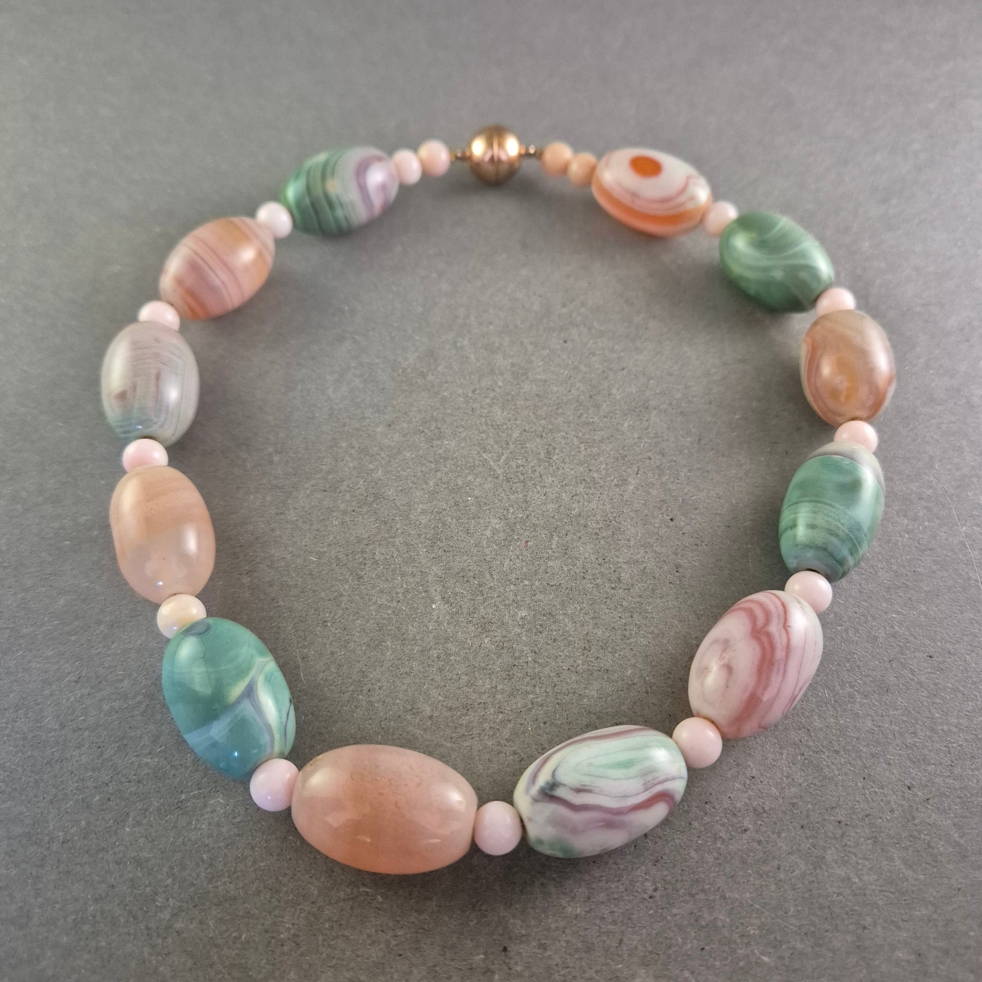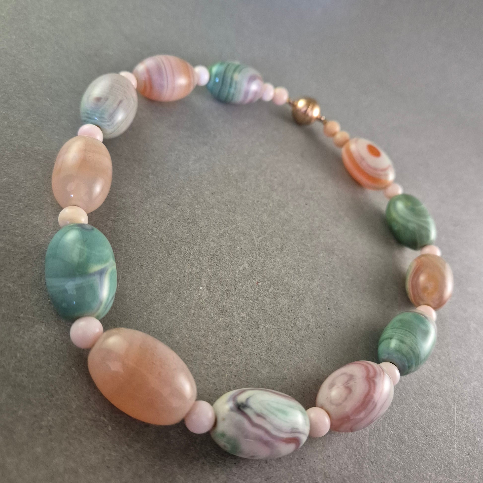 Diese elegante Halskette aus Australien besticht durch ihre harmonische Kombination aus pastellfarbenen Schmucksteinen in Grün-, Rosa- und Pfirsichtönen. Die hochwertigen, oval geschliffenen Perlen sind aufwendig verarbeitet und werden von zarten Zwischenperlen ergänzt. Der vergoldete Schraubverschluss mit Prägung „Langes Austria Ag 925“ unterstreicht die Qualität und Herkunft des Stücks.