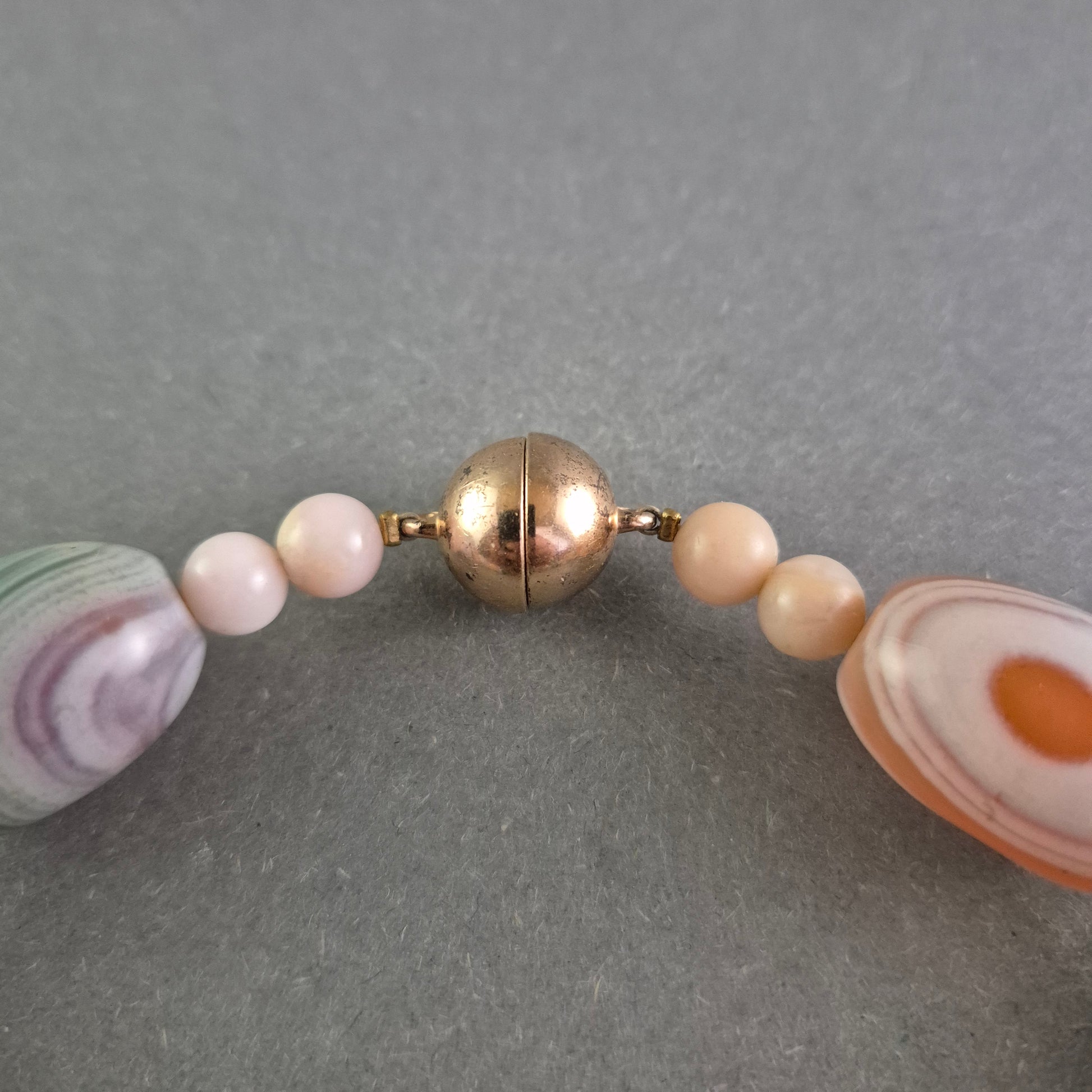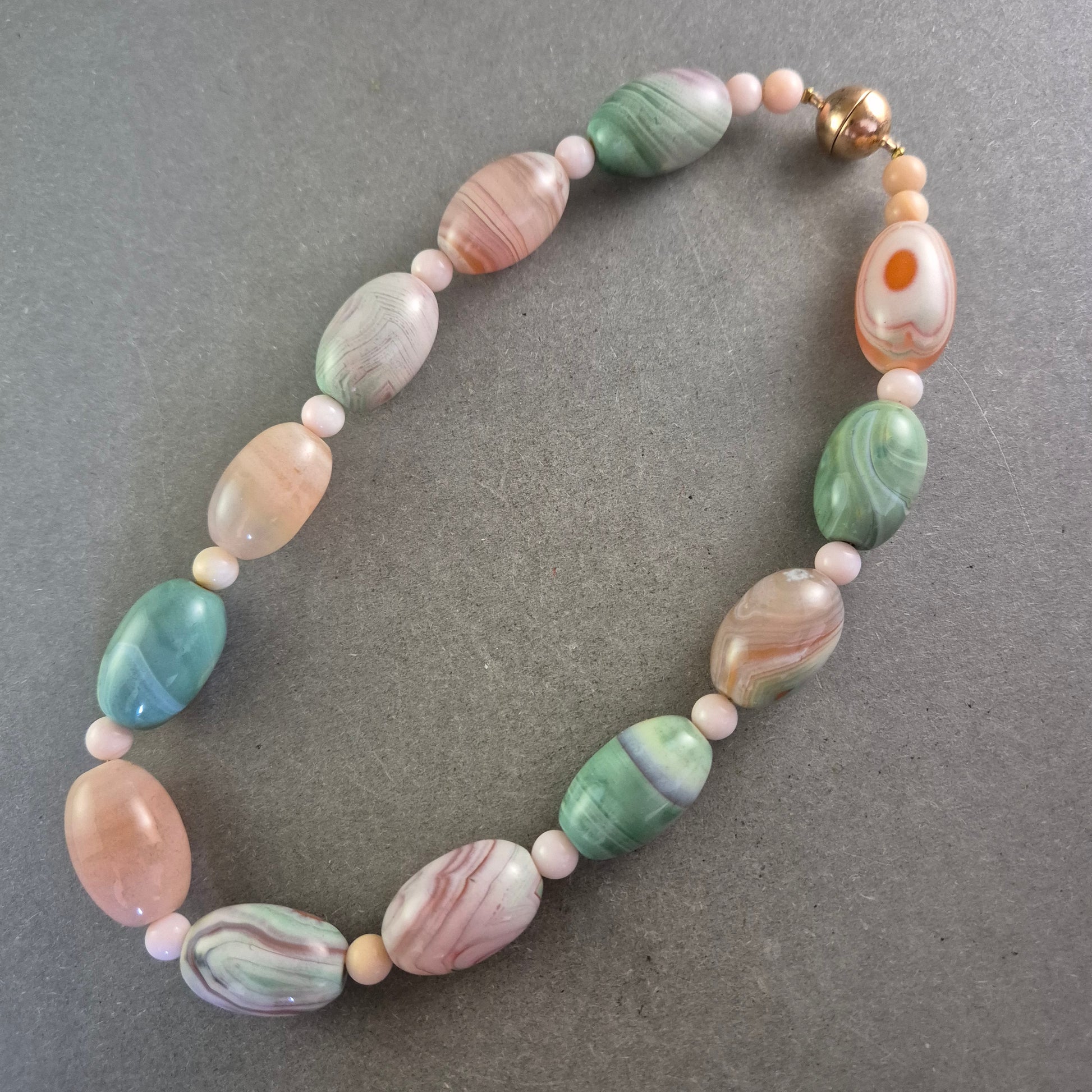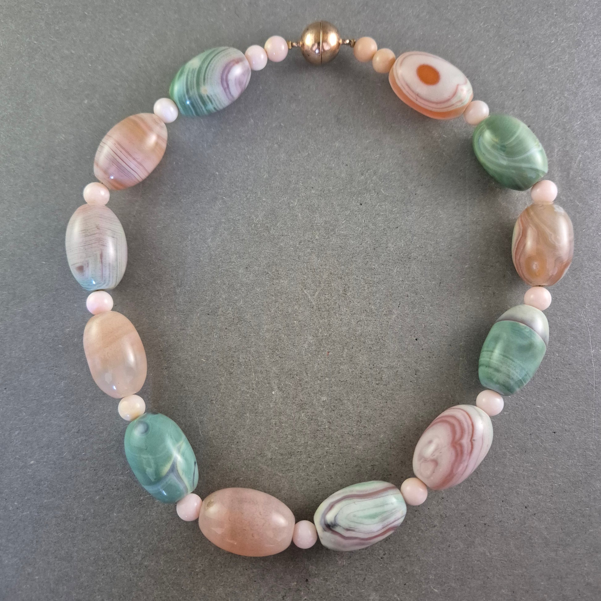 Diese elegante Halskette aus Australien besticht durch ihre harmonische Kombination aus pastellfarbenen Schmucksteinen in Grün-, Rosa- und Pfirsichtönen. Die hochwertigen, oval geschliffenen Perlen sind aufwendig verarbeitet und werden von zarten Zwischenperlen ergänzt. Der vergoldete Schraubverschluss mit Prägung „Langes Austria Ag 925“ unterstreicht die Qualität und Herkunft des Stücks.