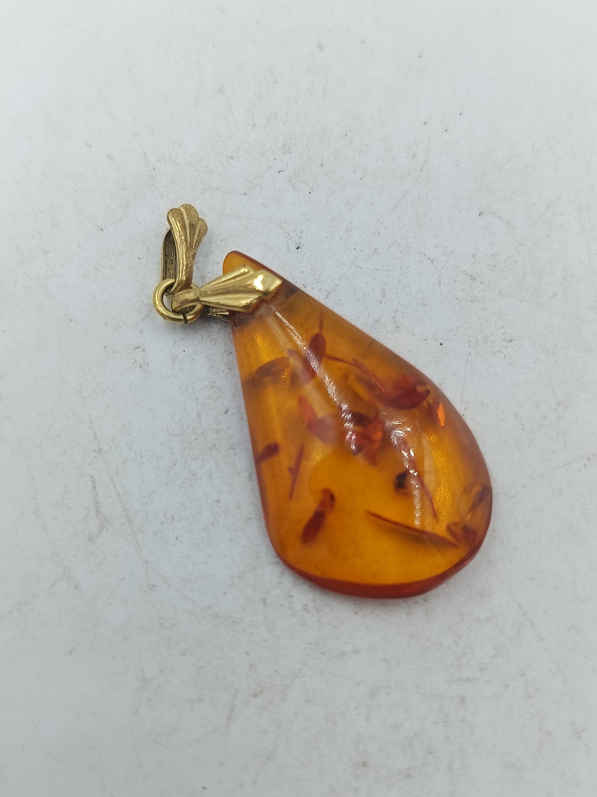 Bernsteinanhaenger in Tropfenform mit warmem Honigton und eleganter goldfarbener Oese