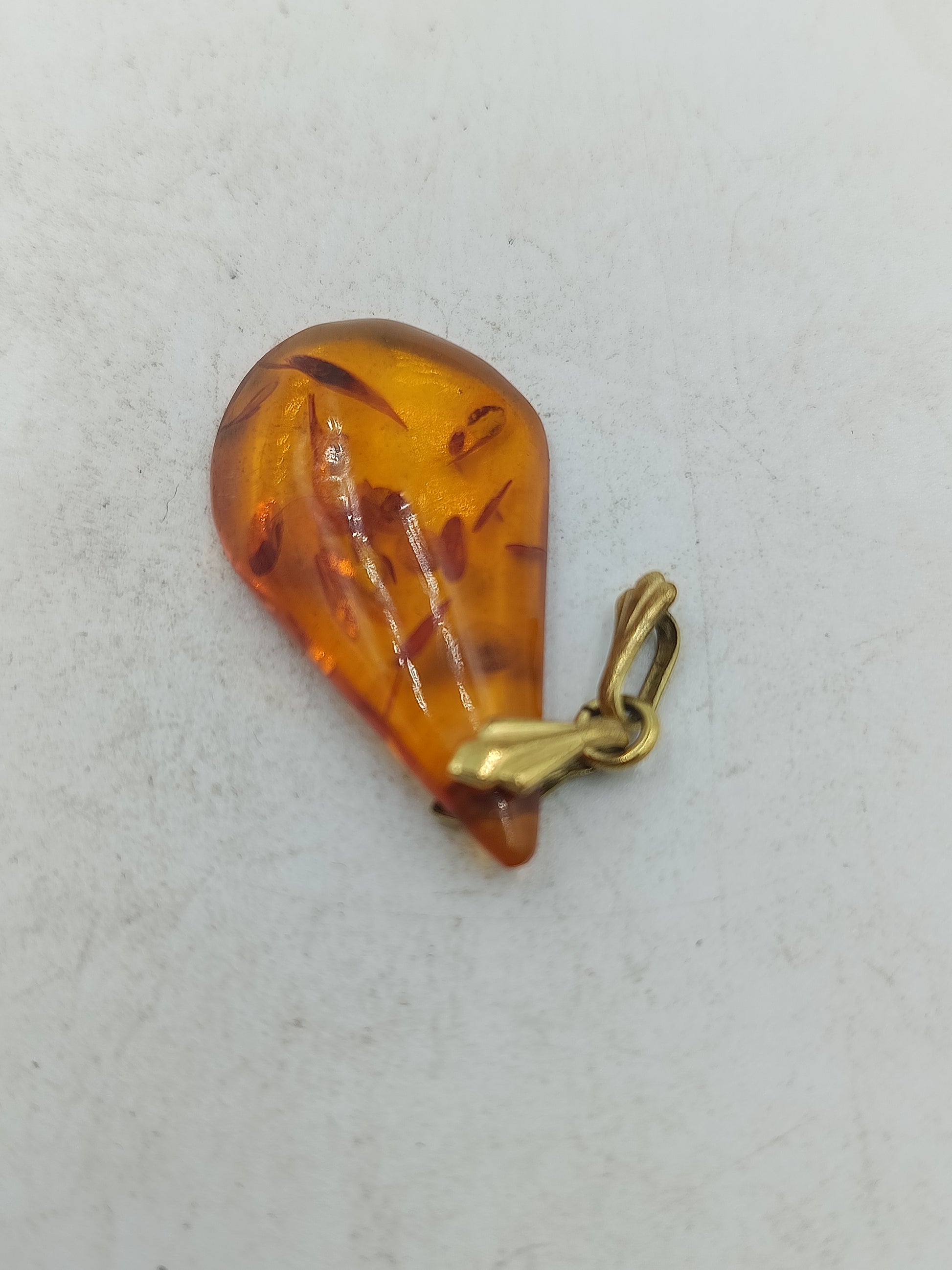 Dieser stilvolle Anhaenger zeigt einen glaenzenden bernsteinfarbenen Tropfen mit natuerlichen Einschluesen die dem Schmuckstueck eine besondere Tiefe und einen individuellen Charakter verleihen. Die weiche organische Form sorgt fuer ein angenehmes Tragegefuehl waehrend die goldfarbene Oese den Anhaenger sicher an jeder Kette haelt und einen edlen Akzent setzt.