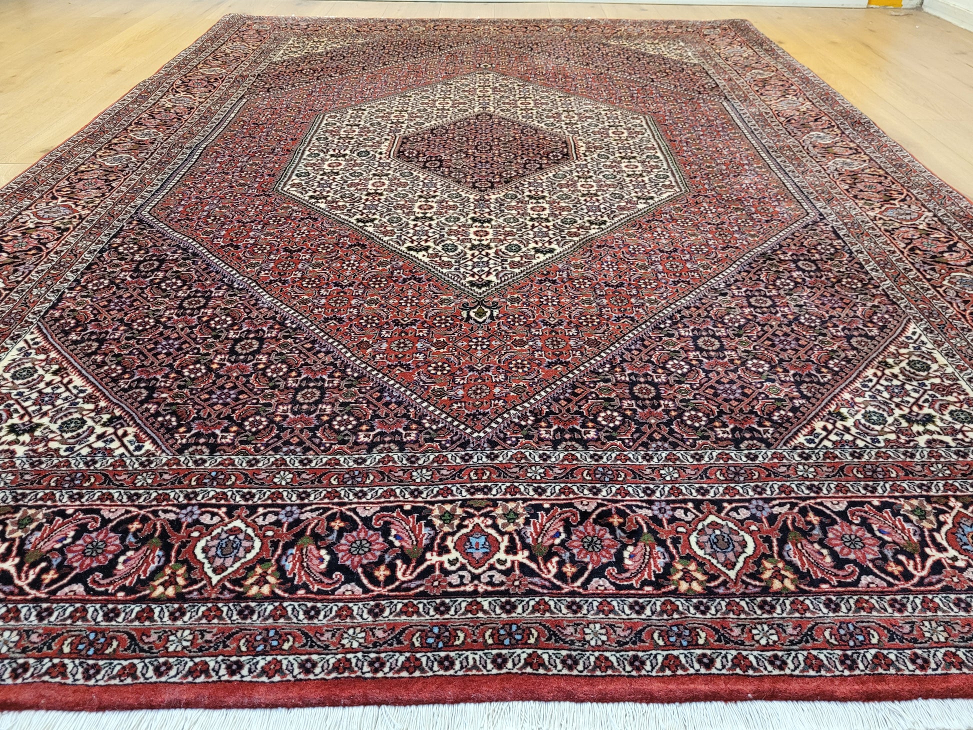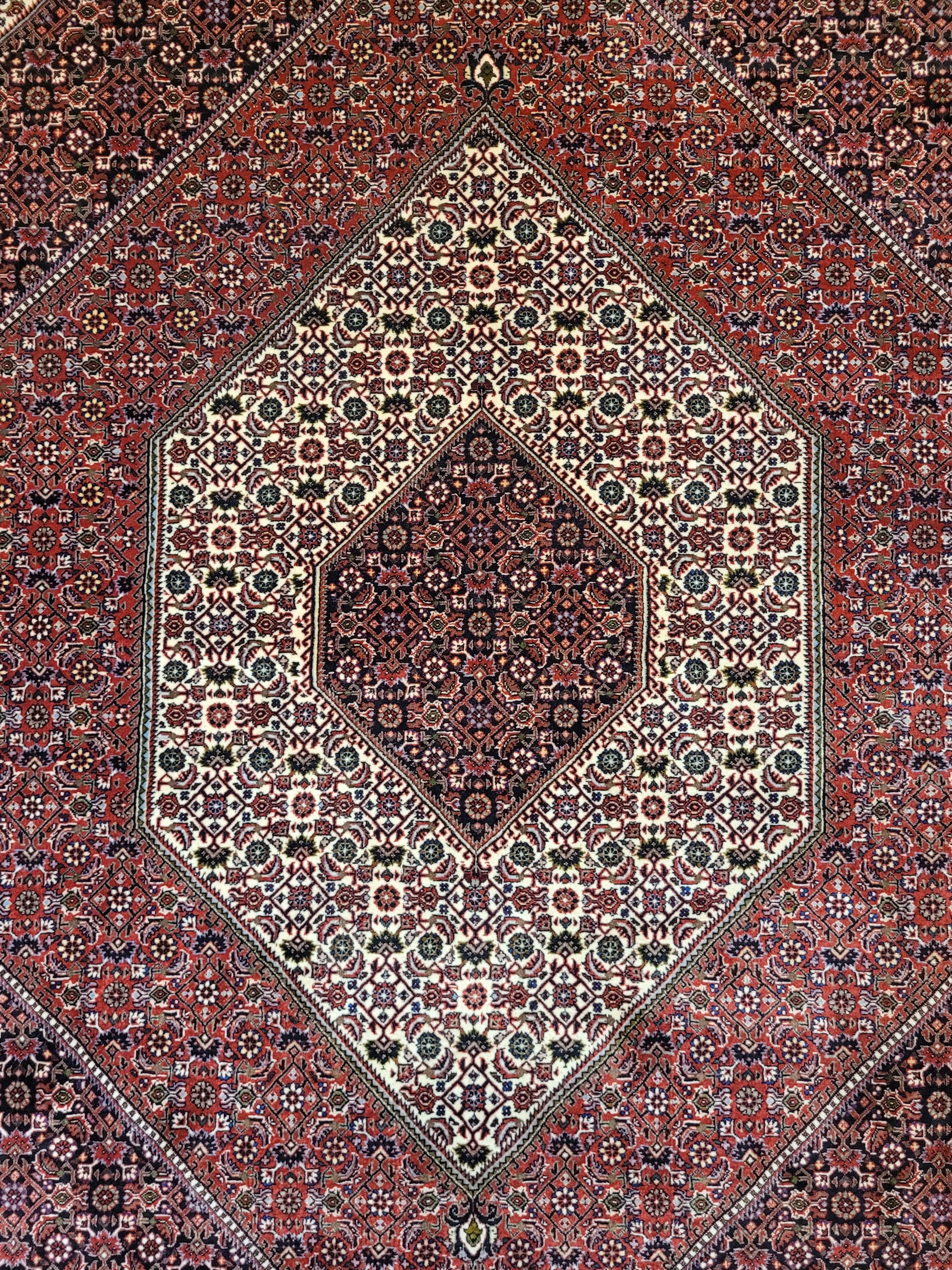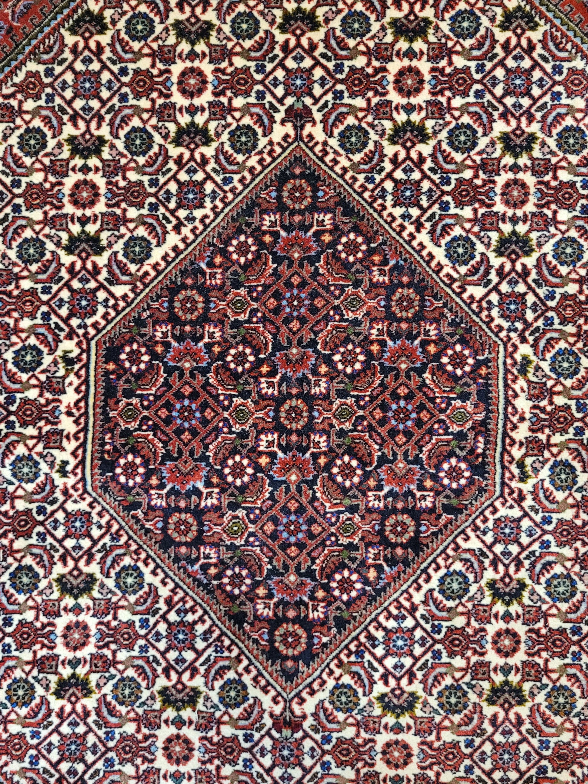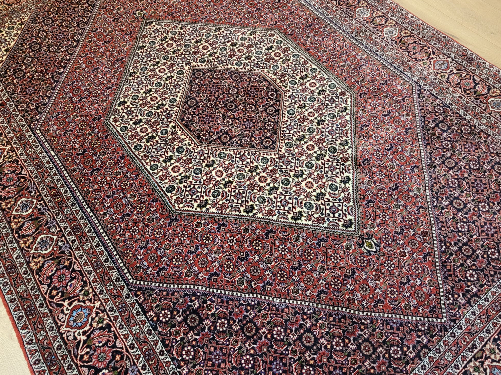 angeboten wird ein edler Bidjar Teppich aus feiner Korkwolle, handgeknüpft in dichter und strapazierfähiger Knüpfung. Das Design zeigt ein markantes, achteckiges Medaillon im Zentrum, eingerahmt von detailreichen Feldern mit filigranen Blütenmustern. Der tiefe Rotgrund wird harmonisch durch Elfenbein- und Dunkelblau-Töne ergänzt und verleiht dem Teppich eine außergewöhnliche Ausstrahlung.