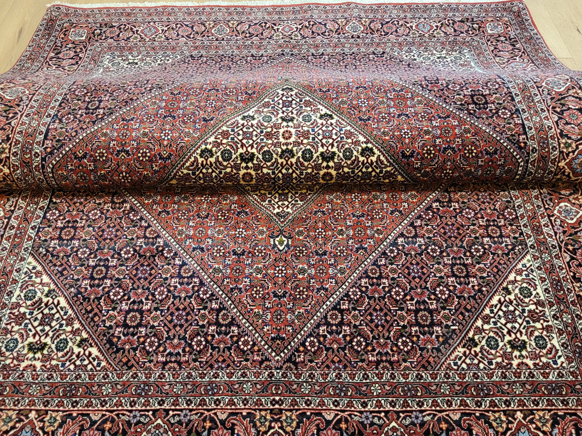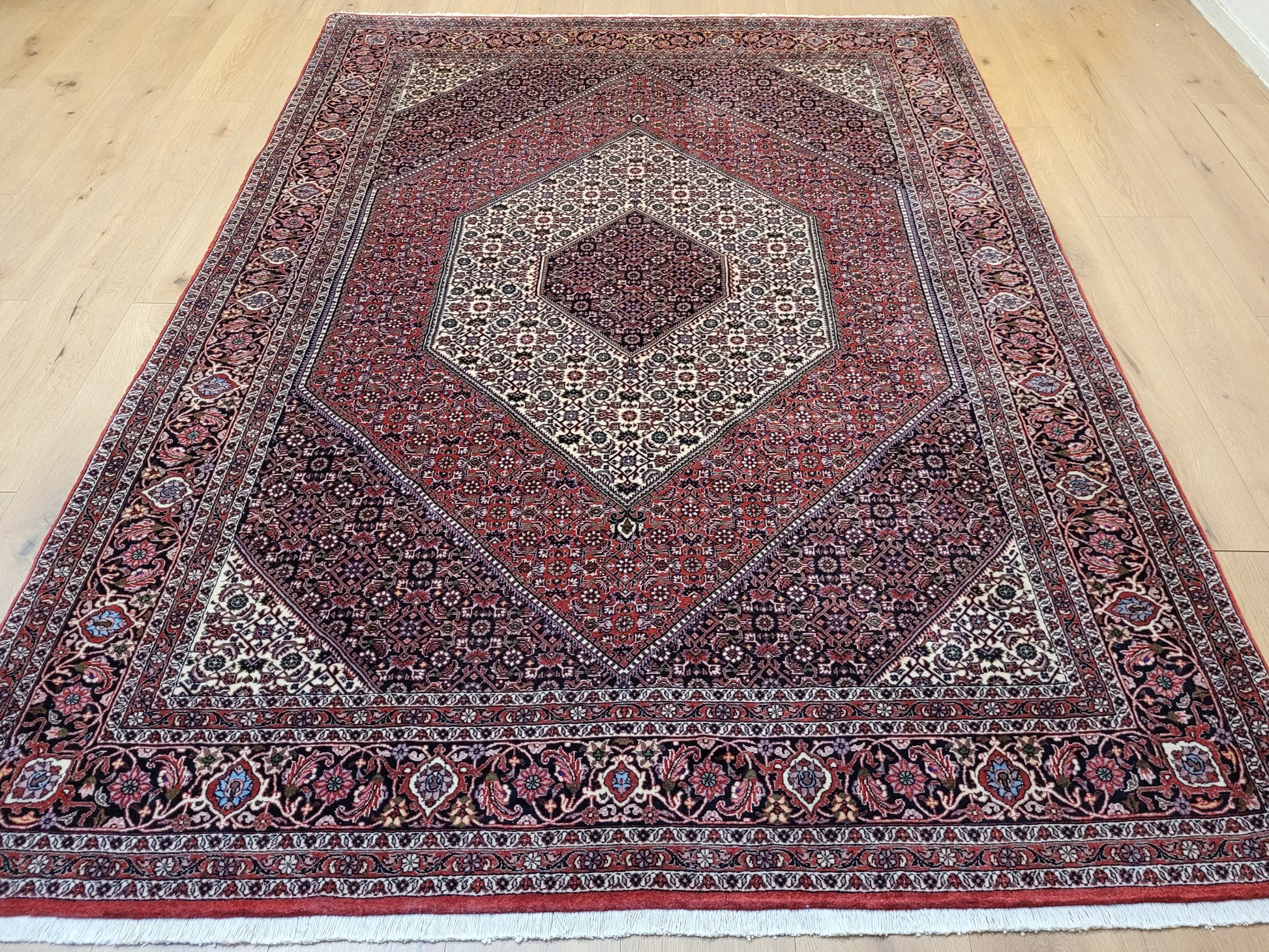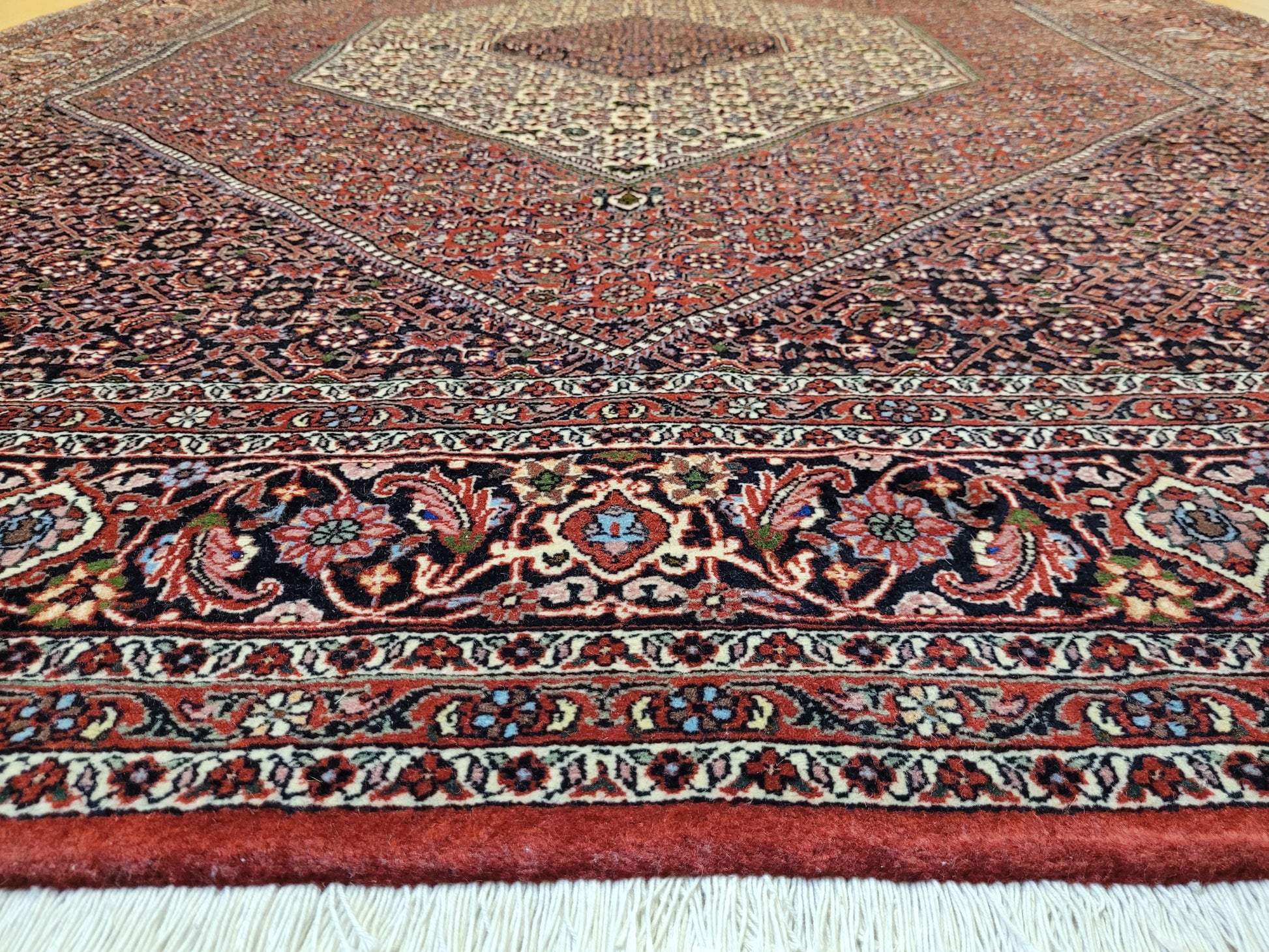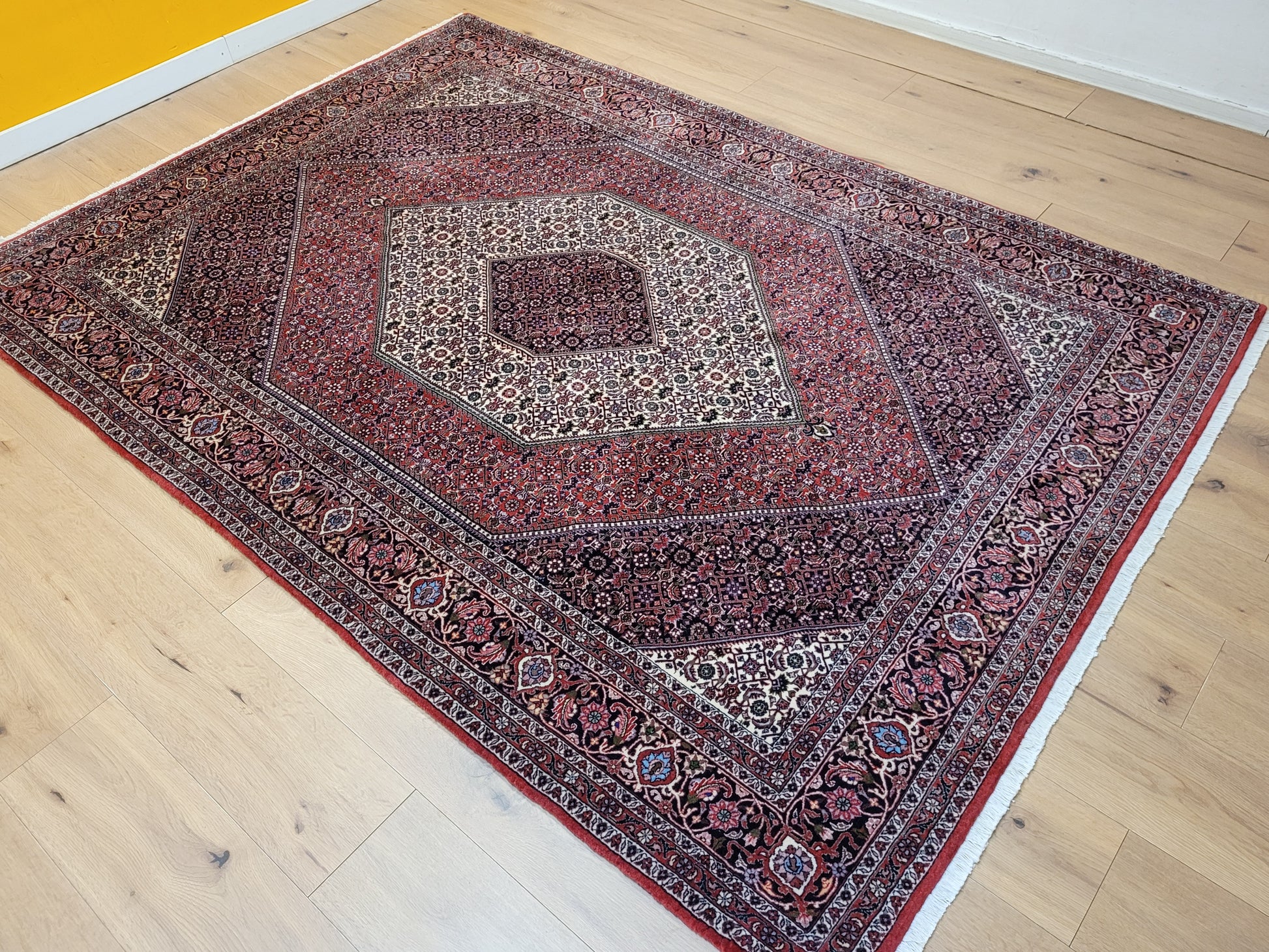angeboten wird ein edler Bidjar Teppich aus feiner Korkwolle, handgeknüpft in dichter und strapazierfähiger Knüpfung. Das Design zeigt ein markantes, achteckiges Medaillon im Zentrum, eingerahmt von detailreichen Feldern mit filigranen Blütenmustern. Der tiefe Rotgrund wird harmonisch durch Elfenbein- und Dunkelblau-Töne ergänzt und verleiht dem Teppich eine außergewöhnliche Ausstrahlung.