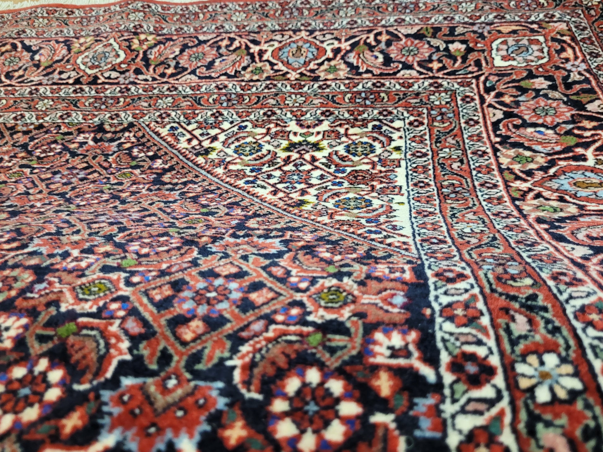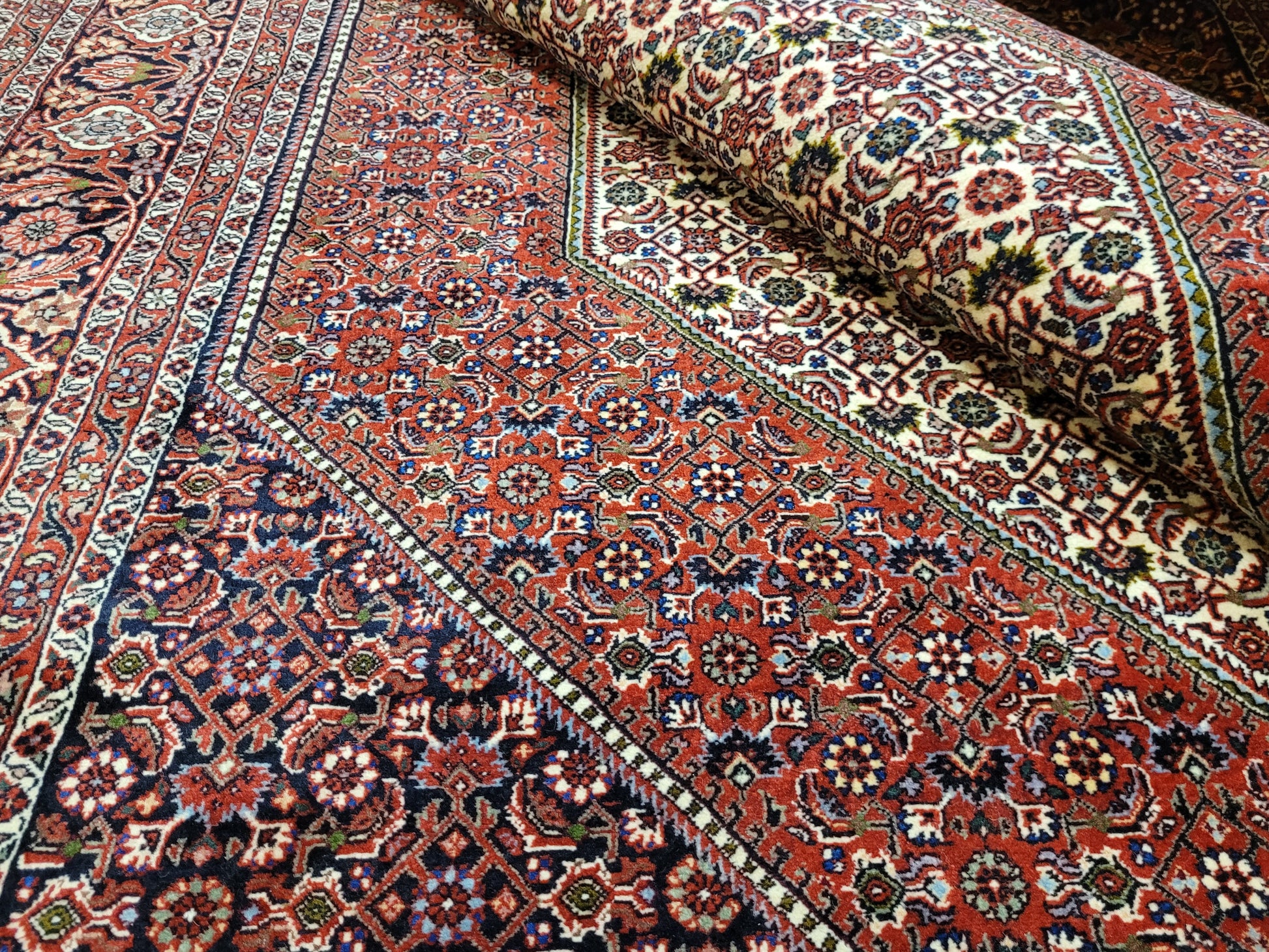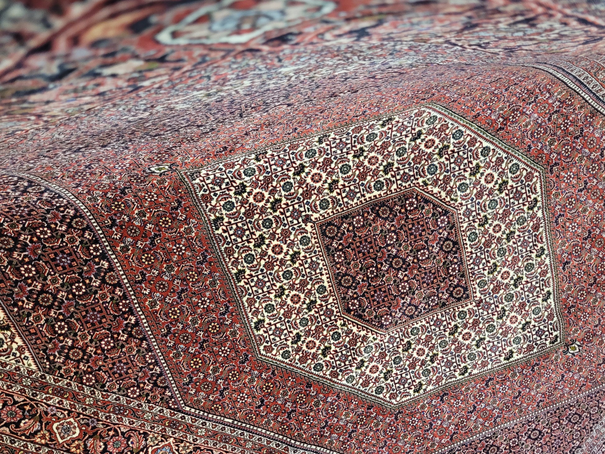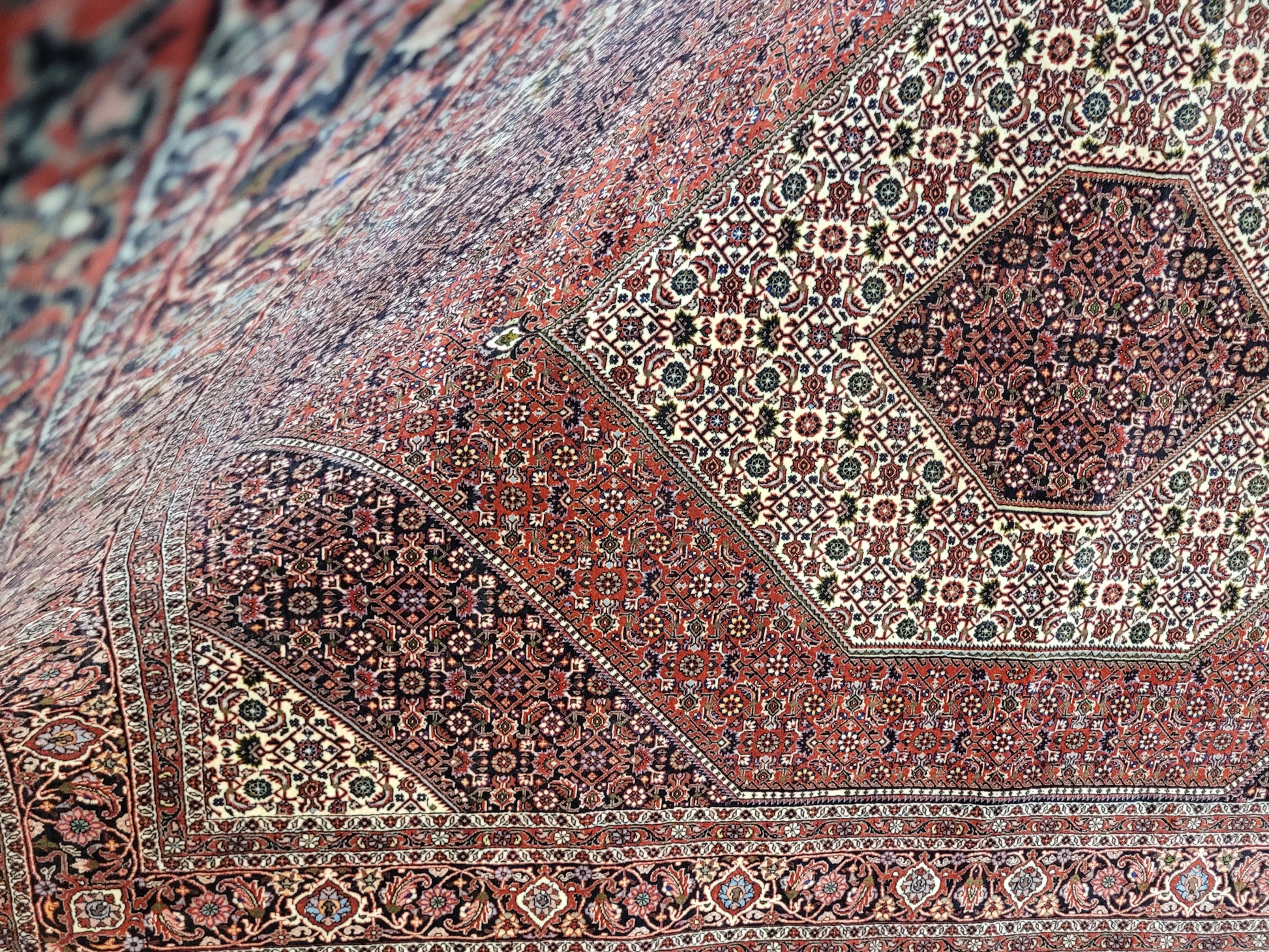 angeboten wird ein edler Bidjar Teppich aus feiner Korkwolle, handgeknüpft in dichter und strapazierfähiger Knüpfung. Das Design zeigt ein markantes, achteckiges Medaillon im Zentrum, eingerahmt von detailreichen Feldern mit filigranen Blütenmustern. Der tiefe Rotgrund wird harmonisch durch Elfenbein- und Dunkelblau-Töne ergänzt und verleiht dem Teppich eine außergewöhnliche Ausstrahlung.