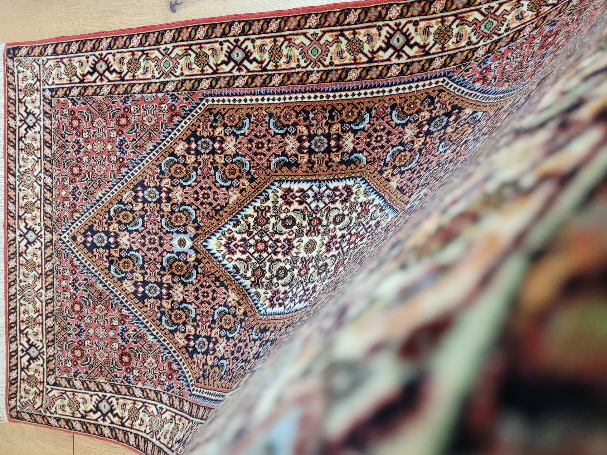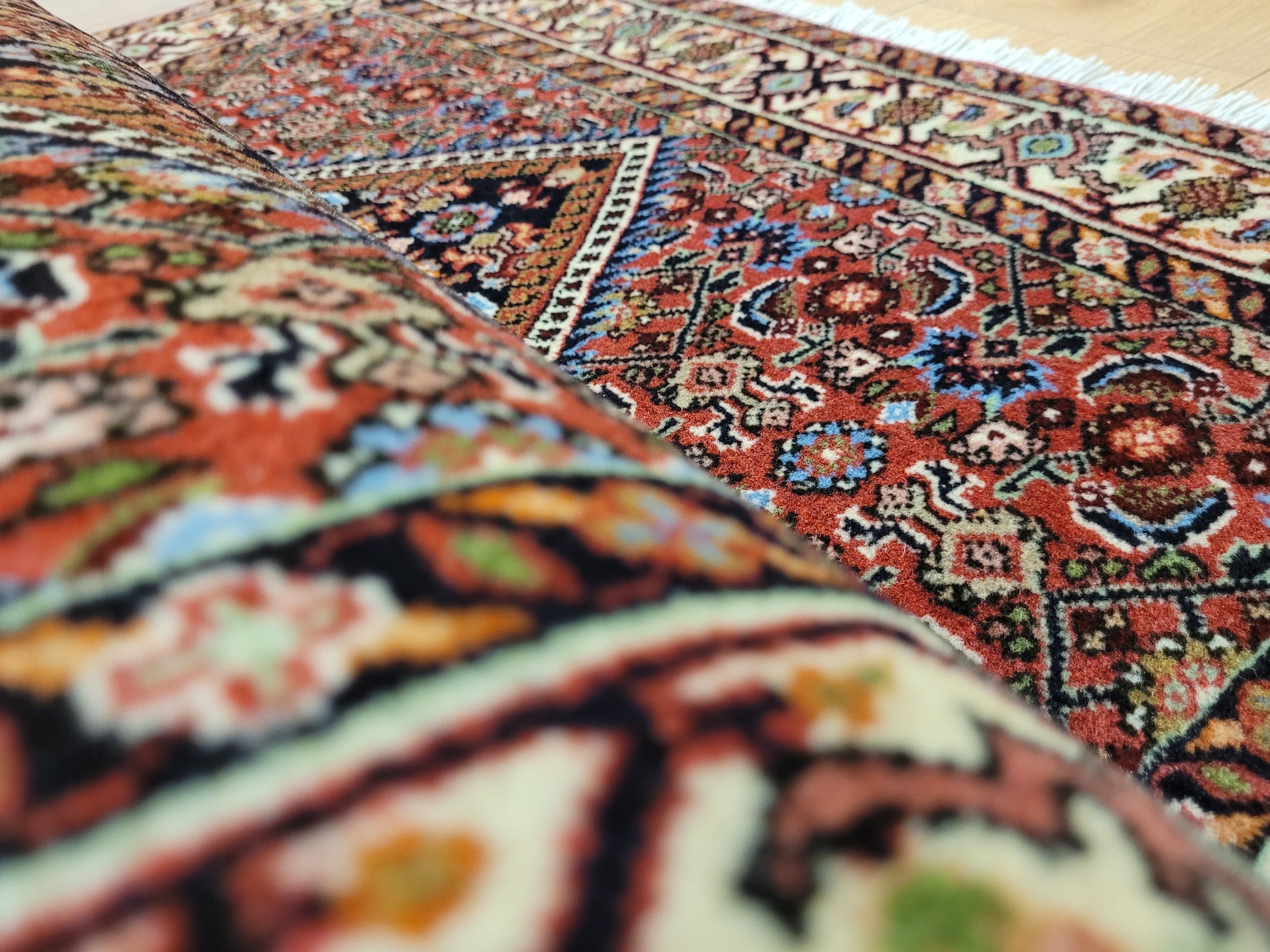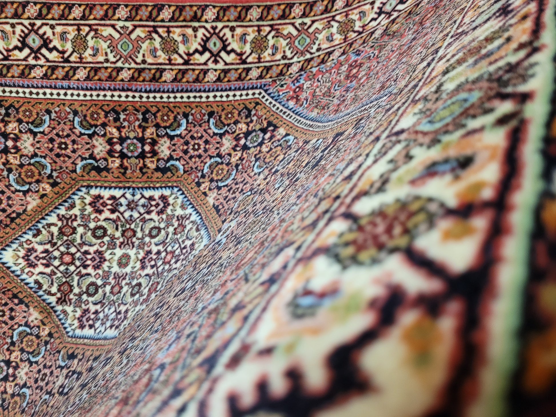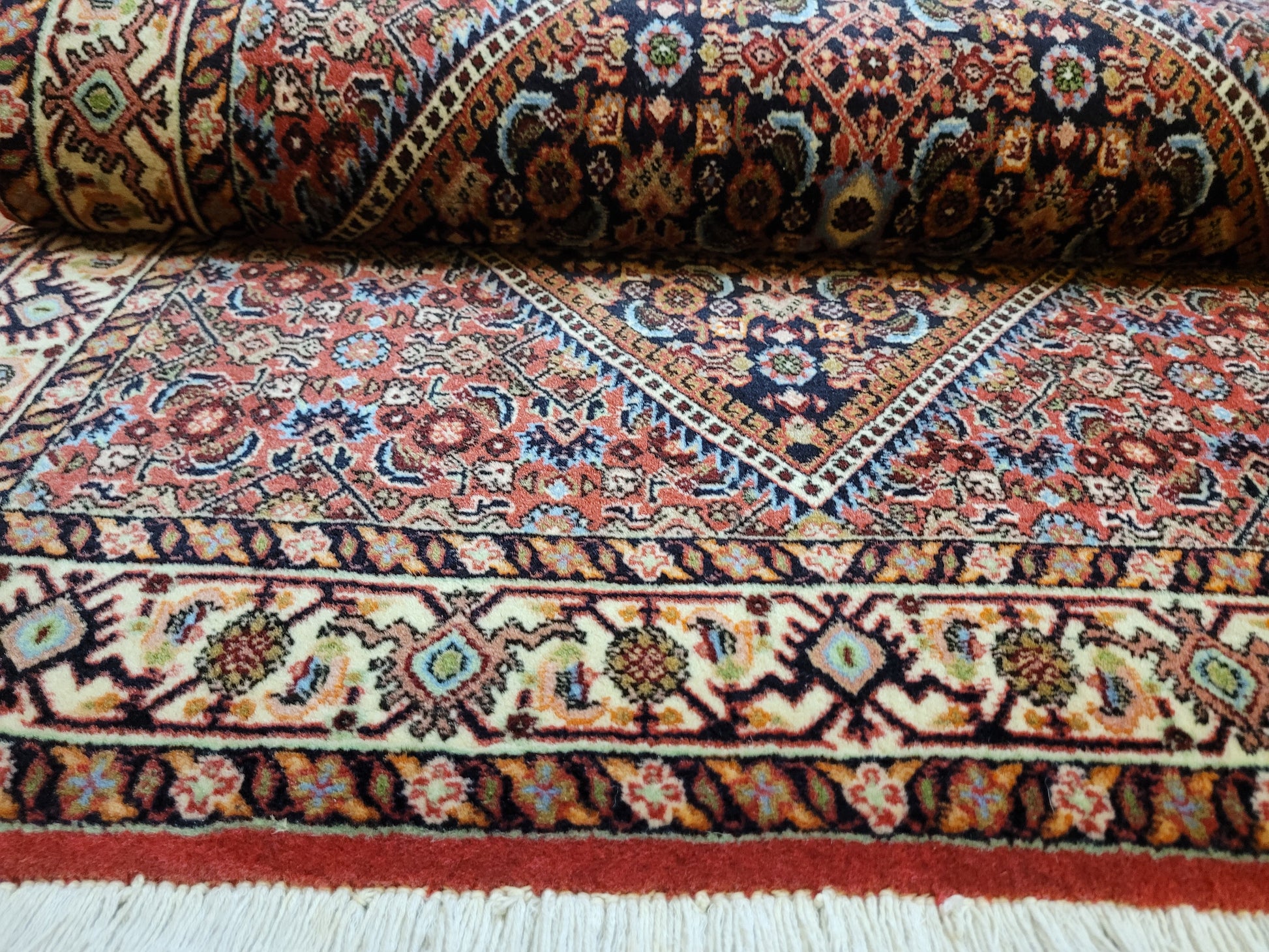 angeboten wird ein edler Bidjar Teppich aus feiner Korkwolle, handgeknüpft in detailreicher Ausführung. Das Design zeigt ein großes sechseckiges Zentralmedaillon, umgeben von dicht gearbeiteten Blütenranken und ornamentalen Mustern, die dem Teppich seine charakteristische Tiefe und Ausdrucksstärke verleihen. Die harmonische Farbkomposition unterstreicht die besondere Strahlkraft dieses Meisterstücks der Knüpfkunst.