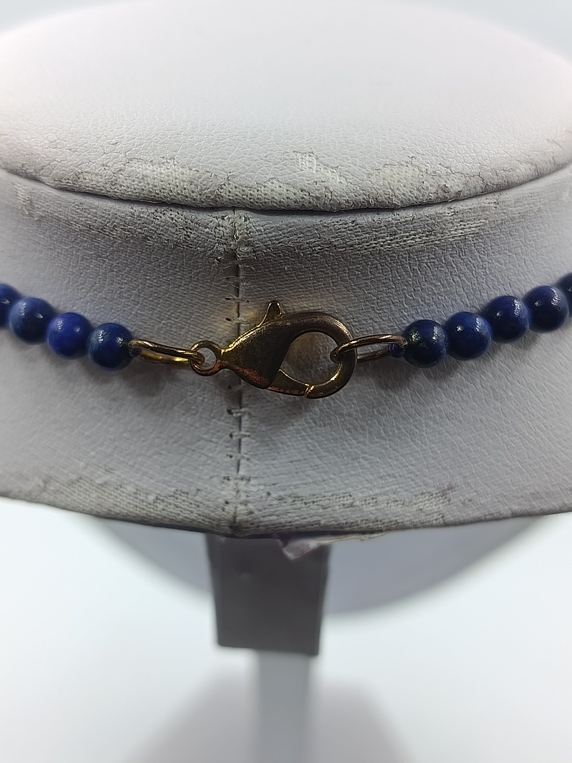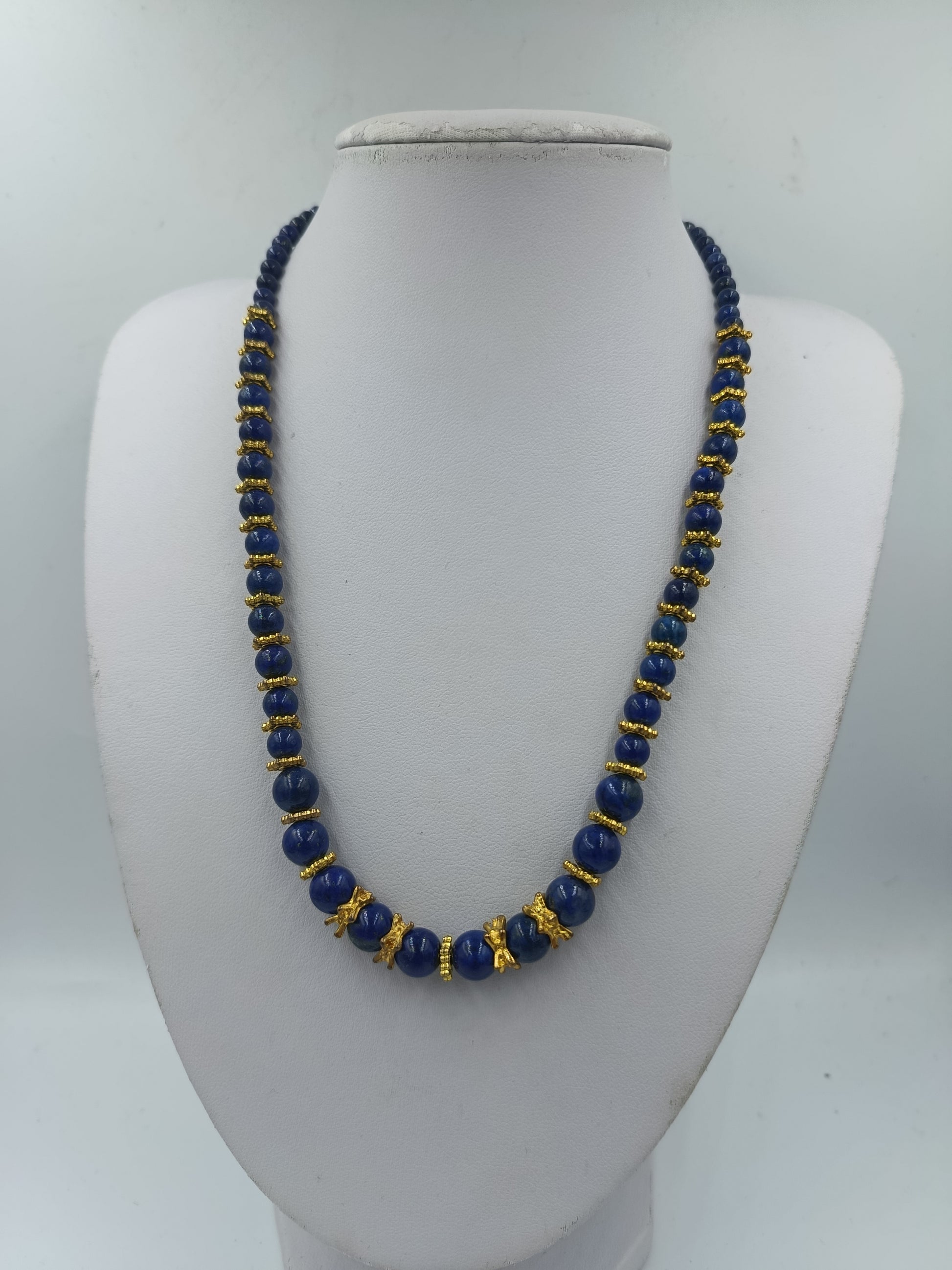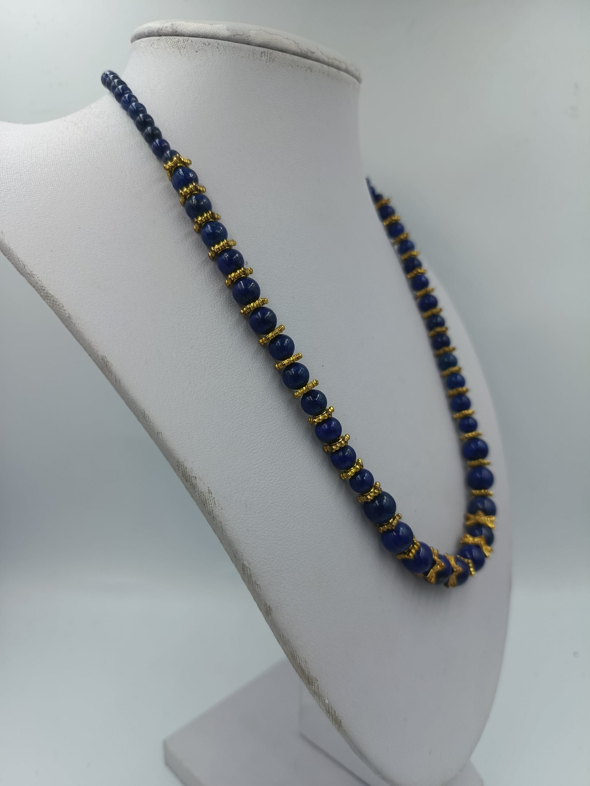 Blaue Perlenkette mit goldfarbenen Zierelementen und klassischem eleganten Look