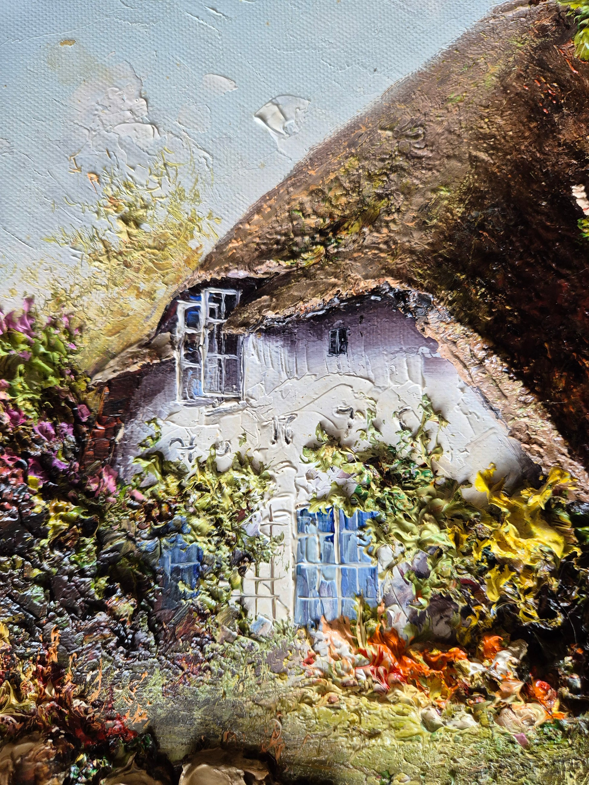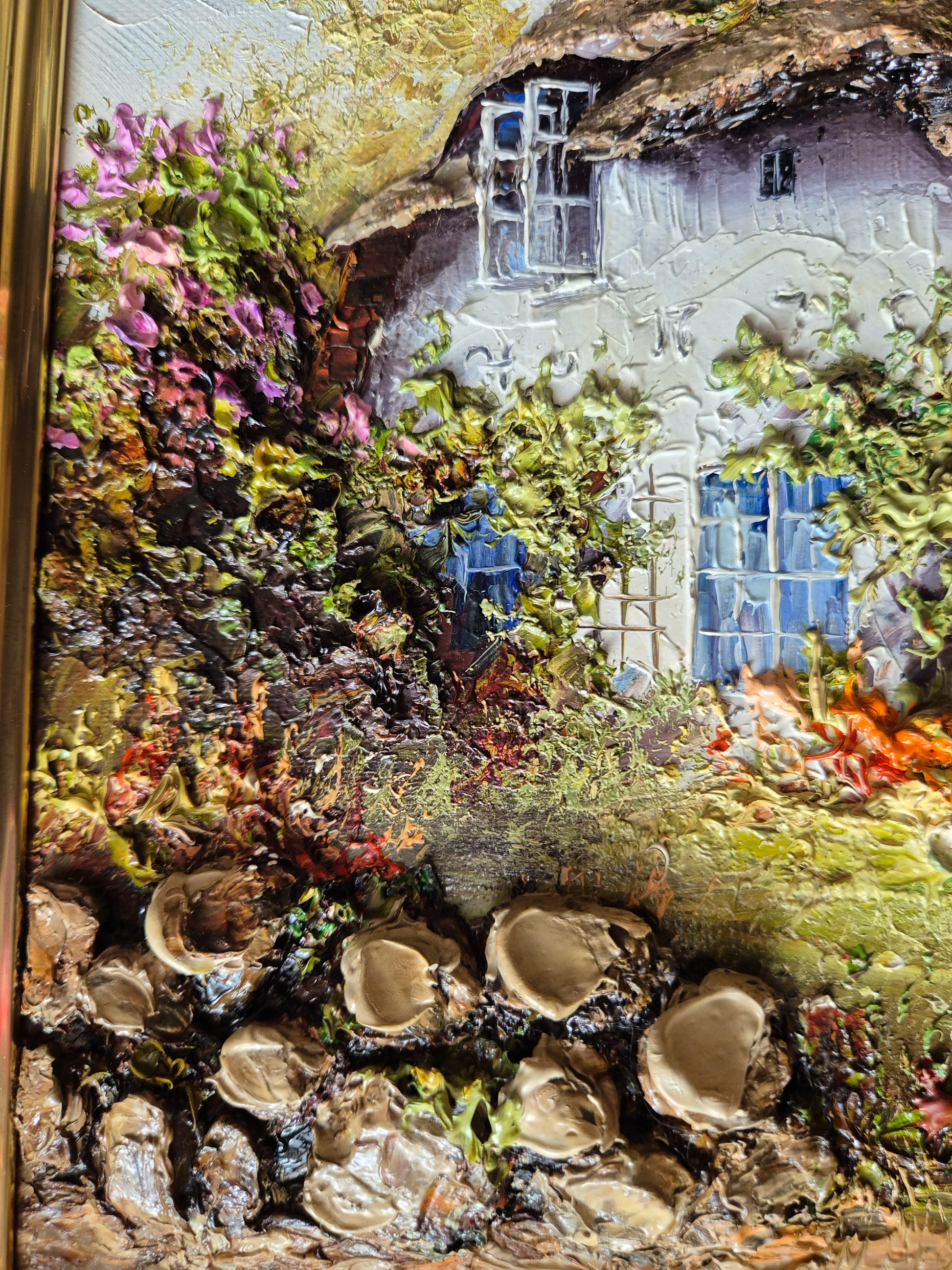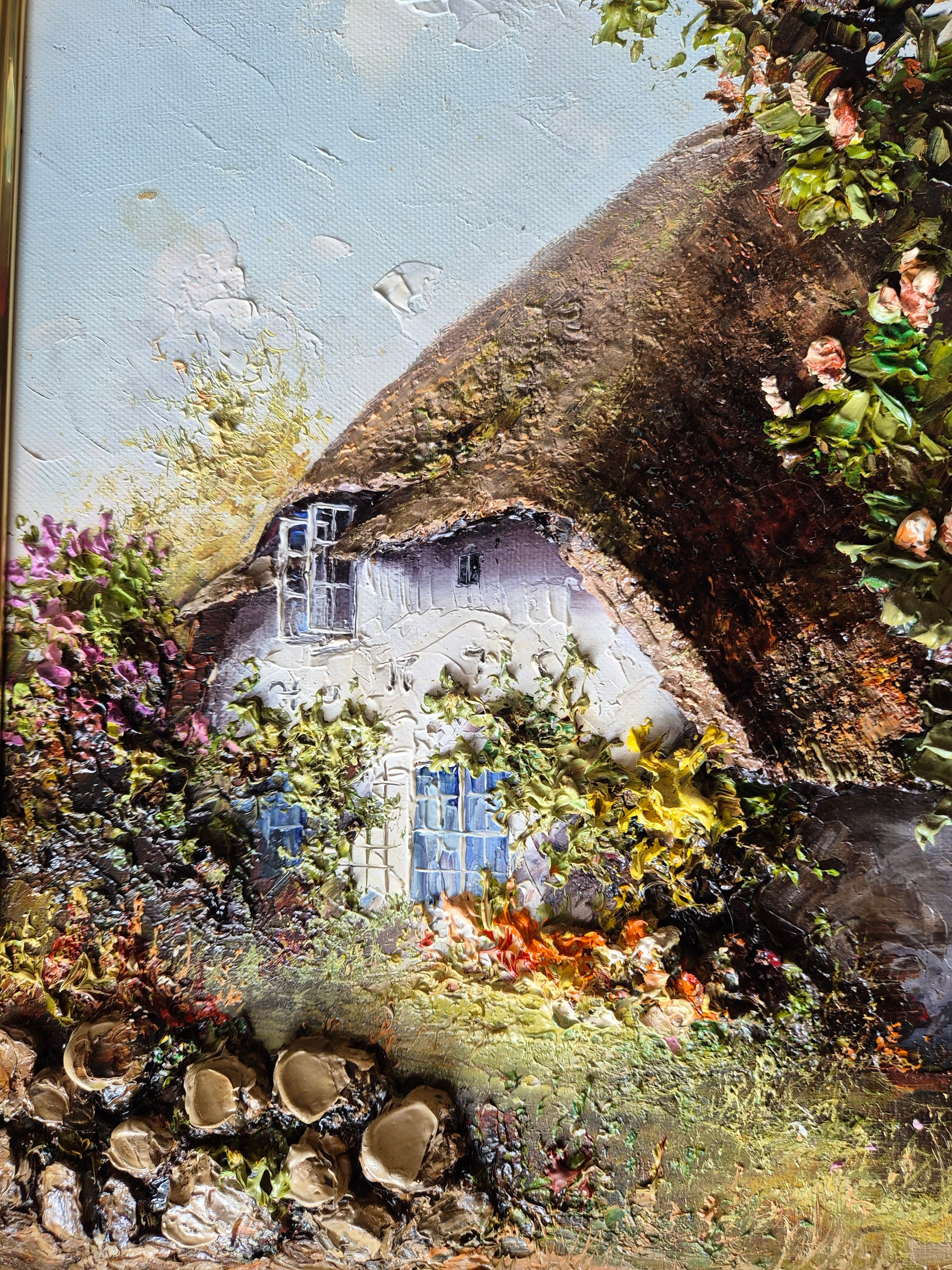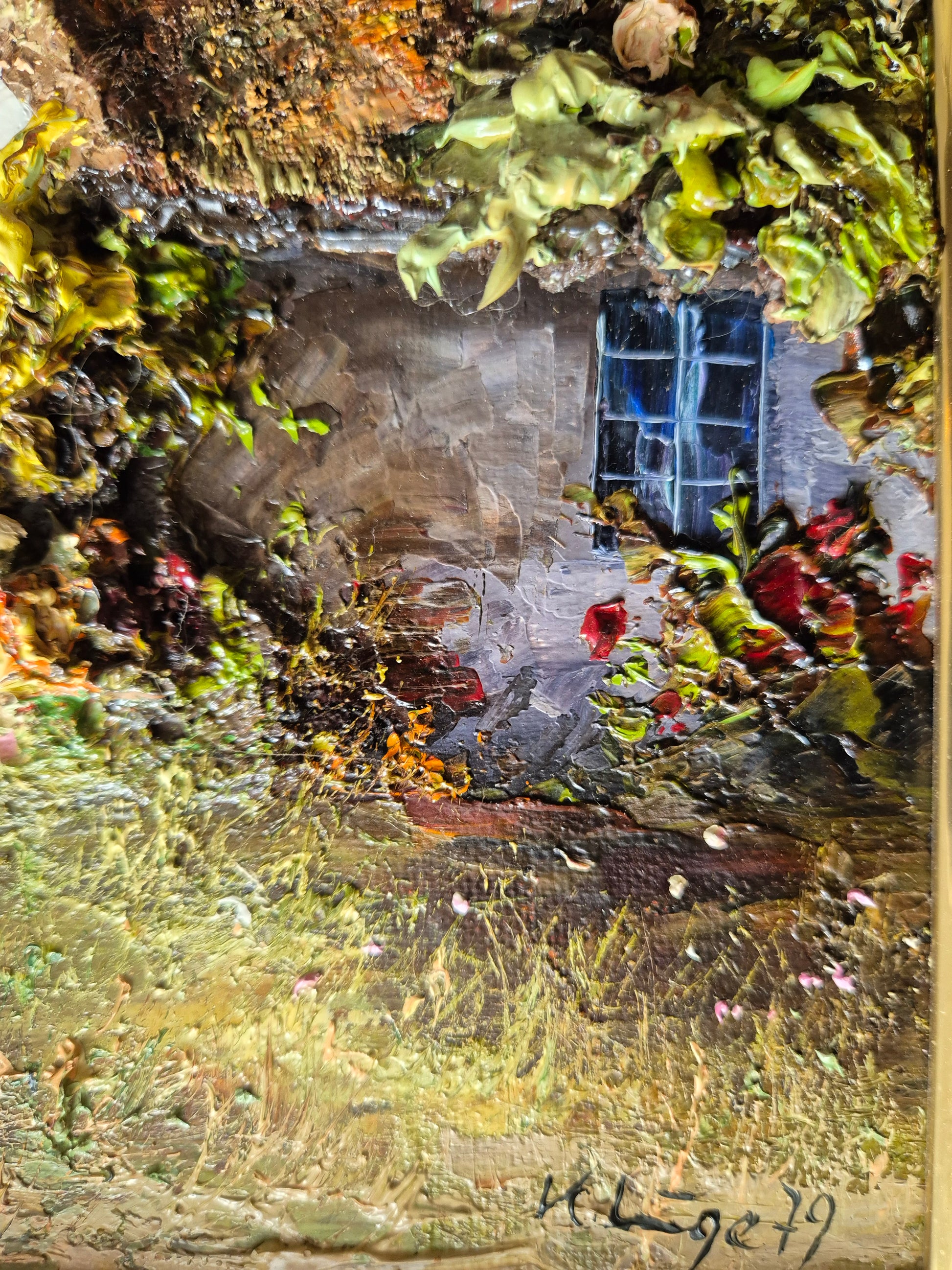 Herzlich willkommen, angeboten wird ein charmantes Ölgemälde von Kurt Kluge aus dem Jahr 1979. Das Werk zeigt ein traditionelles Sylter Reetdachhaus, umgeben von einem farbenfrohen Garten voller Blumen. Mit liebevollem Blick für Details und kräftigen Farben vermittelt das Bild die heitere und idyllische Atmosphäre der norddeutschen Küstenlandschaft.