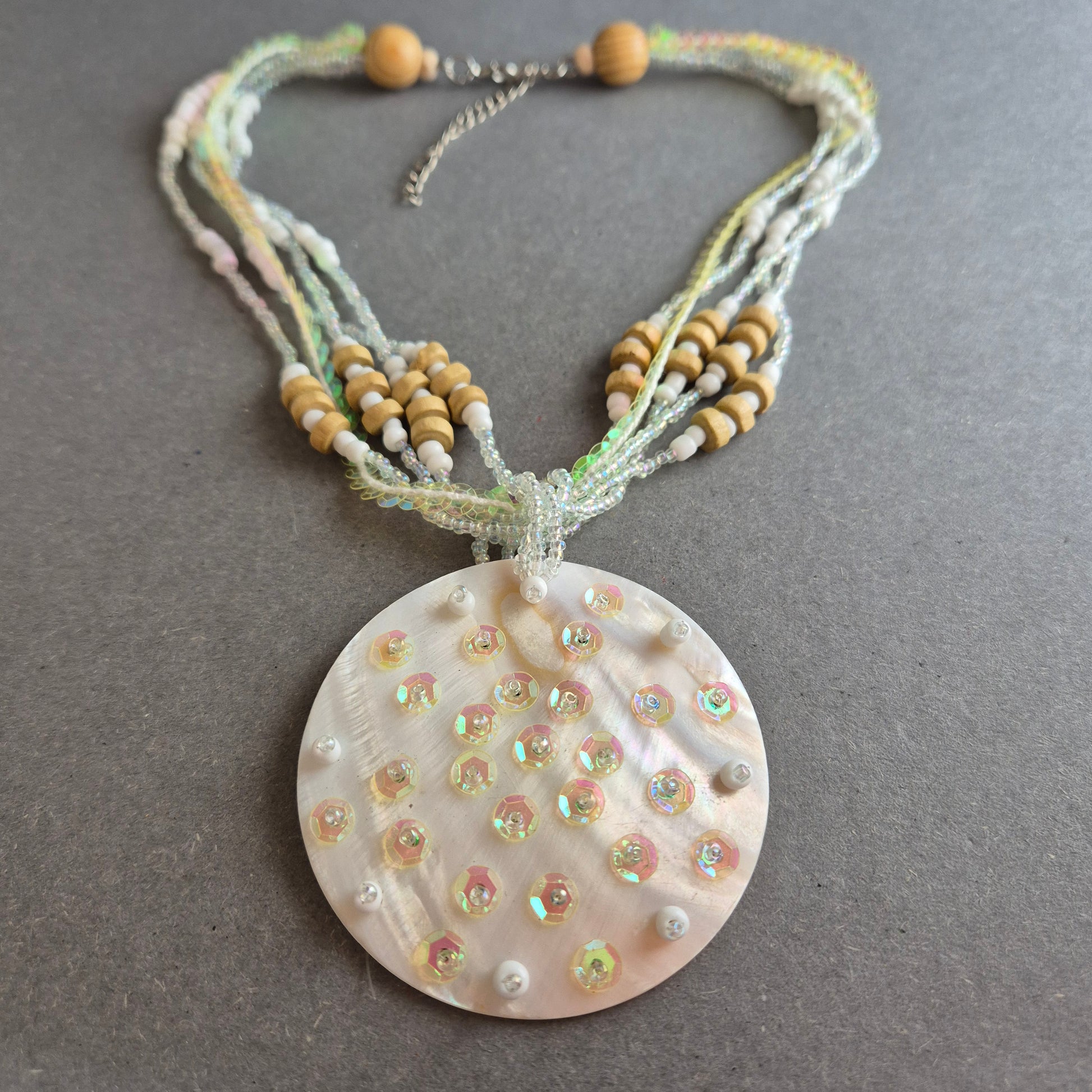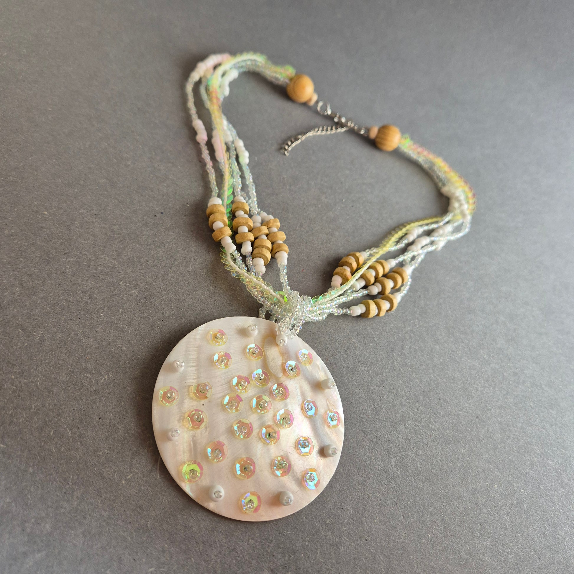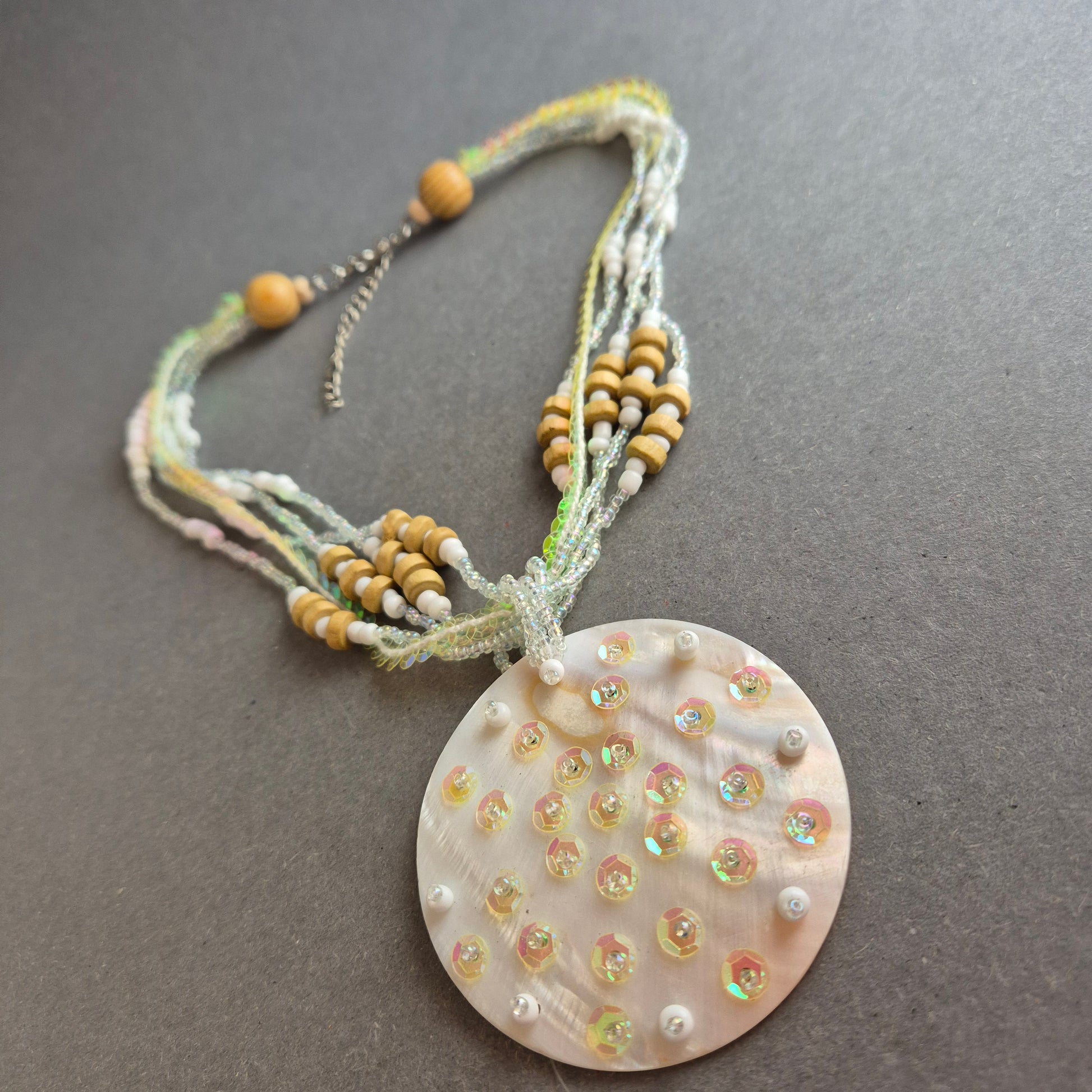 Diese verspielte Boho-Kette vereint natürliche Materialien mit schimmernden Akzenten. Mehrere Stränge aus irisierenden Glasperlen und Holzperlen münden in einen großen, runden Anhänger aus Perlmuttoptik, verziert mit glitzernden Pailletten. Die Kombination aus Naturtönen und sanftem Glanz macht diese Kette zum perfekten Accessoire für sommerliche Outfits, Festival-Looks oder Strandtage.