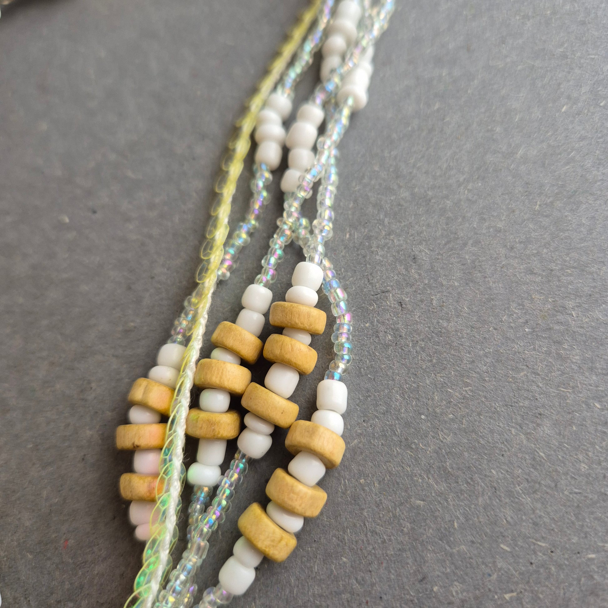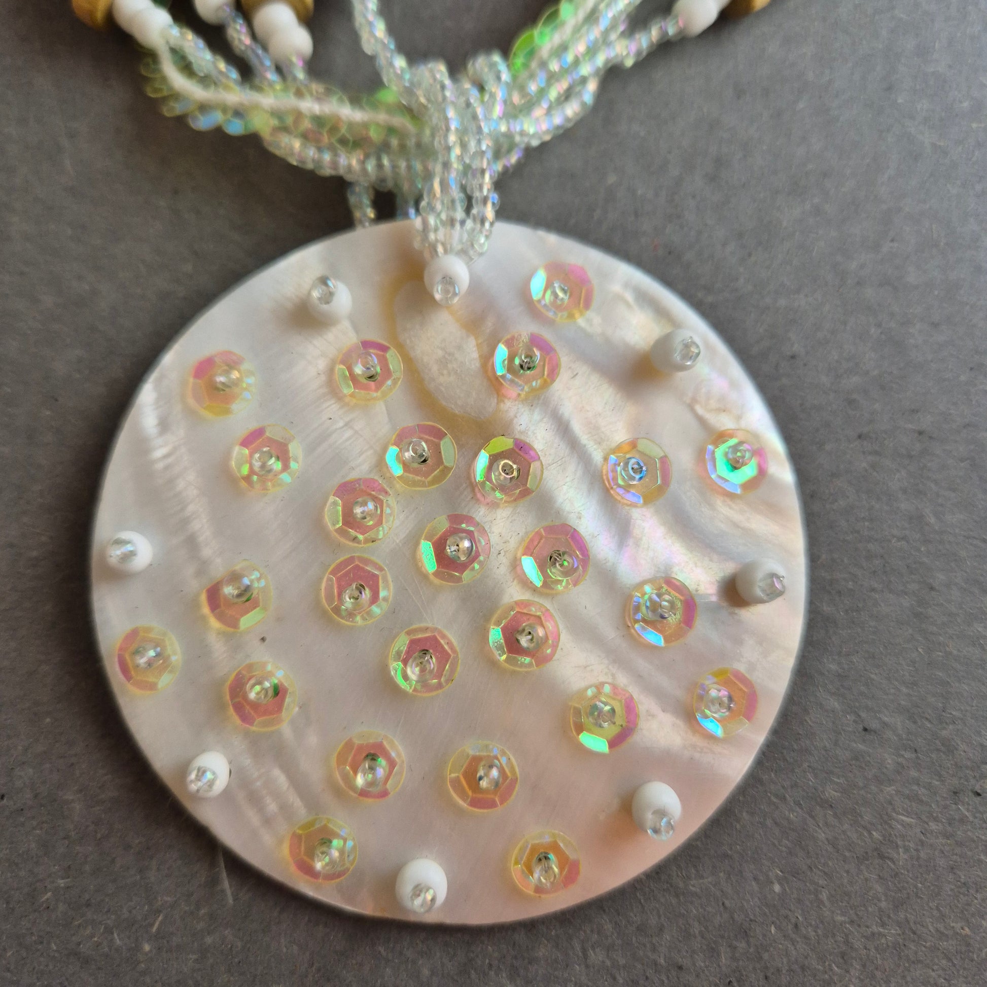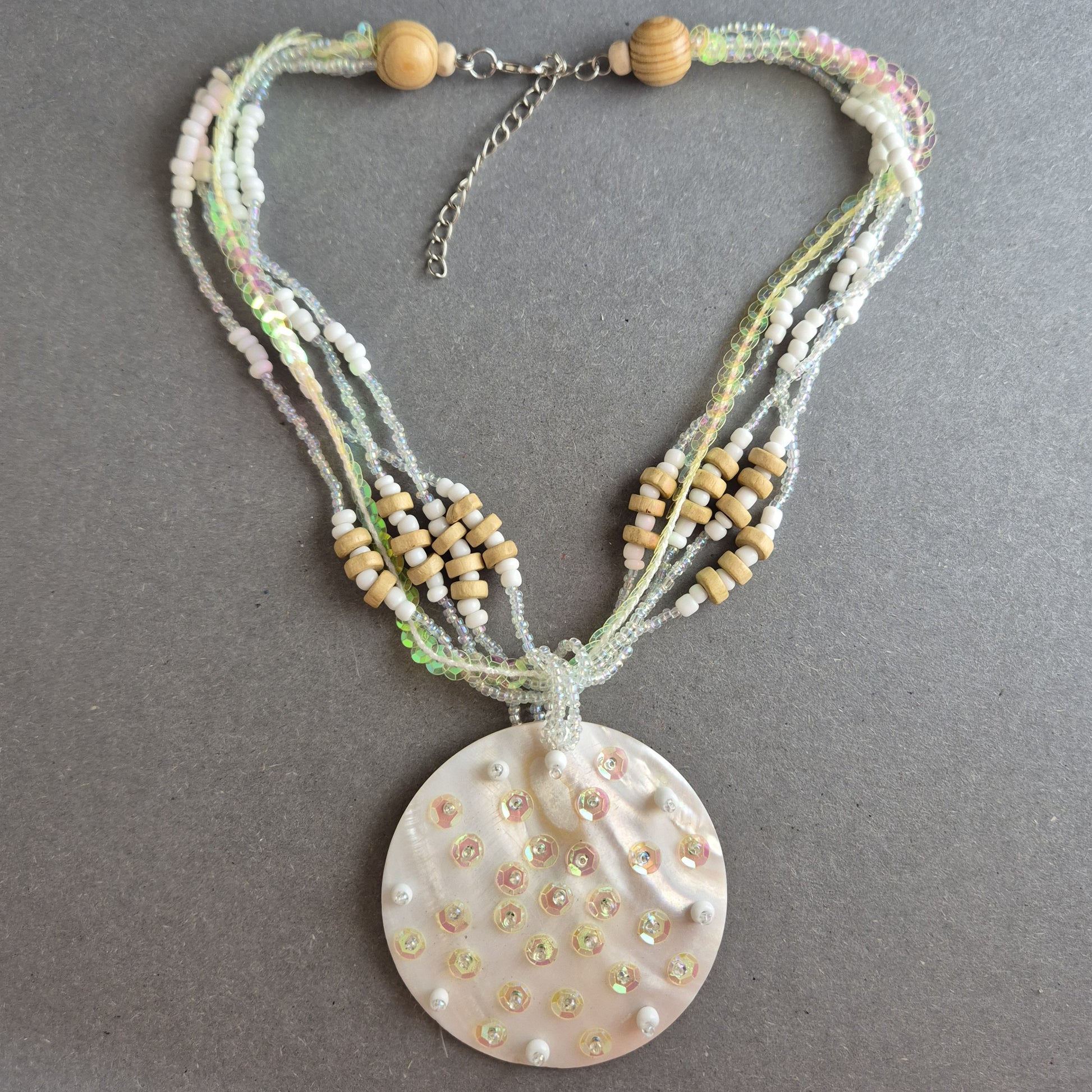 Diese verspielte Boho-Kette vereint natürliche Materialien mit schimmernden Akzenten. Mehrere Stränge aus irisierenden Glasperlen und Holzperlen münden in einen großen, runden Anhänger aus Perlmuttoptik, verziert mit glitzernden Pailletten. Die Kombination aus Naturtönen und sanftem Glanz macht diese Kette zum perfekten Accessoire für sommerliche Outfits, Festival-Looks oder Strandtage.