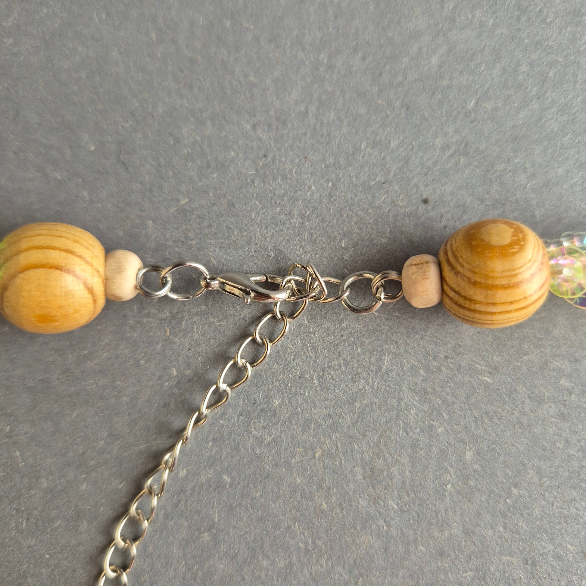 Material: Glasperlen, Holzperlen, Kunststoff-Pailletten, Metallverschluss