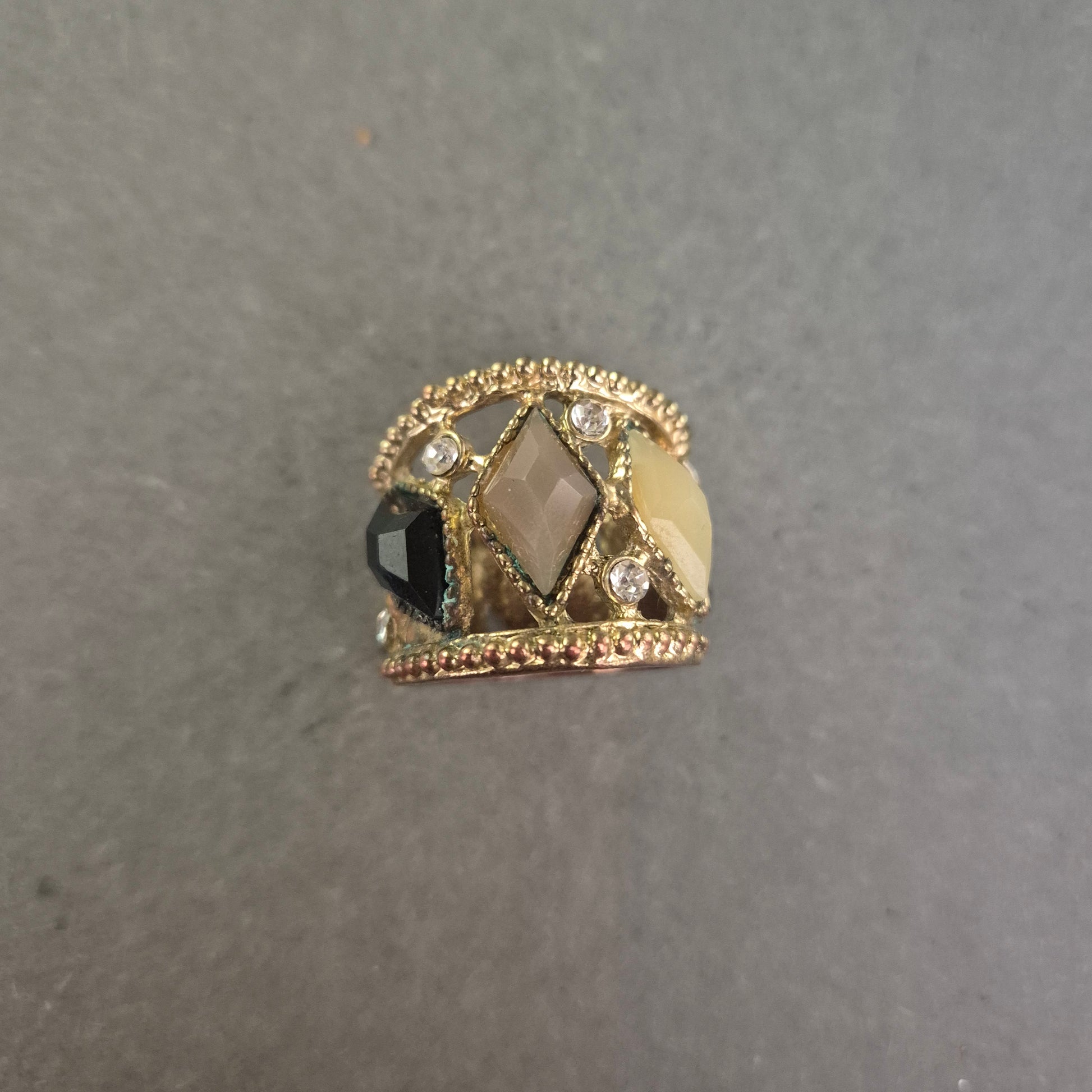 Dieser auffällige Vintage-Ring überzeugt mit einem extravaganten Mosaikdesign aus facettierten Schmucksteinen in Beige, Schwarz und Creme sowie kleinen Strassakzenten. Die goldfarbene Fassung mit filigranem Randmuster verleiht dem Ring eine orientalisch inspirierte Note und macht ihn zu einem echten Statement-Piece für modebewusste Trägerinnen.