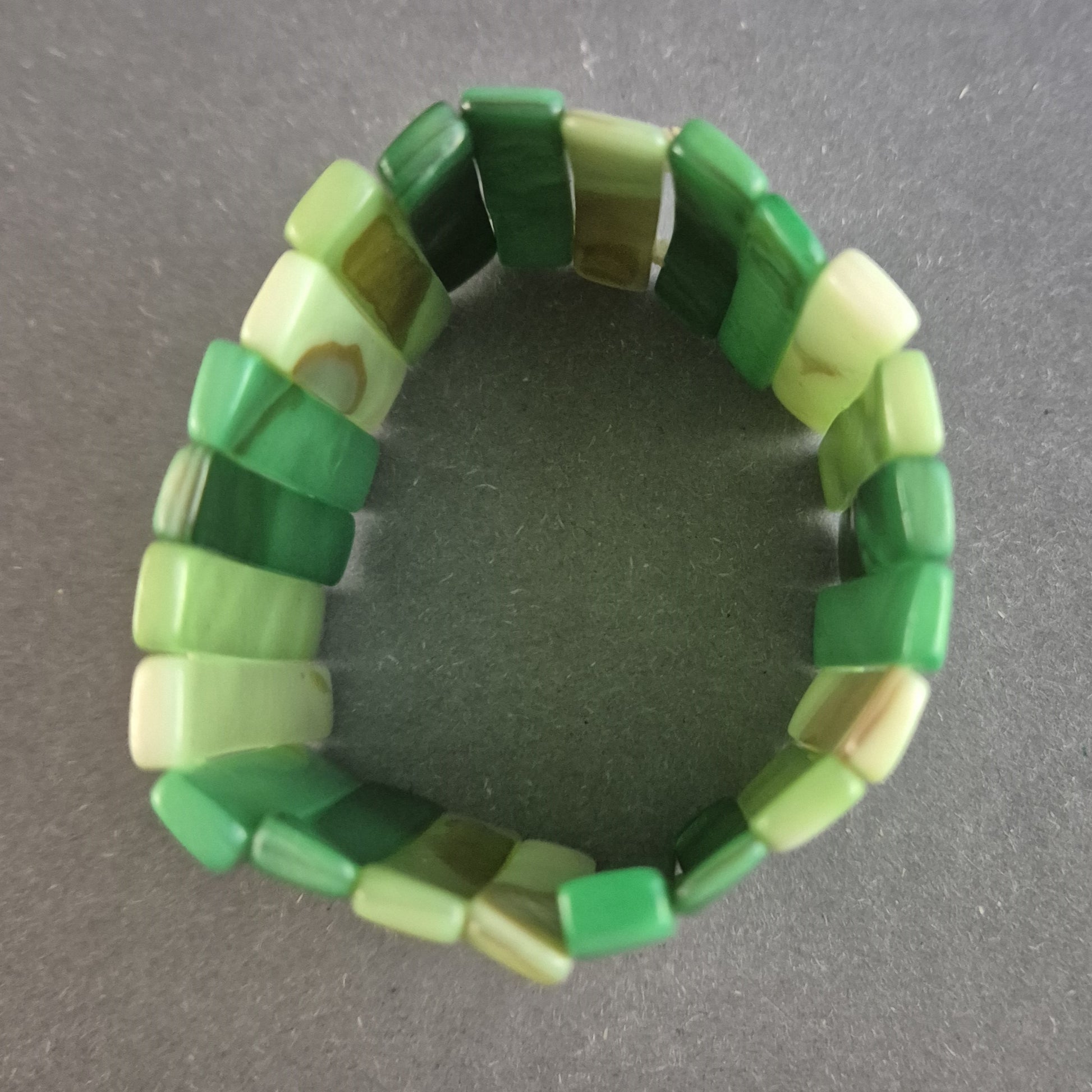 Dieses auffällige Armband begeistert mit seinen verschiedenen Grüntönen und dem einzigartigen, rechteckigen Design. Die sanft geschliffenen Elemente aus Kunststoff oder Naturmaterialien sind auf einem elastischen Band aufgereiht und bieten einen bequemen Sitz. Ein stilvolles Accessoire für alle, die auffälligen Schmuck mit natürlicher Eleganz lieben.