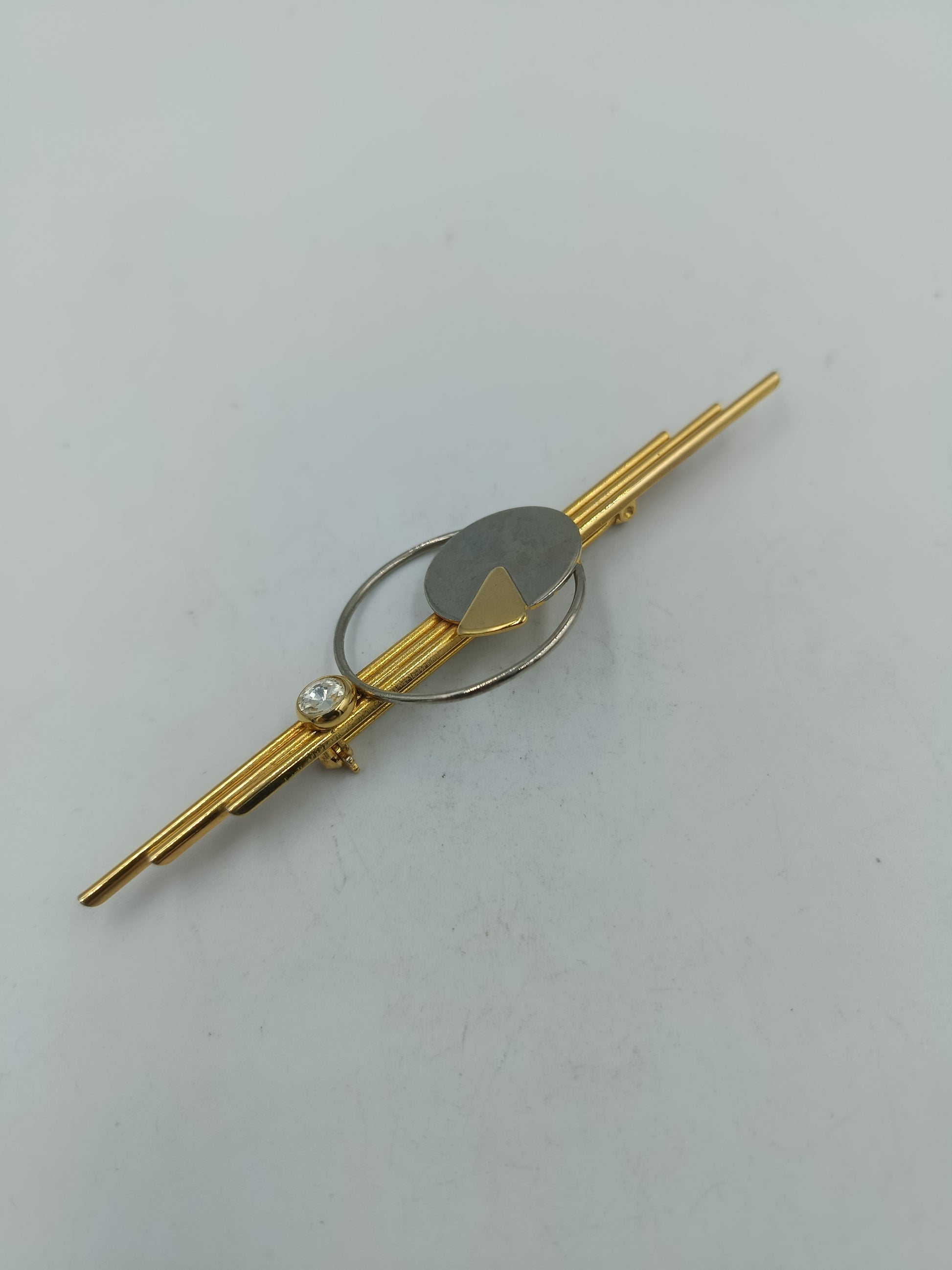 Ausgefallene Brosche im modernen, geometrischen Stil – ein kunstvolles Zusammenspiel aus klaren Linien, goldfarbenen Stäben und einem runden Element mit silberfarbenem Kontrast. Ein kleiner, funkelnder Stein rundet das elegante Design ab und verleiht der Brosche eine edle Note. Ideal als stilvolles Accessoire für Blazer, Kleider oder Schals.