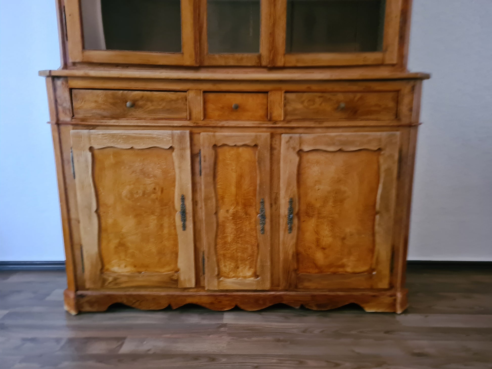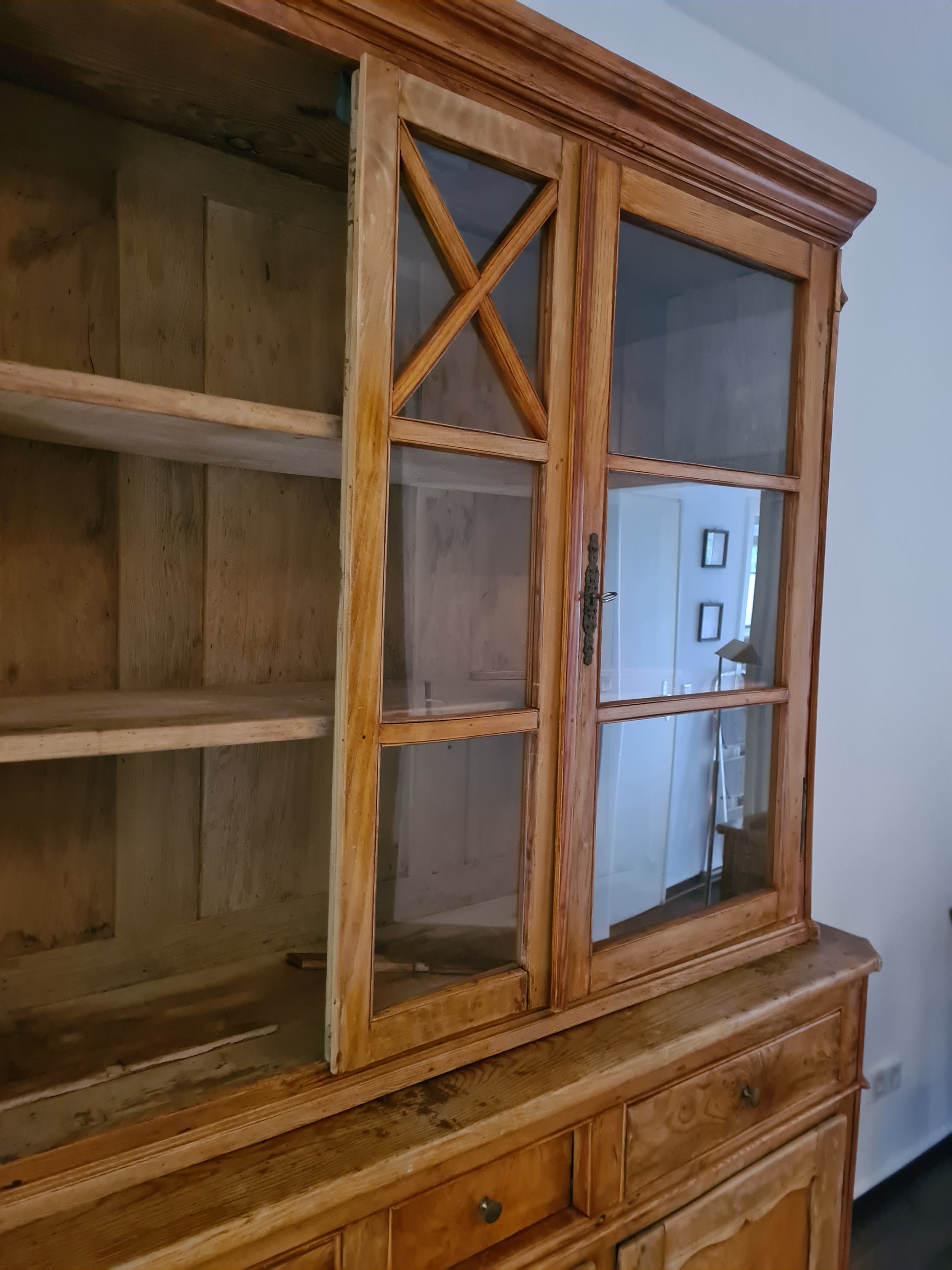 angeboten wird ein beeindruckender antiker Büffetschrank im Jugendstil, zweiteilig ausgeführt und aus massivem Holz gefertigt. Das Möbelstück vereint Funktionalität und zeitlose Eleganz – mit einer großzügigen Vitrine im oberen Teil und einem geschlossenen Stauraum im unteren Bereich. Feine Holzverzierungen, originale Beschläge und die stiltypische Gliederung machen dieses Möbel zu einem außergewöhnlichen Sammlerstück und Blickfang für jedes Interieur.