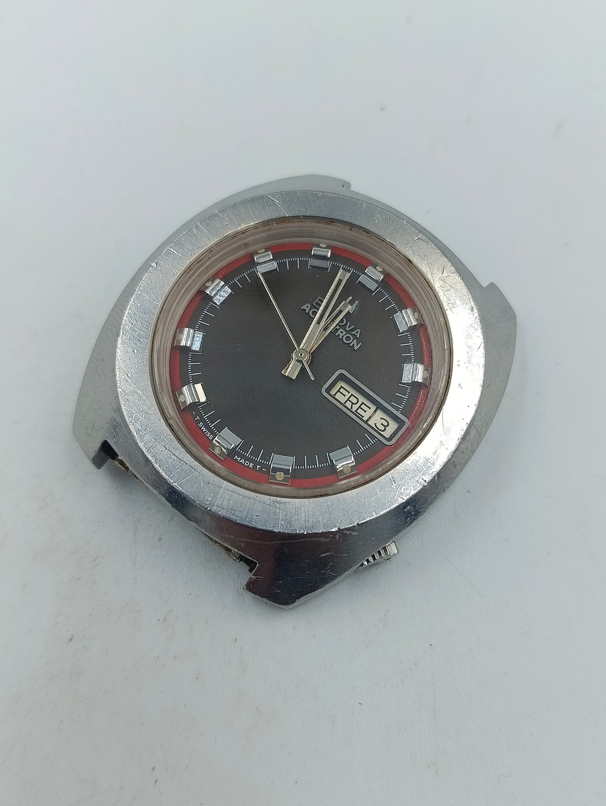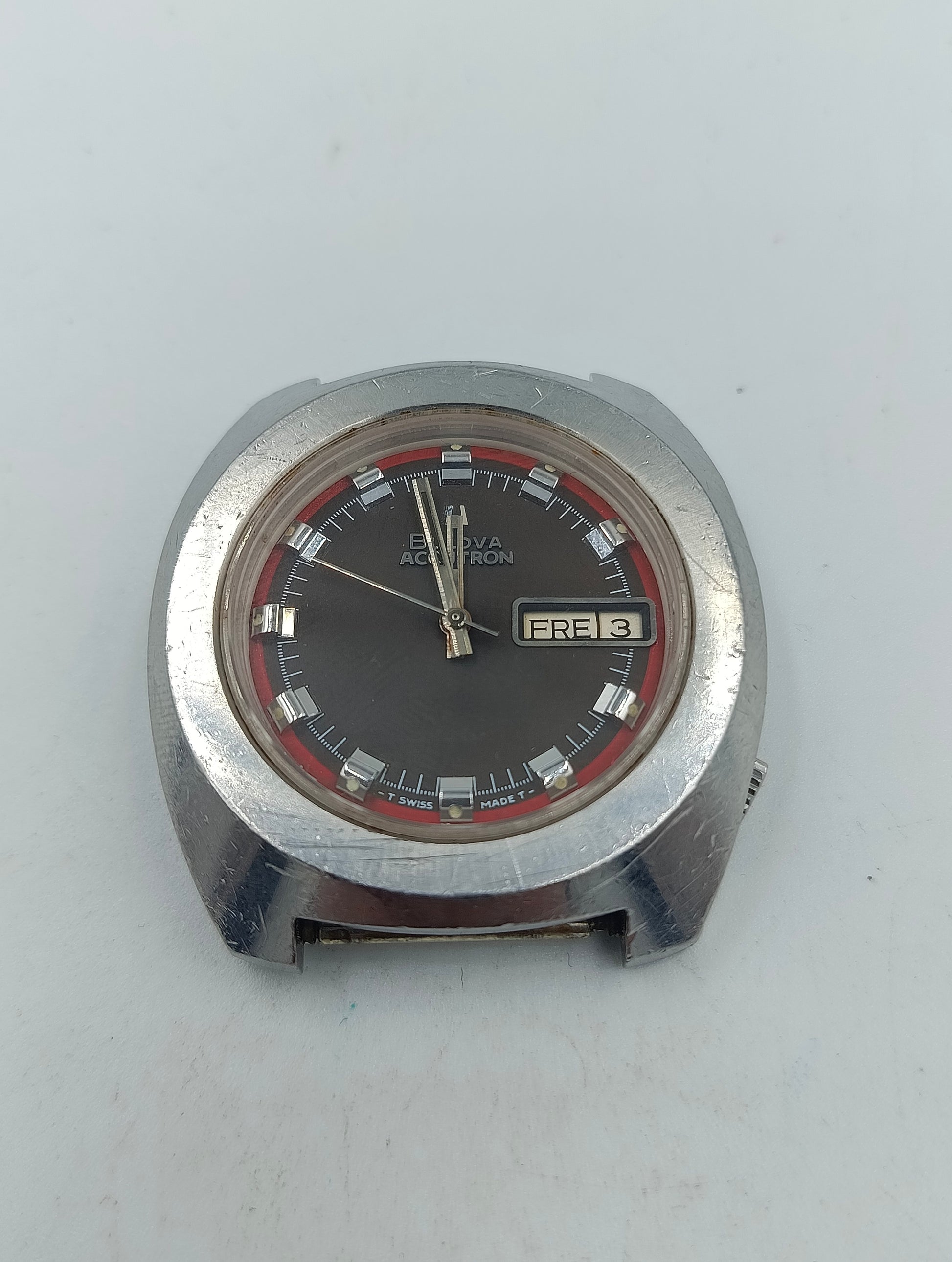 Seltene Bulova Accutron Herrenarmbanduhr mit charakteristischem grauem Zifferblatt und rotem Innenring. Die Uhr ist mit dem innovativen Stimmgabelwerk Kaliber 2181 ausgestattet – ein technisches Meisterstück aus den 1970er Jahren, das für seine Präzision bekannt ist. Perfekt für Sammler klassischer Bulova-Modelle.