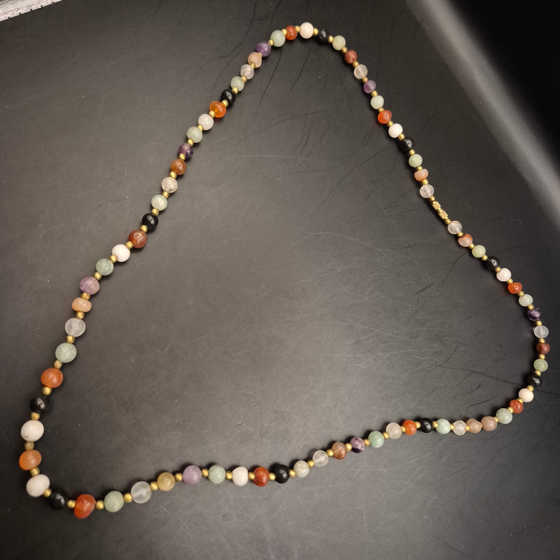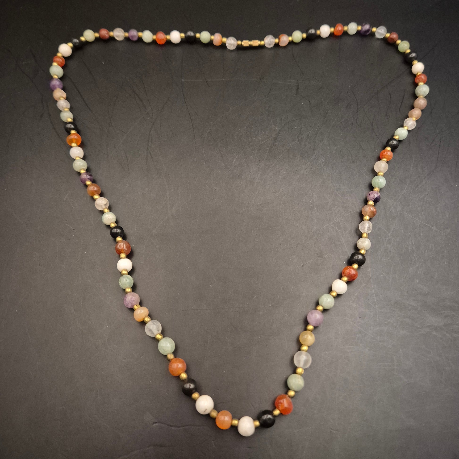 Diese bunte Damen Halskette überzeugt durch ihre harmonische Farbvielfalt und die natürliche Ausstrahlung der runden Kugelperlen in Edelsteinoptik. Die Perlen variieren in Farbe und Struktur – von sanften Pastelltönen bis hin zu kräftigem Schwarz und Orange. Kleine goldfarbene Zwischenperlen runden das Gesamtbild stilvoll ab. Die Kette besitzt einen klassischen Schraubverschluss.
