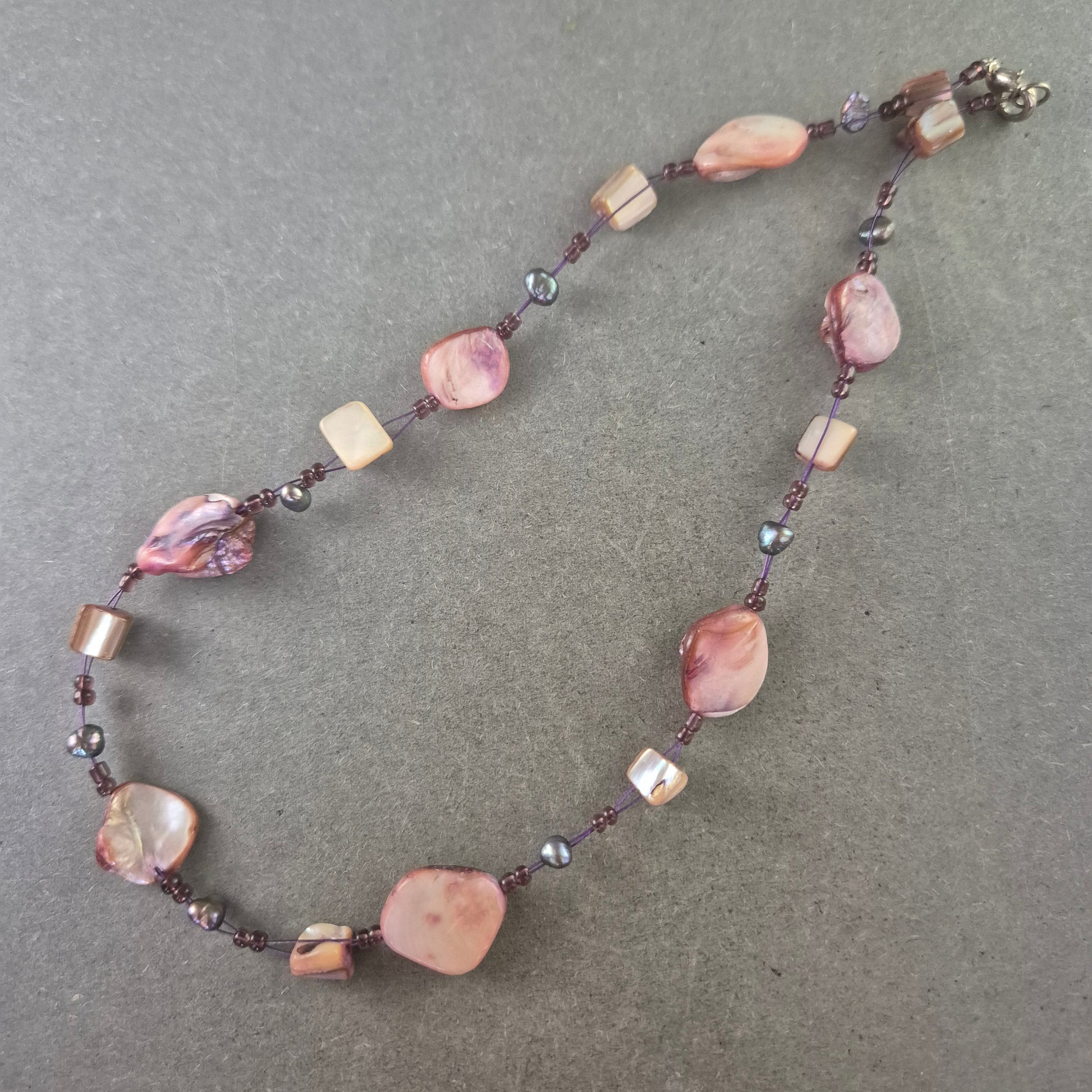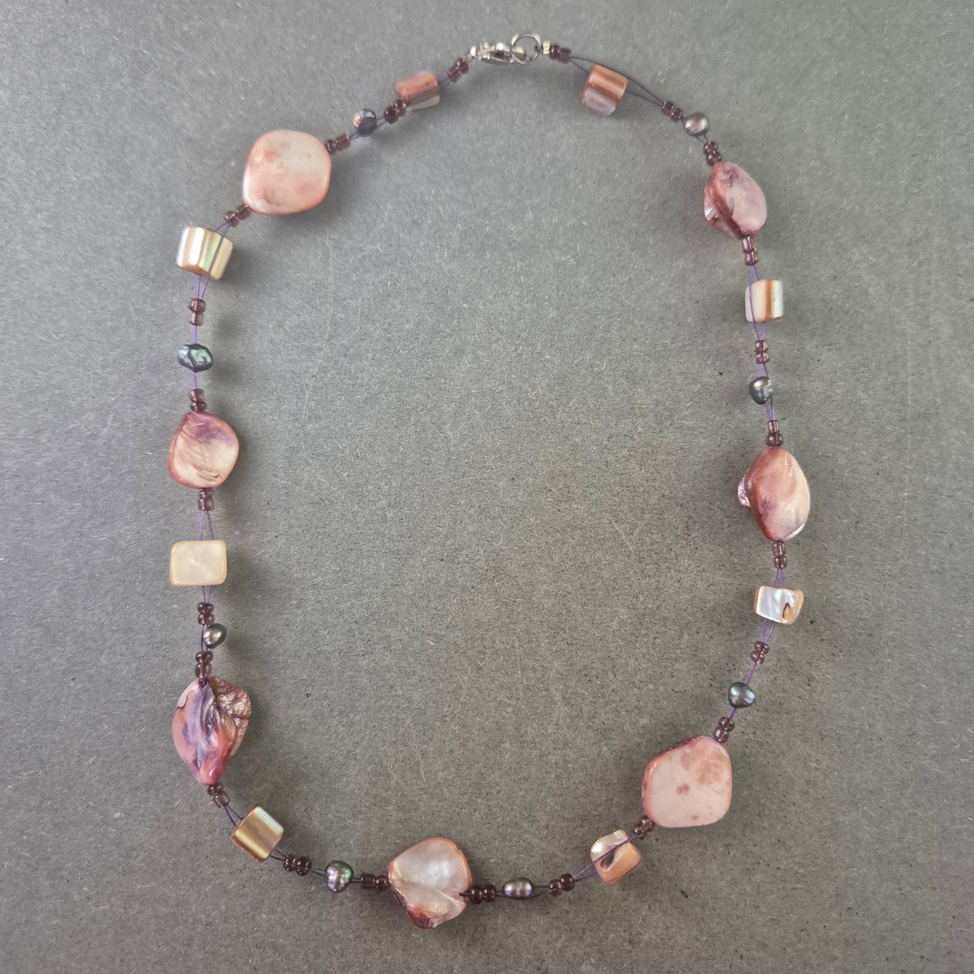Diese elegante Damen Halskette besticht durch ihre farbenfrohe Kombination aus Natursteinen und schimmernden Perlen. Die unregelmäßigen Formen der Steine verleihen der Kette einen natürlichen und einzigartigen Charakter. Durch die warmen Töne in Rosa, Lila und Creme eignet sich dieses Schmuckstück ideal als besonderer Hingucker für Alltag und festliche Anlässe. Ein stabiler Karabinerverschluss sorgt für sicheren Halt.