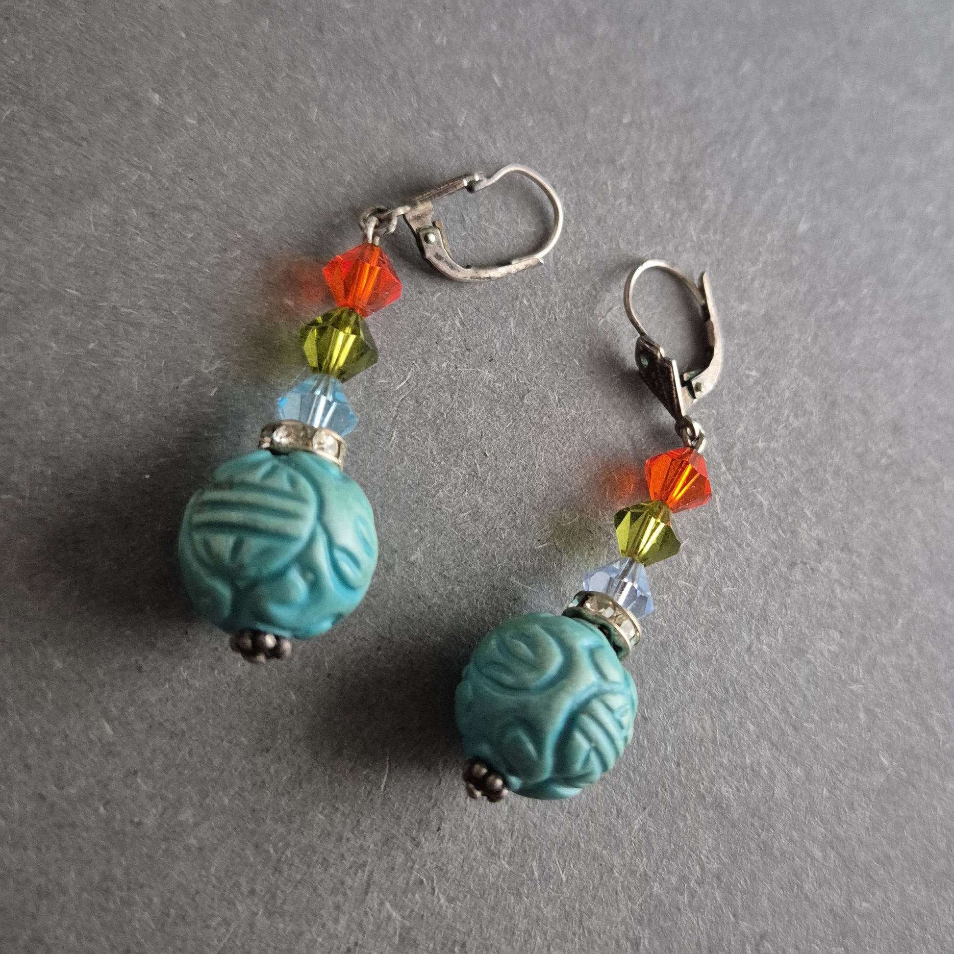 Diese farbenfrohen Hängeohrringe vereinen leuchtende Farben mit einem exotischen Design. Die große türkisfarbene Kugel mit eingraviertem Muster bildet das Highlight und wird von facettierten, bunt schimmernden Perlen in Orange, Grün und Blau ergänzt. Die versilberten Details und der praktische Klappverschluss machen sie zu einem stilvollen Hingucker für Liebhaber von Ethno- und Boho-Schmuck.