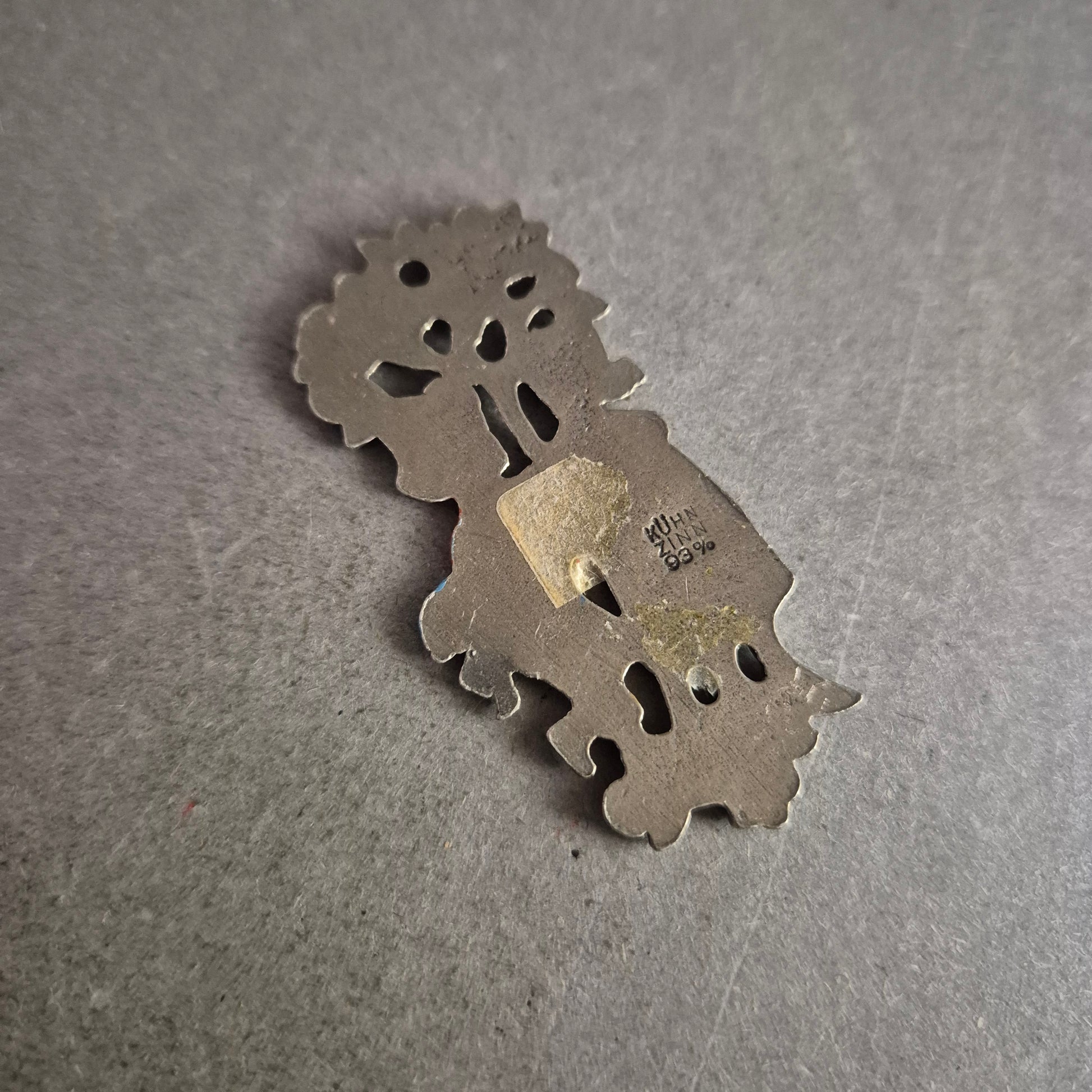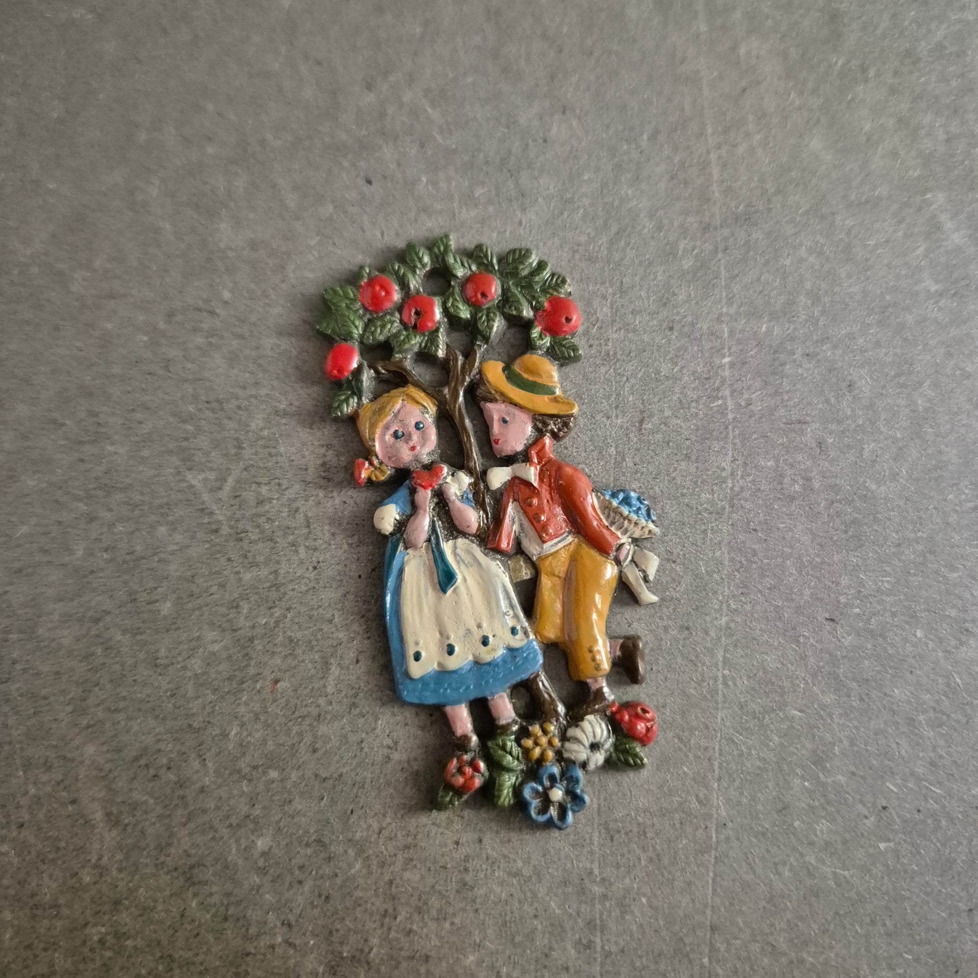Diese nostalgische Brosche zeigt ein detailreich gearbeitetes Liebespaar in traditioneller Tracht unter einem Apfelbaum. Die bunte Handbemalung verleiht der Szene eine charmante, folkloristische Ausstrahlung. Rückseitig mit Nadelverschluss versehen, lässt sich die Brosche ideal an Blusen, Jacken oder Taschen anbringen – ein echtes Vintage-Stück für Liebhaber besonderer Accessoires.