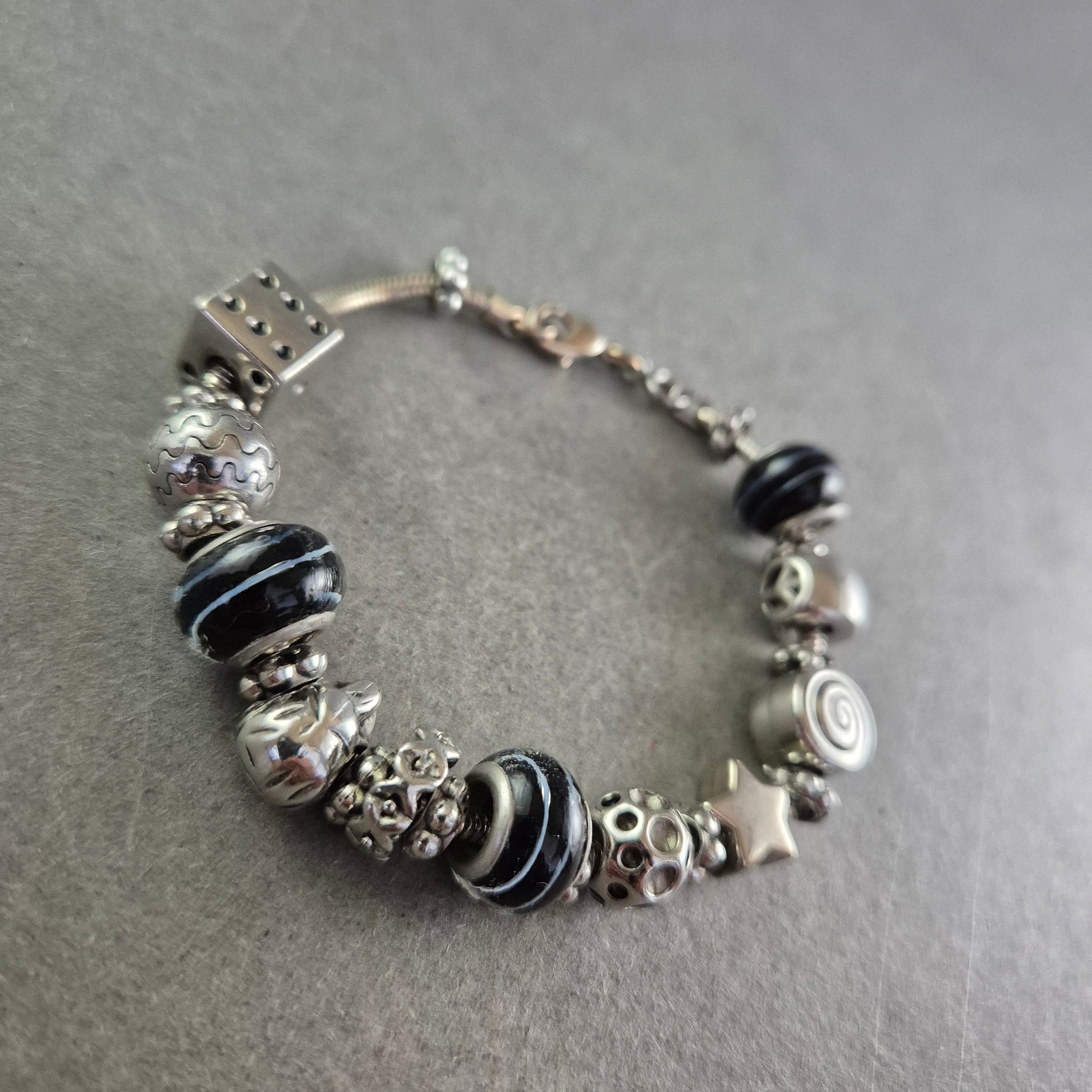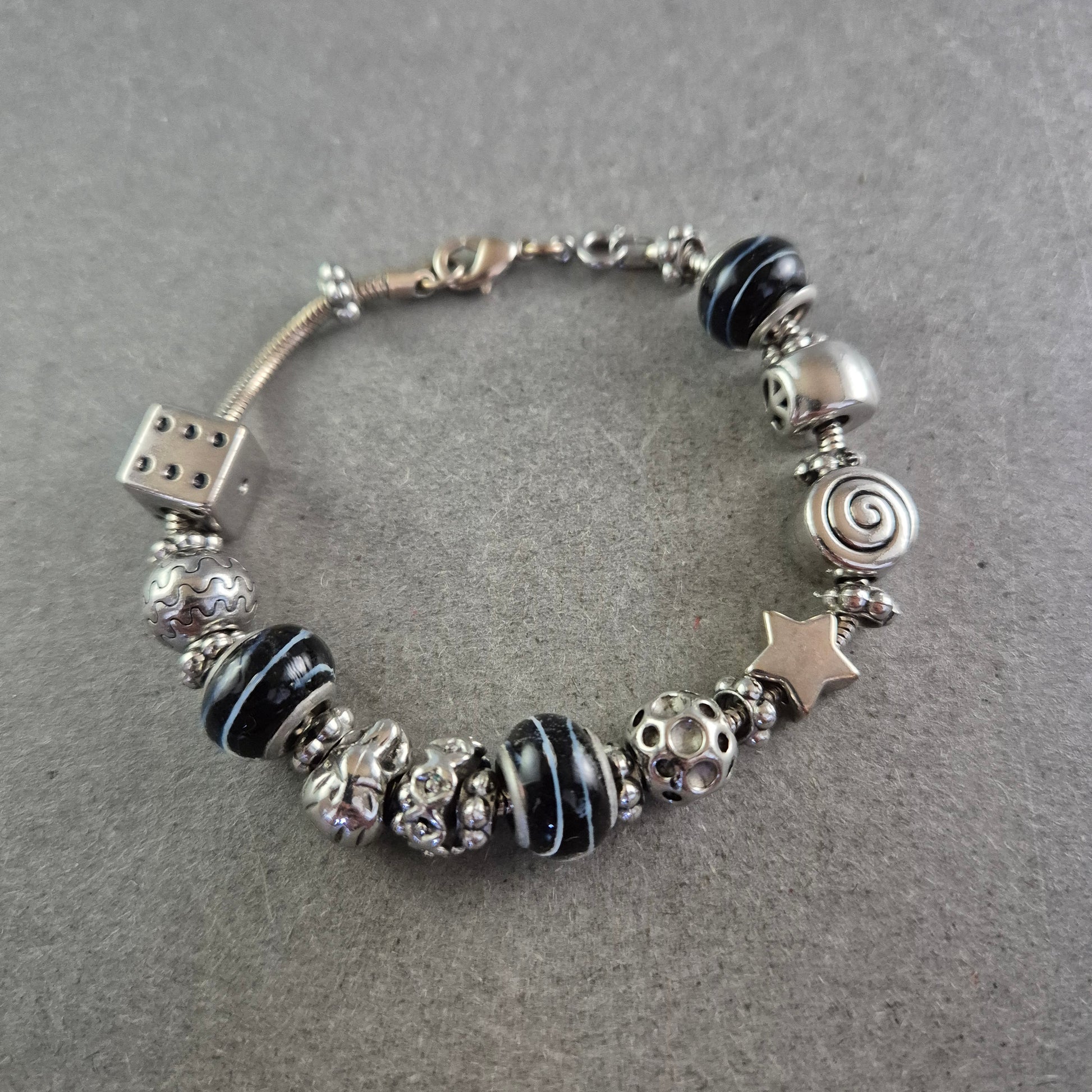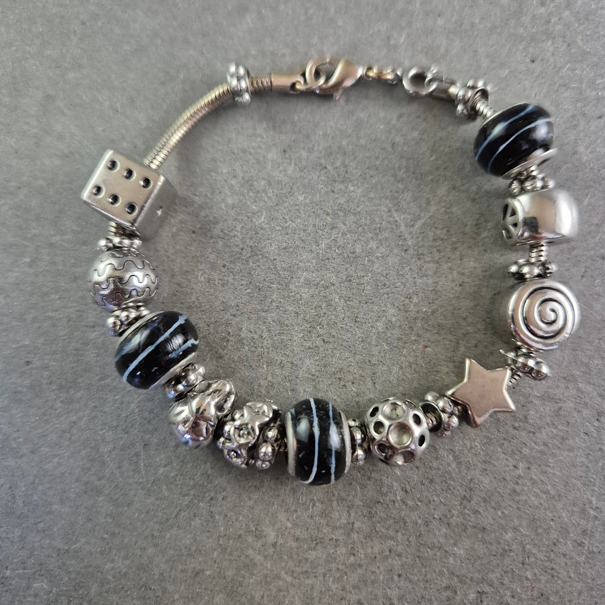 Dieses kreative Charm-Armband kombiniert verspielte Elemente mit edler Silberoptik. Neben detailreichen Metallanhängern – wie Stern, Spirale und Würfel – sorgen glasierte, schwarz-weiß marmorierte Perlen für einen modernen Look. Das Armband erinnert an den beliebten Stil von Pandora, ist jedoch einzigartig durch die liebevoll zusammengestellten Einzelteile.