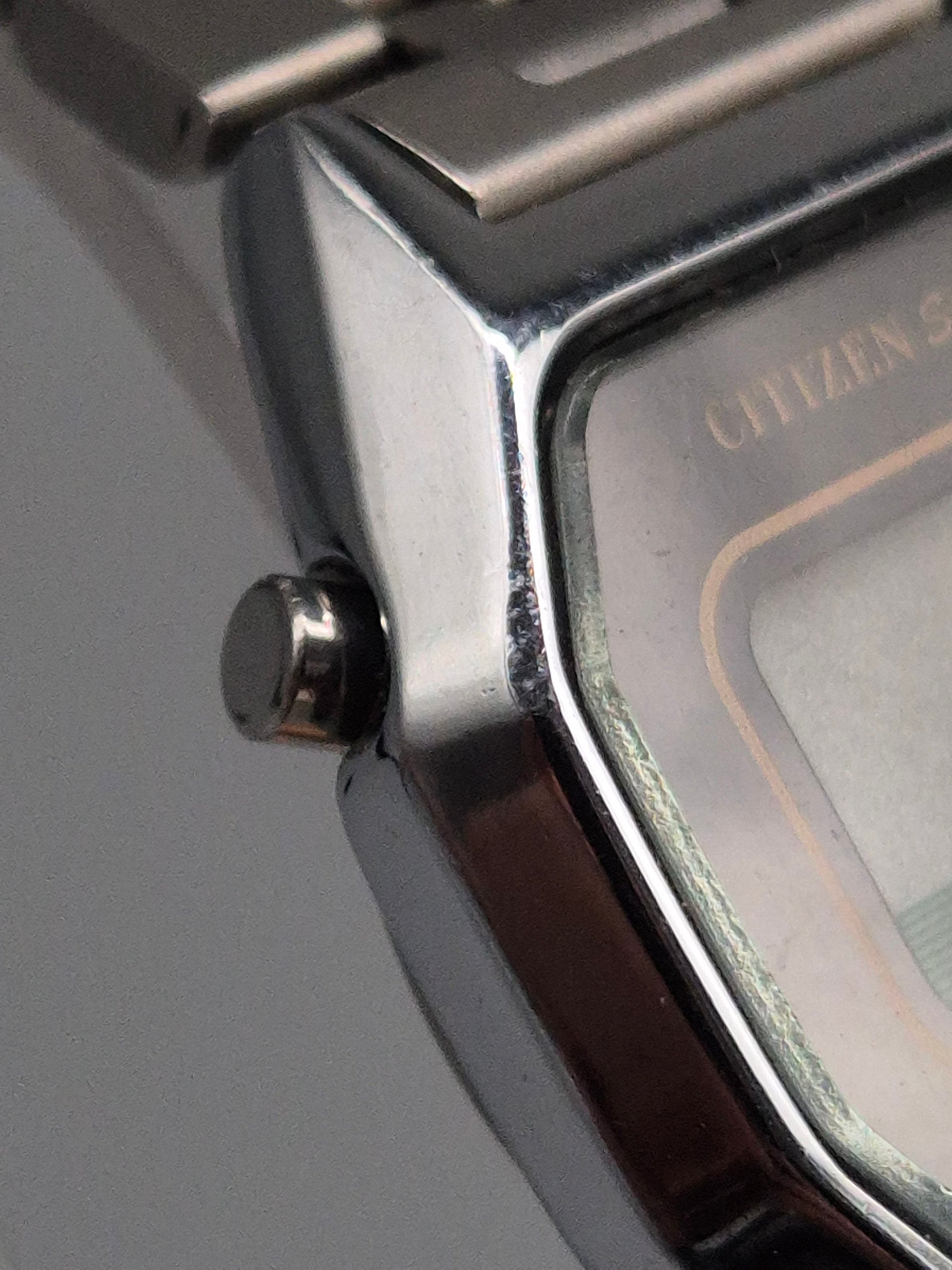 Diese Citizen Seven Digital Uhr aus Japan vereint Retro‑Charme und funktionale Eleganz. Sie verfügt über eine rechteckige Edelstahl‑Schale mit integriertem Chronographen, Alarmfunktion, Lap/Reset, Stoppuhr und Beleuchtung – klassische Features aus den 80er Jahren. Das originale Edelstahl‑Gliederarmband unterstreicht den Vintage‑Stil und bietet ein angenehmes Tragegefühl. Das silberne Metallgehäuse zeigt dezente Gebrauchsspuren, die den authentischen Charakter betonen.
