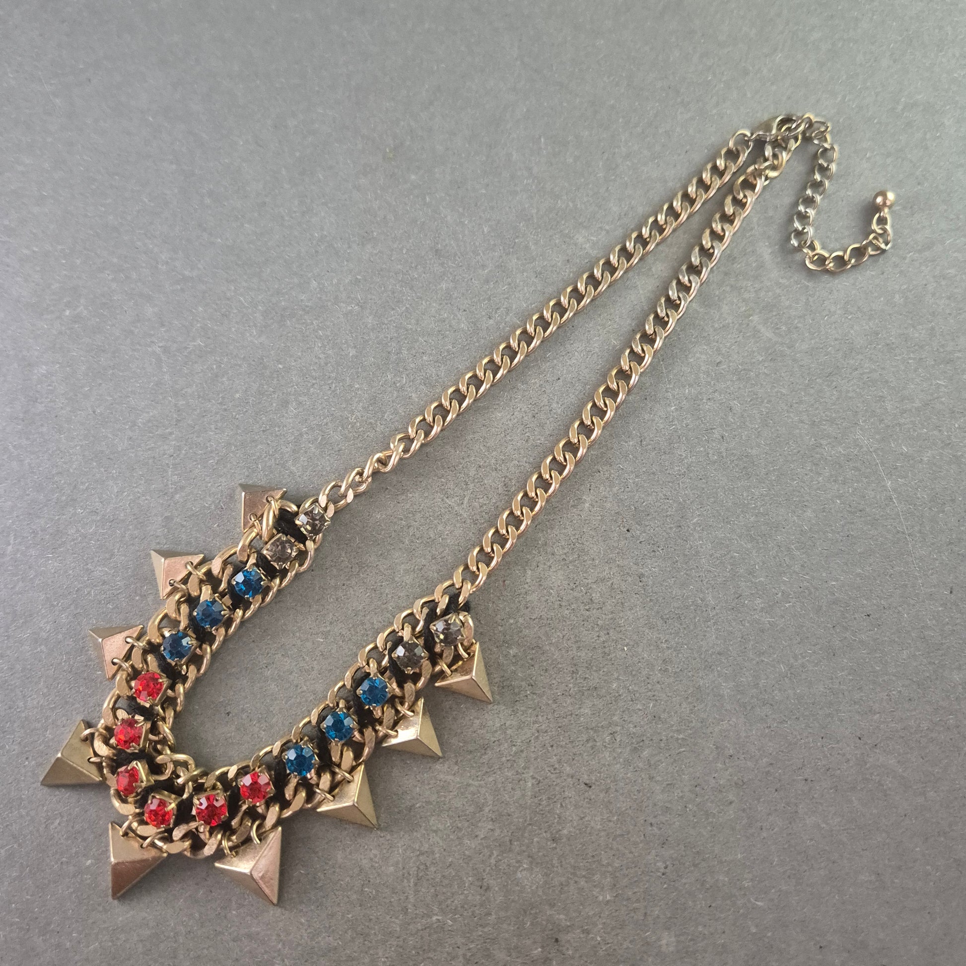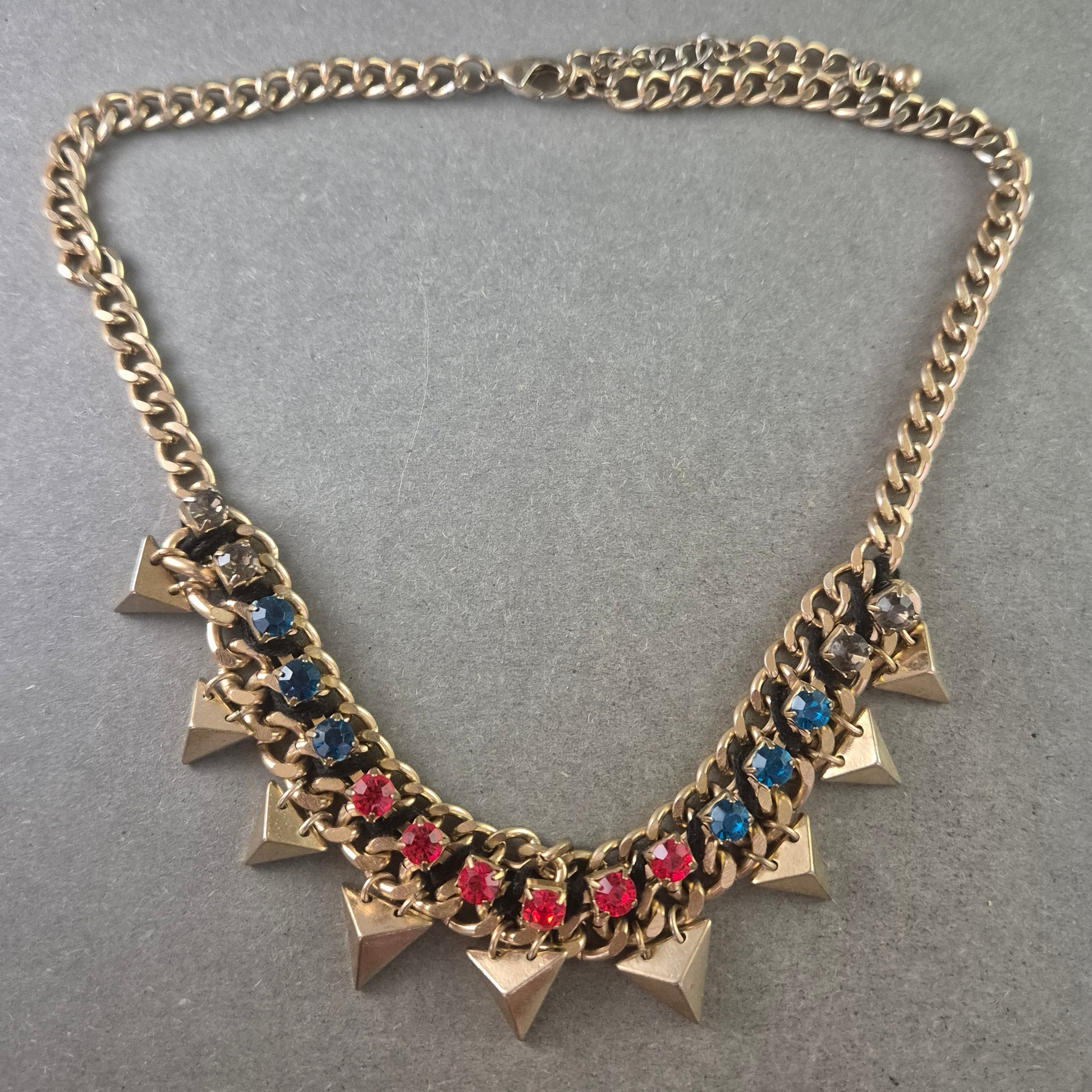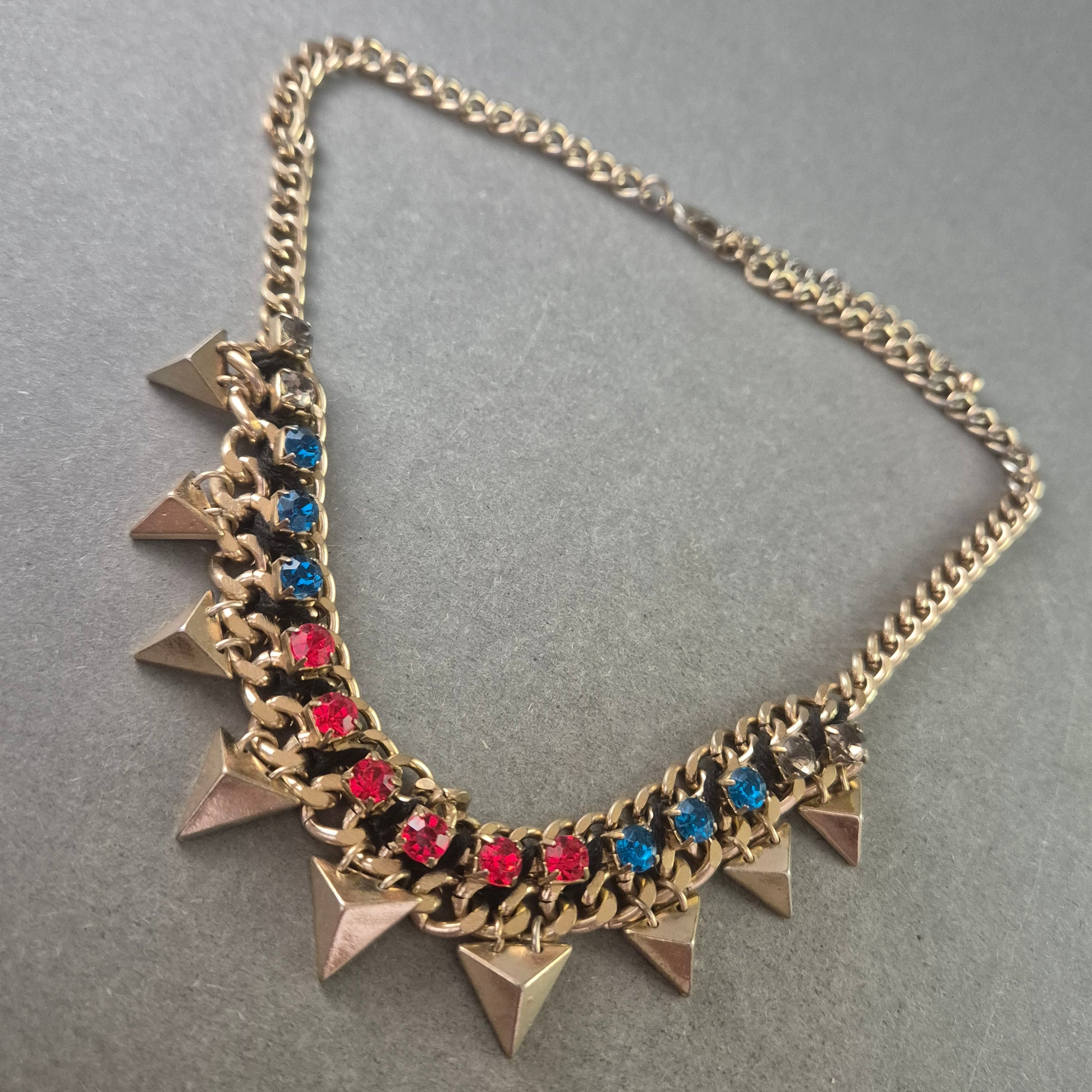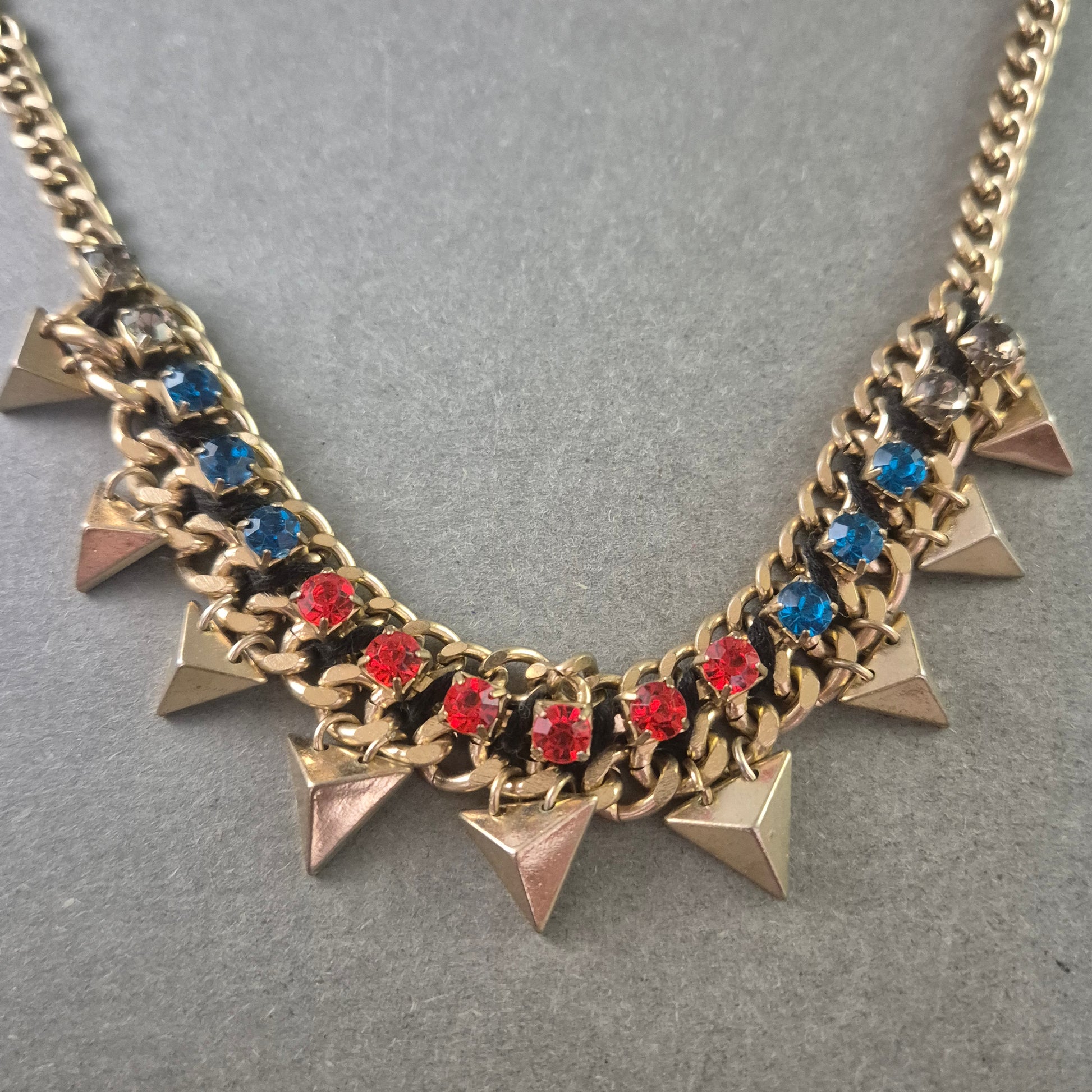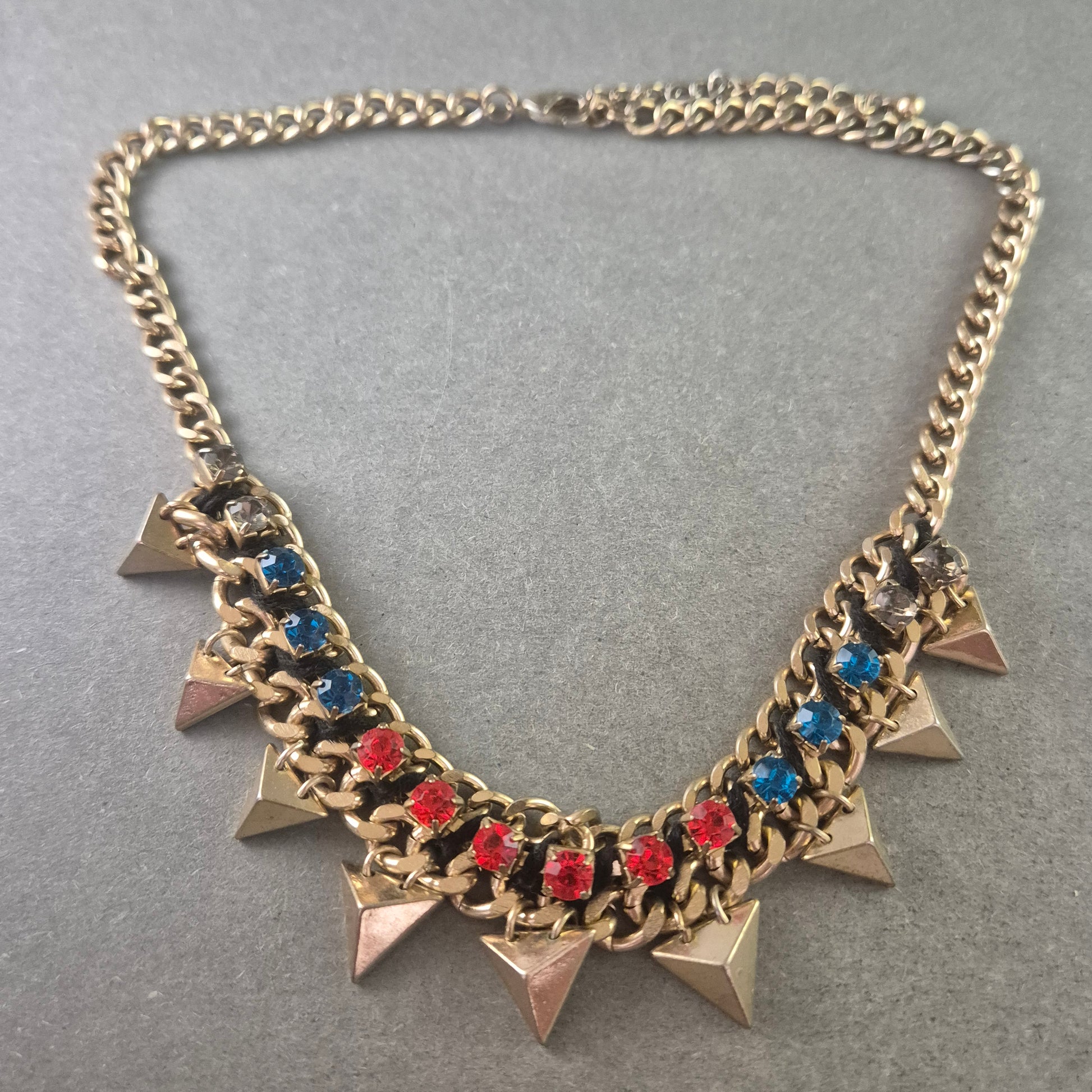 Diese auffällige Damen Halskette kombiniert goldfarbene Glieder mit markanten Nieten und funkelnden Steinen in Rot und Blau. Der rockige Statement-Look macht dieses Schmuckstück zu einem echten Hingucker und idealen Begleiter für modische Outfits. Mit ihrem markanten Design lässt sie sich perfekt zu schlichten Outfits kombinieren, um ein starkes Style-Statement zu setzen.
