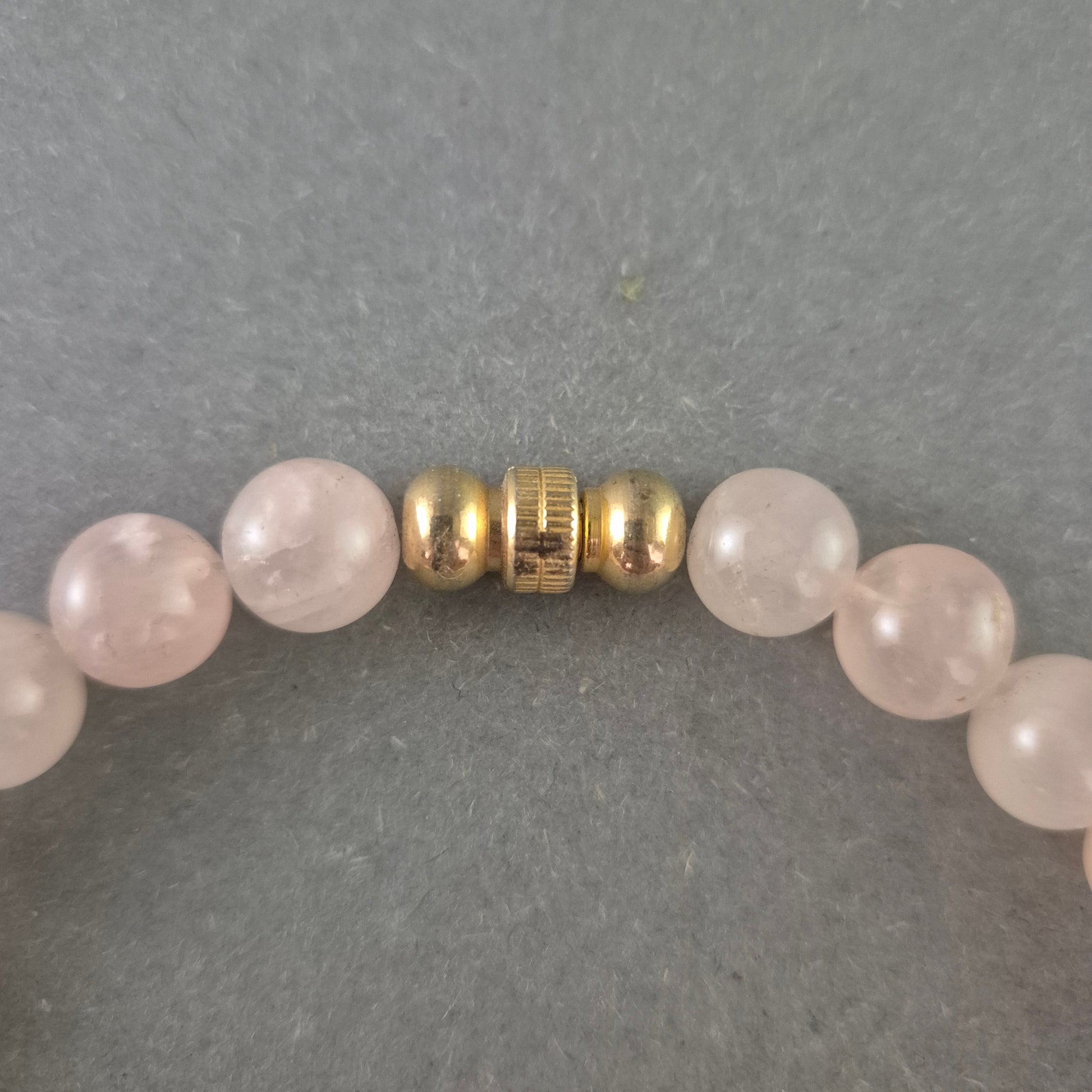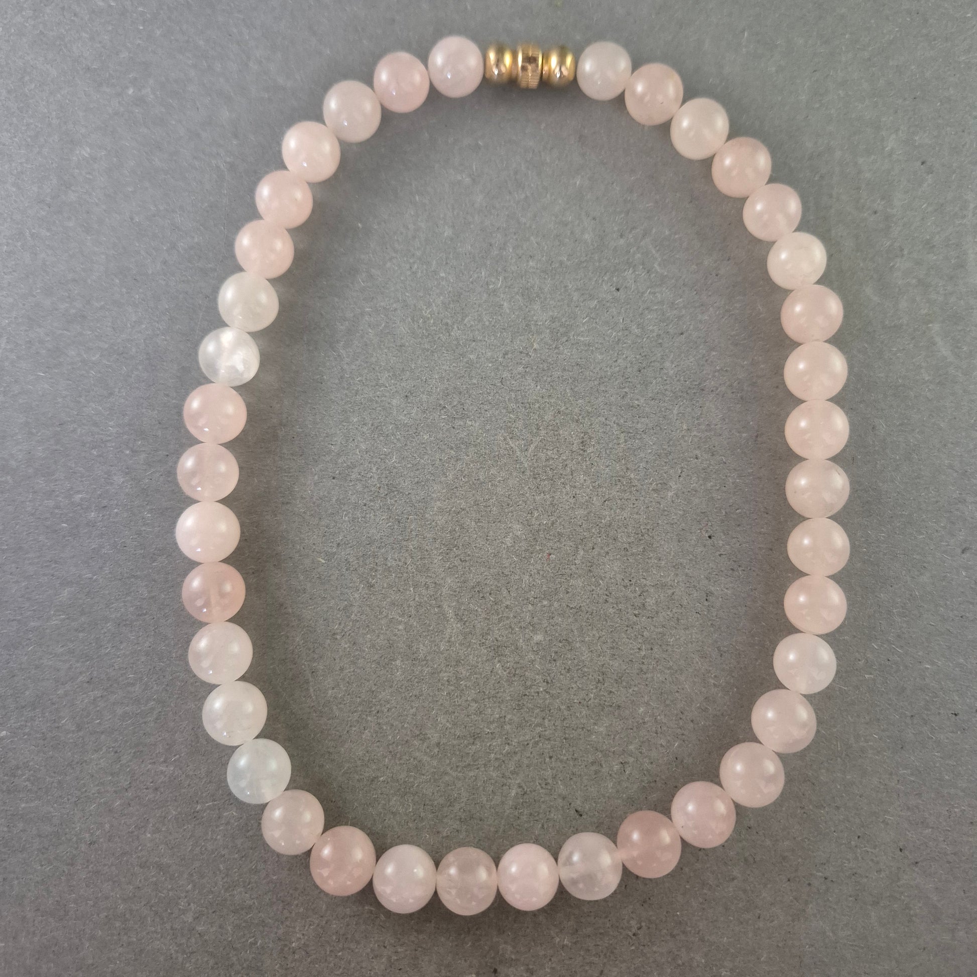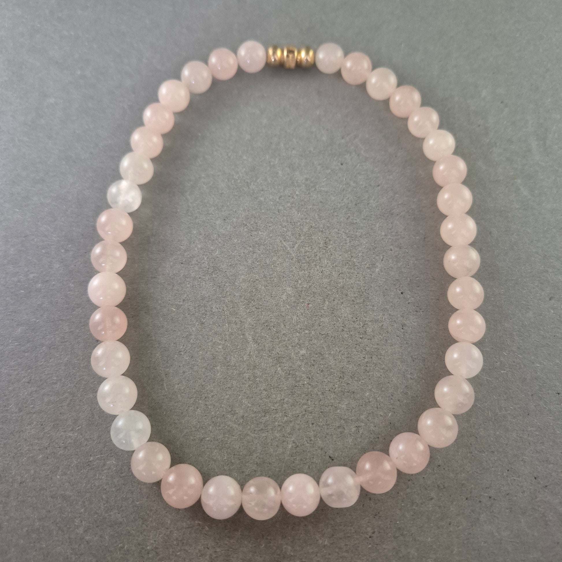 Diese elegante Damen Halskette ist aus zart rosafarbenem Rosenquarz gefertigt. Die Kugelperlen sind gleichmäßig geschliffen und aufgezogen, wodurch die Kette einen klassischen und femininen Look erhält. Der Magnetverschluss sorgt für einfaches An- und Ablegen.