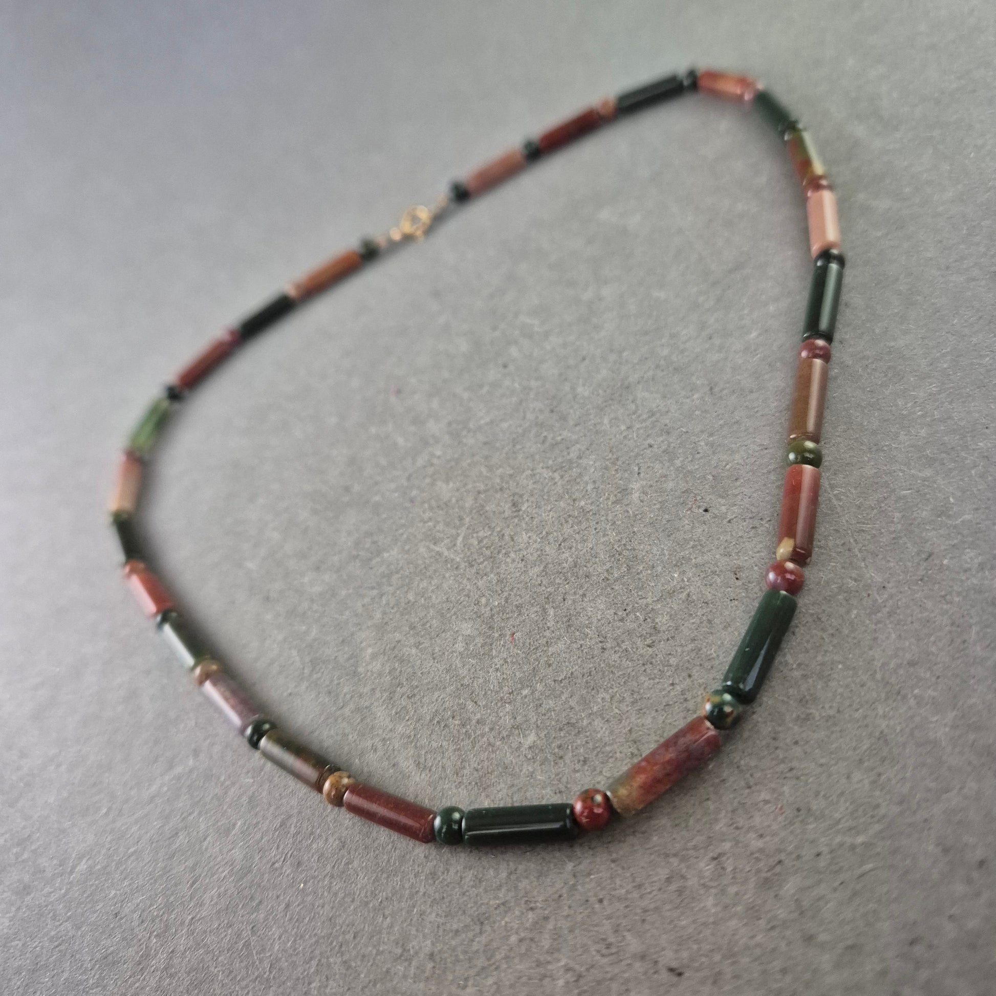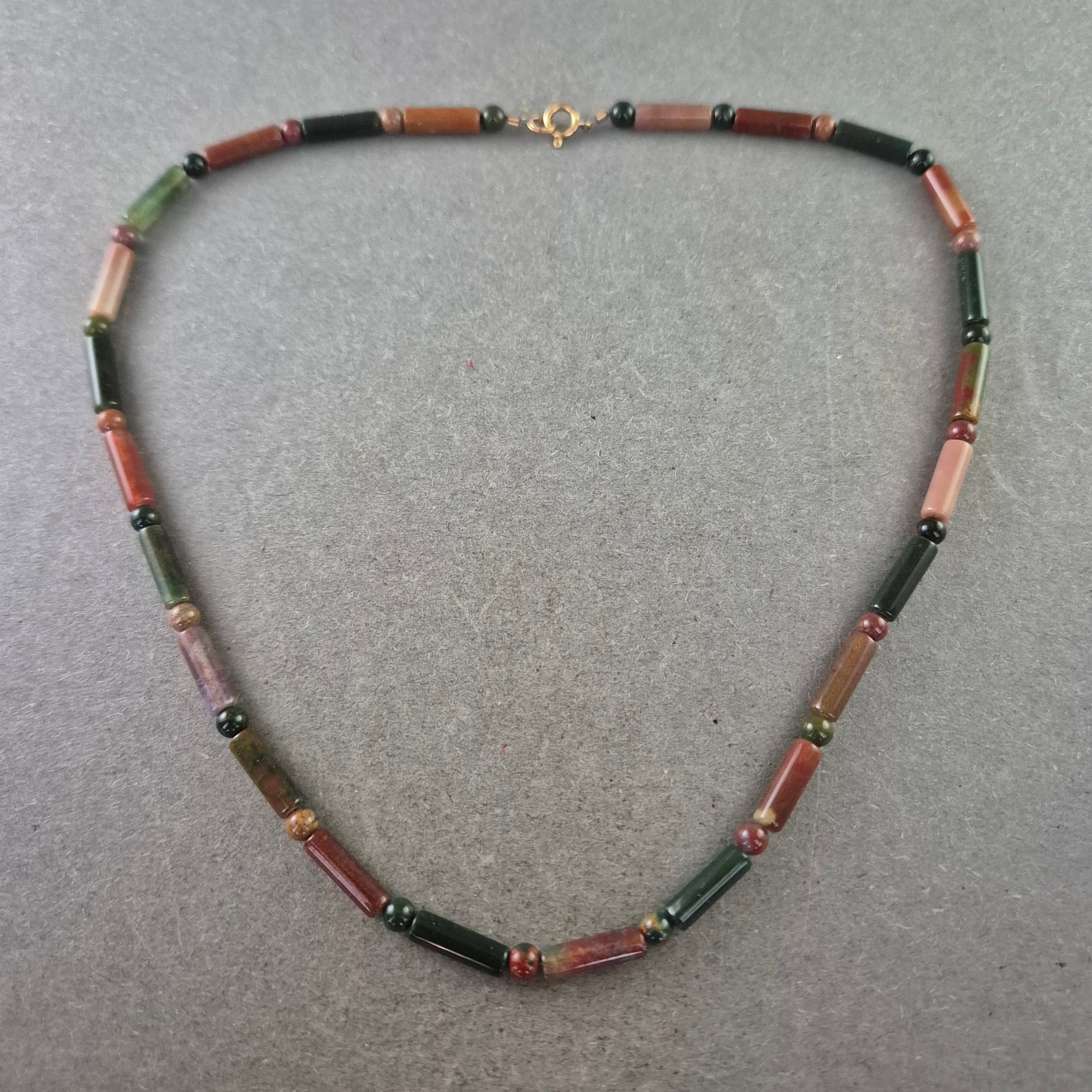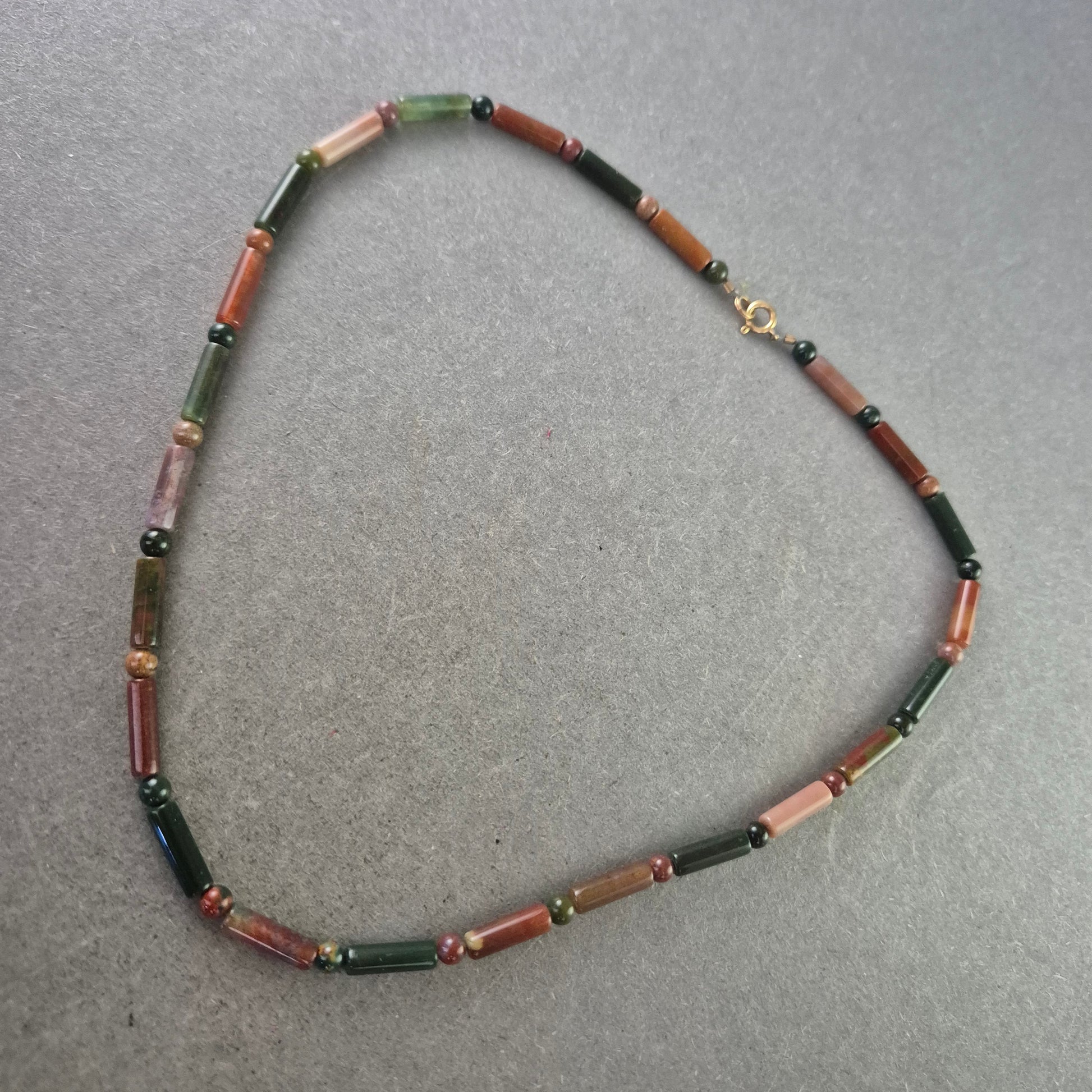 Diese elegante Damen Kette besteht aus länglichen Edelsteinperlen in warmen Grün- und Rottönen. Die Steine sind glatt geschliffen und abwechselnd mit kleinen runden Perlen kombiniert, was der Kette eine harmonische Struktur verleiht. Der dezente goldfarbene Verschluss sorgt für sicheren Halt. Ein zeitloses Schmuckstück, das sich sowohl im Alltag als auch zu besonderen Anlässen stilvoll tragen lässt.