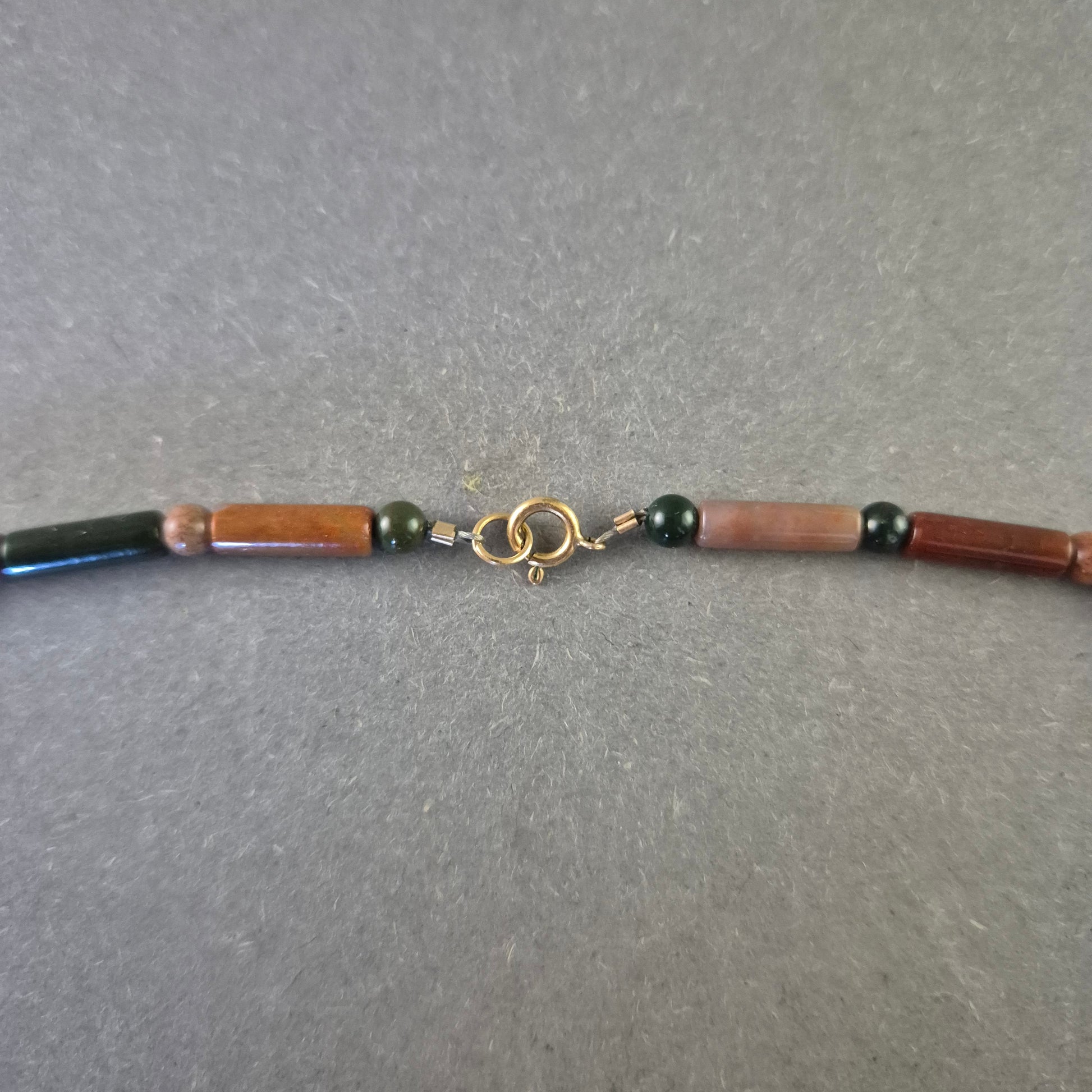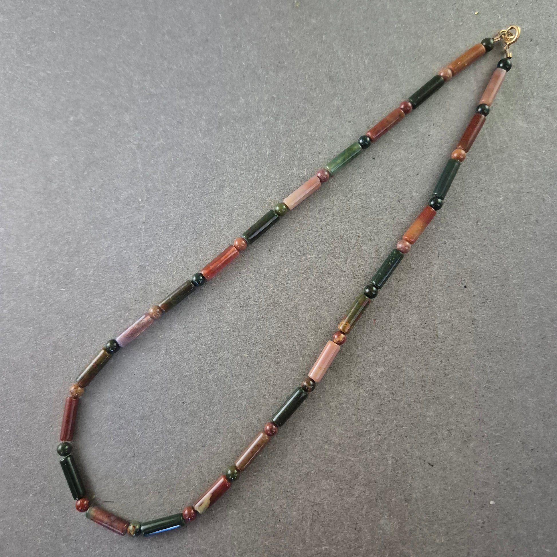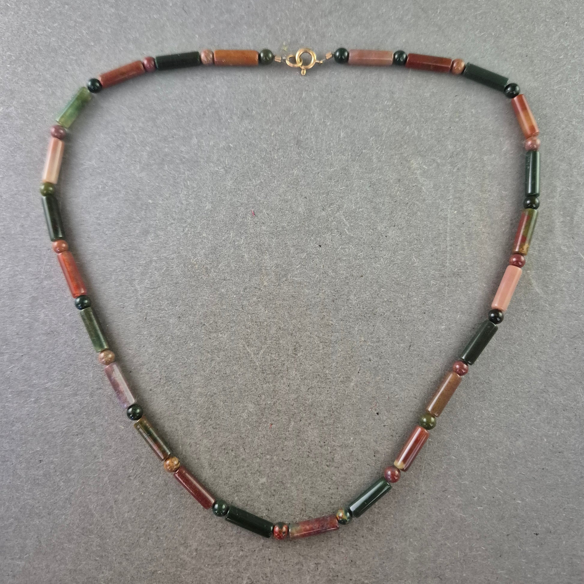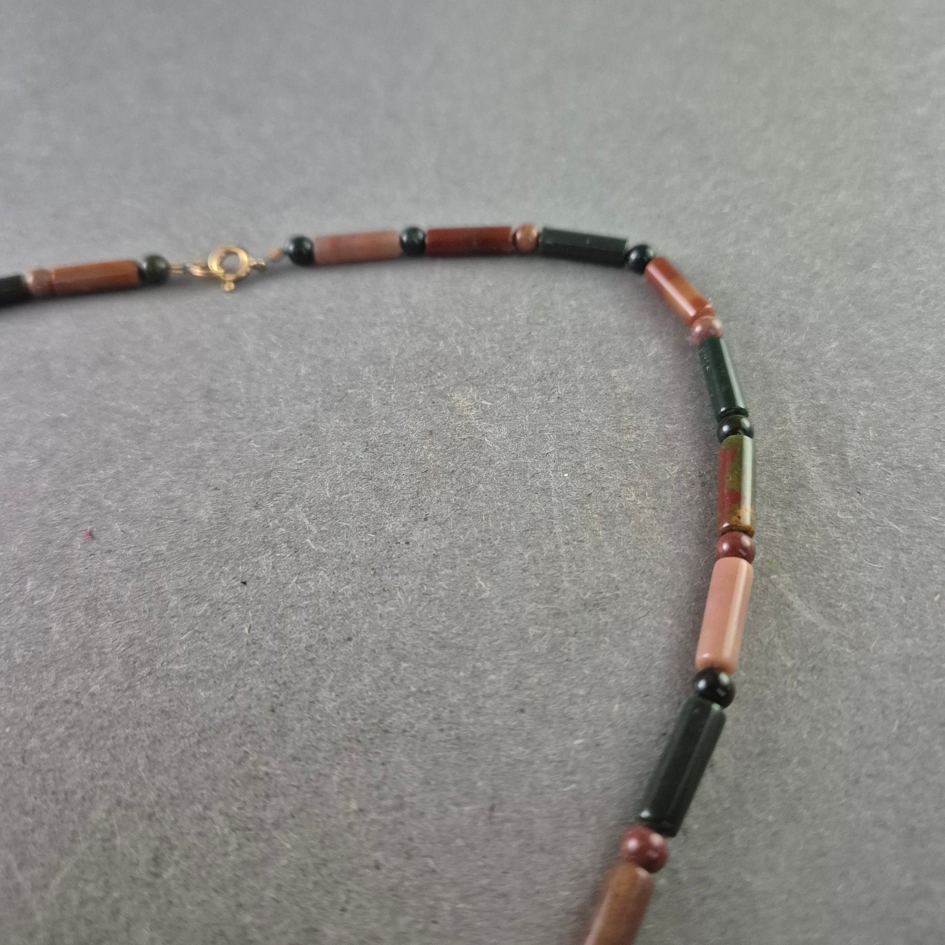 Diese elegante Damen Kette besteht aus länglichen Edelsteinperlen in warmen Grün- und Rottönen. Die Steine sind glatt geschliffen und abwechselnd mit kleinen runden Perlen kombiniert, was der Kette eine harmonische Struktur verleiht. Der dezente goldfarbene Verschluss sorgt für sicheren Halt. Ein zeitloses Schmuckstück, das sich sowohl im Alltag als auch zu besonderen Anlässen stilvoll tragen lässt.