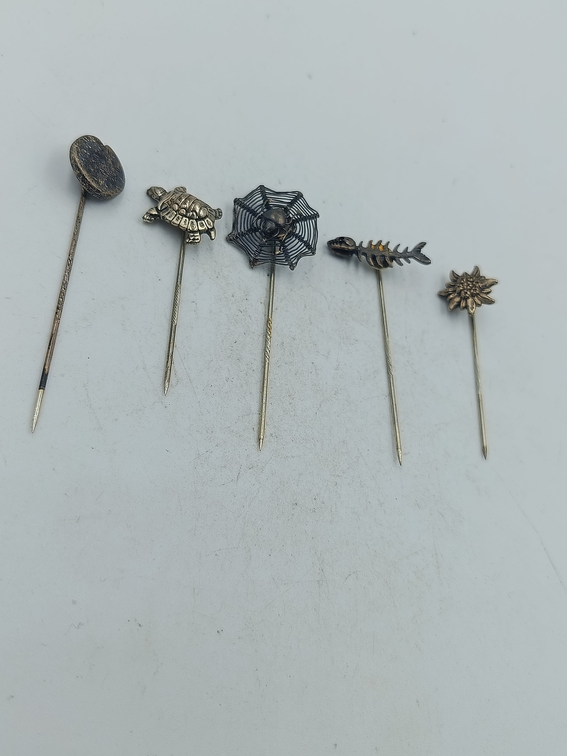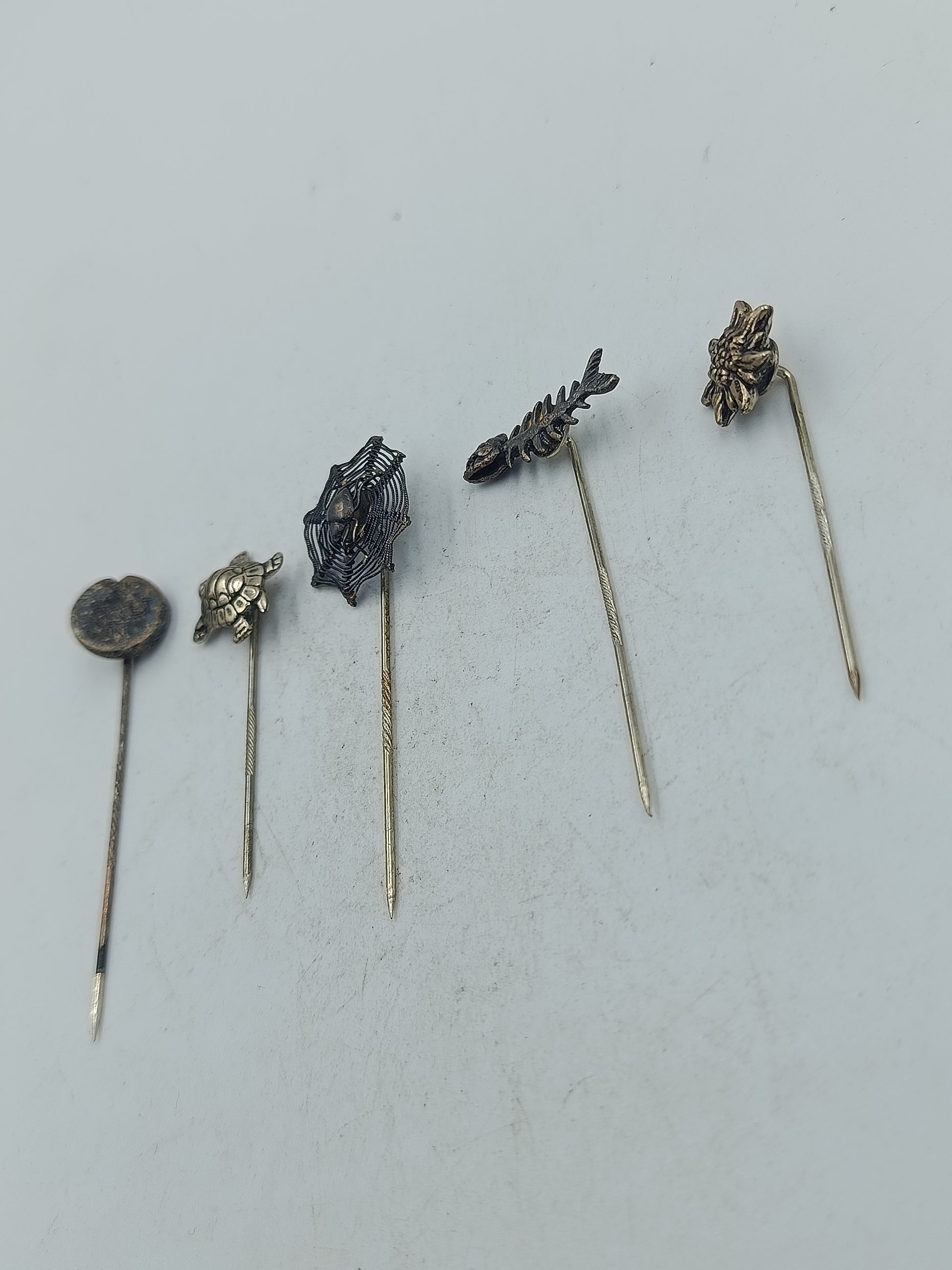 Dieses dekorative Set besteht aus fünf unterschiedlichen Anstecknadeln mit liebevoll gestalteten Motiven aus der Natur und Tierwelt. Die Nadeln zeigen detailreiche Formen und eine schöne altersbedingte Patina die den Vintage Charakter unterstreicht. Ideal für Sammler Liebhaber von Kuriositäten oder als dekoratives Accessoire mit individuellem Stil.