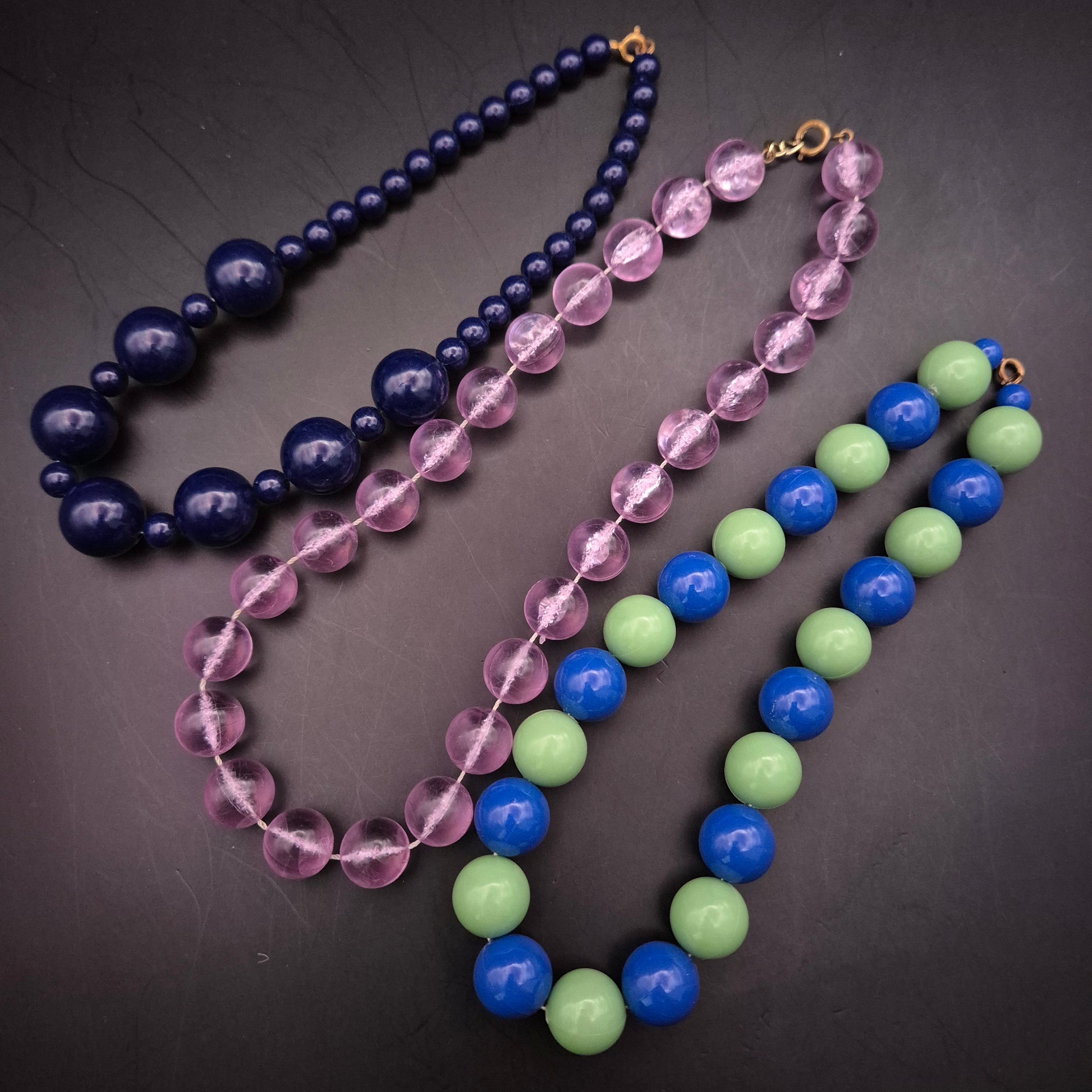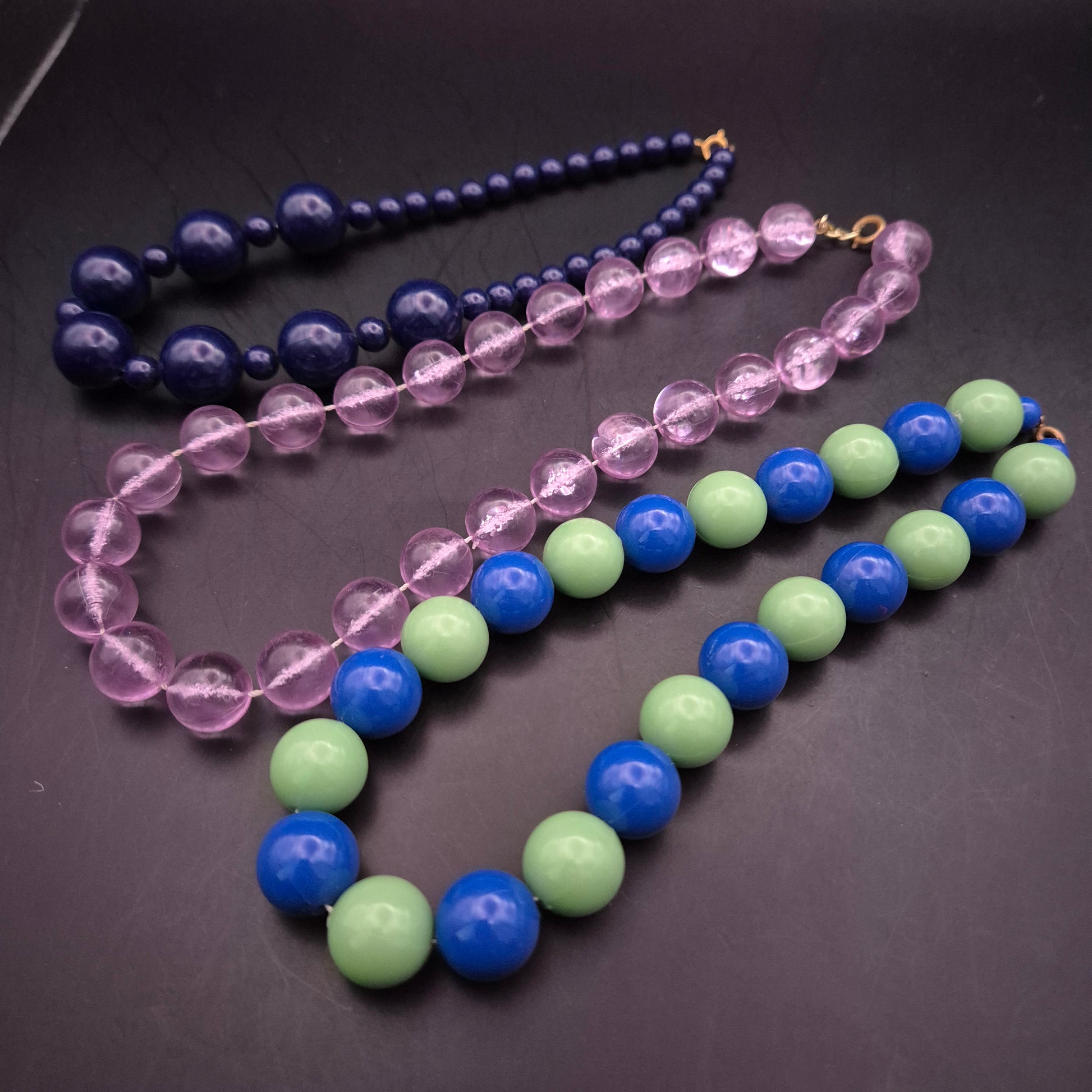 Dieses attraktive Konvolut umfasst drei markante Damen-Halsketten, die jeweils ein individuelles Statement setzen. Die dunkelblaue Kette besteht aus zwei Reihen glänzender und matter Kunststoff- oder Harzperlen, die einen eleganten Kontrast bilden. Die mittlere Kette besticht durch große, facettierte Perlen in einem zarten, durchscheinenden Lila/Rosa, die bei Lichteinfall schön funkeln. Die dritte Kette kombiniert frische, glänzende Perlen in kräftigem Royalblau und hellem Mintgrün für einen verspielten, sommerlichen Look. Alle Ketten verfügen über einfache, goldfarbene Verschlüsse. Sie sind perfekt, um jedem Outfit einen Vintage- oder Pop-Akzent zu verleihen.