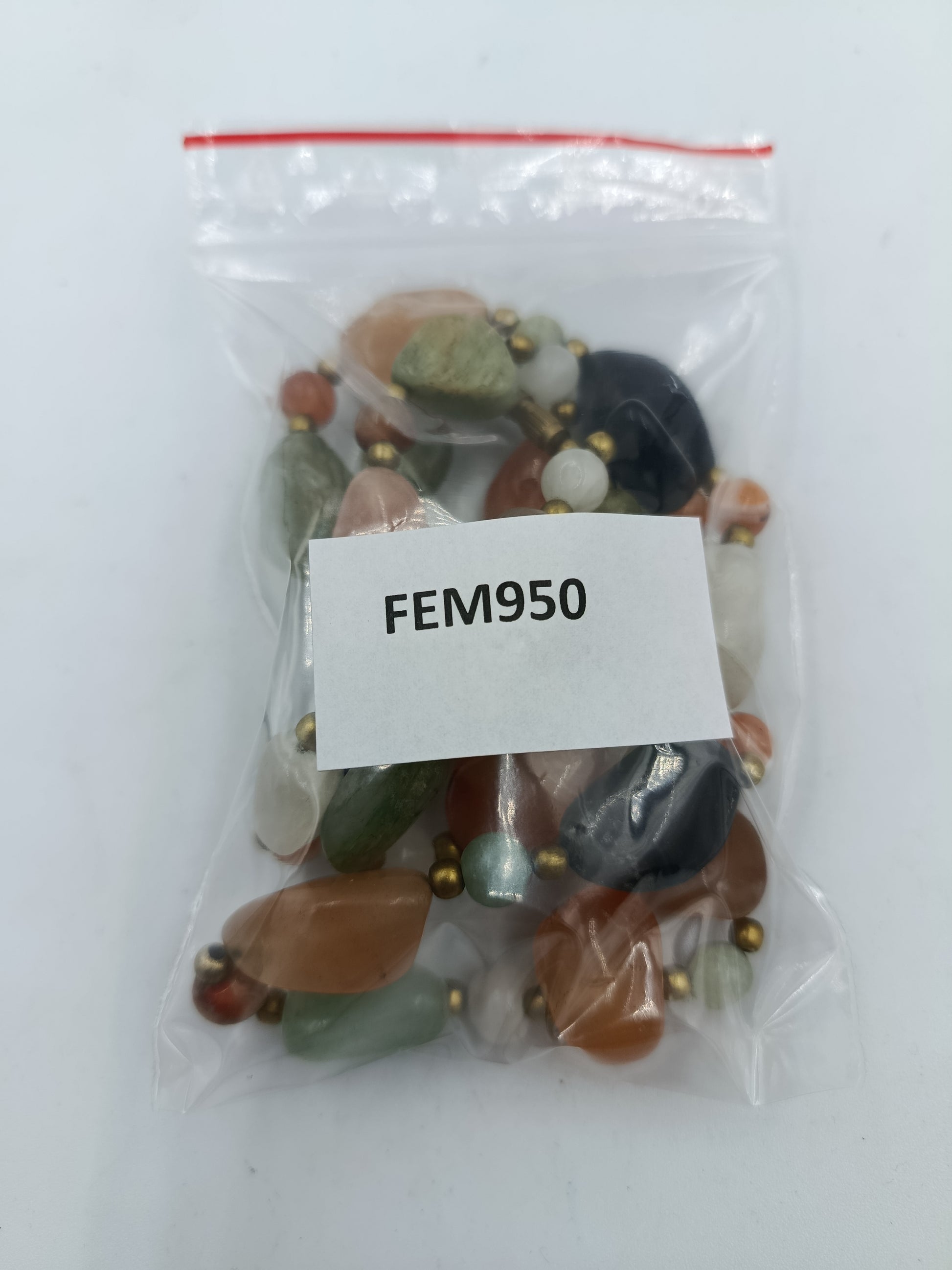 Schöne Edelstein Kette mit unterschiedlich geformten, polierten Trommelsteinen in warmen Naturtönen. Die Kombination aus Grün, Orange, Schwarz und Weiß wird durch kleine Messingperlen harmonisch ergänzt – ein echter Blickfang im Ethno-Stil.