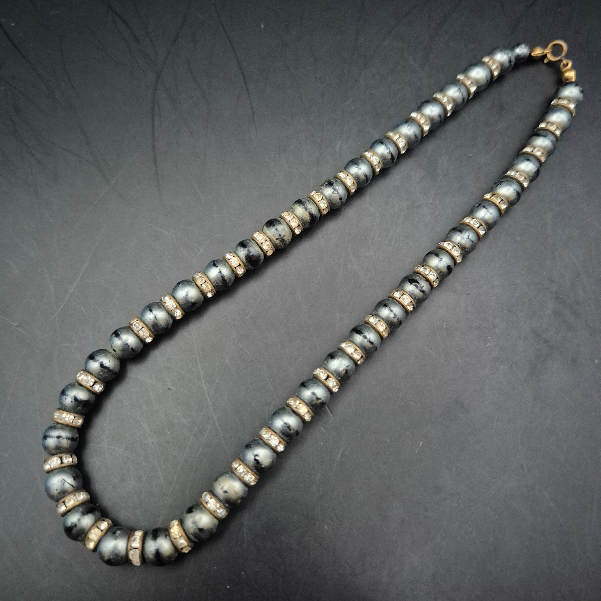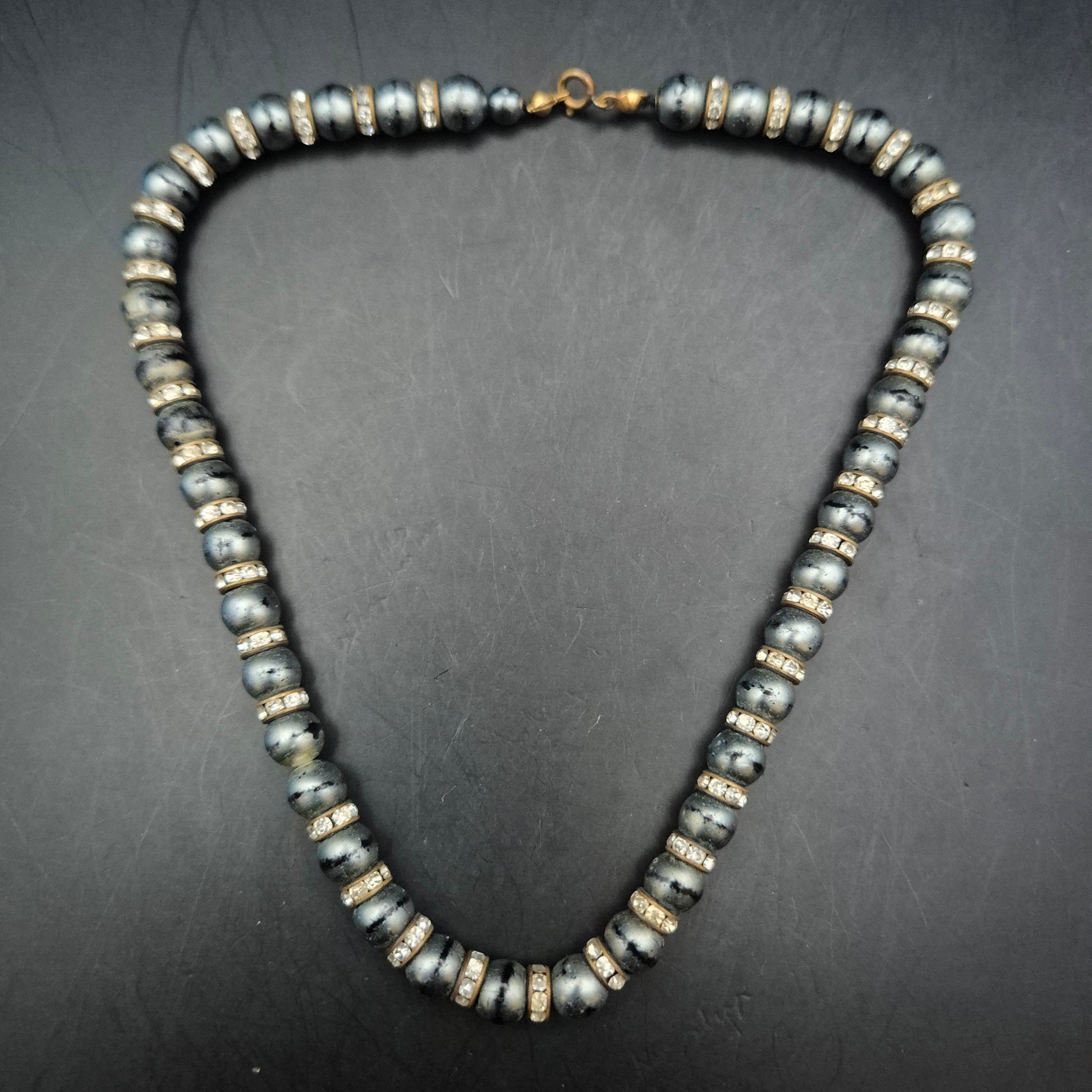 Diese glamouröse Damen-Halskette besticht durch ihre Kombination aus schimmernden, dunkelgrauen Perlen und funkelnden Strass-Elementen. Die unregelmäßig geformten, schillernden Perlen wechseln sich ab mit breiten goldfarbenen Ringen, die dicht mit klaren Strasssteinen besetzt sind. Dieses Design schafft einen dramatischen, luxuriösen Look, ideal für Abendveranstaltungen oder um einem schlichten Outfit einen Hauch von Opulenz zu verleihen. Die Kette ist kurz geschnitten und liegt als Collier eng am Hals an, gesichert durch einen goldfarbenen Verschluss. Details: