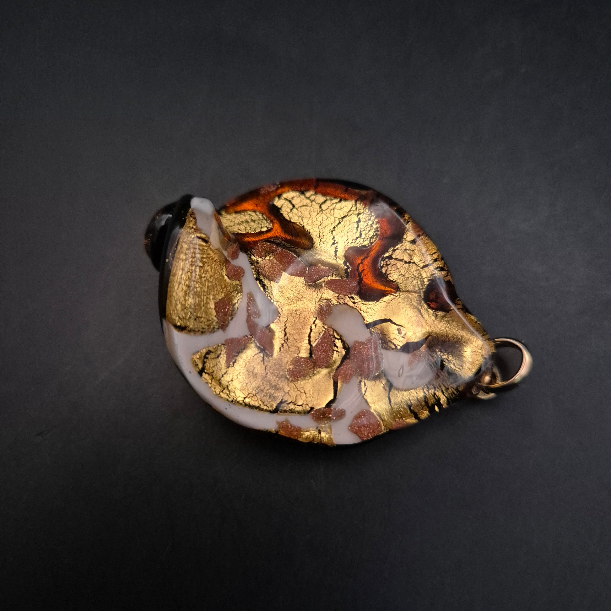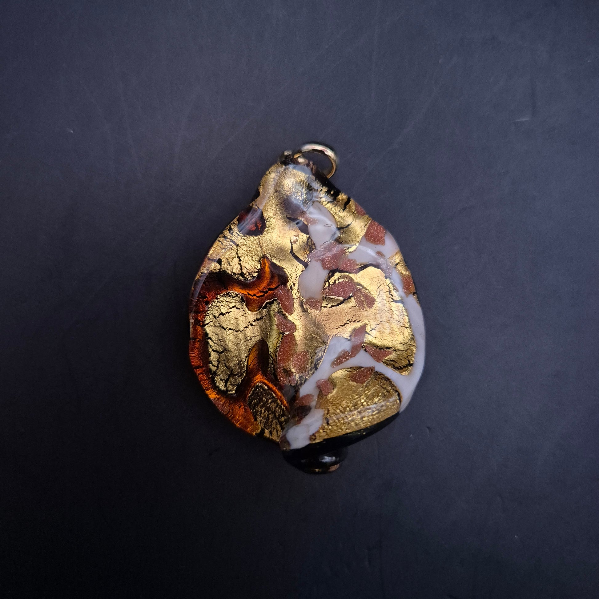Dieser exquisite Damen-Anhänger in einer organischen, leicht gewölbten Form besticht durch seine aufwendige Glastechnik im Murano-Stil. Die Vorderseite präsentiert ein dramatisches Farbspiel: Tiefschwarzes Glas bildet die Basis, durchzogen von cremefarbenen oder weißen Einschlüssen sowie reichlich goldfarbener Metallfolie und schimmerndem Kupferglitter (Aventuringlas-Effekt). Das Muster ist abstrakt und opulent, wobei die Goldakzente im Licht leuchten und dem Schmuckstück einen Hauch von Luxus verleihen. Der Anhänger besitzt eine goldfarbene Öse und ist ein perfektes Statement-Piece für eine schlichte Kette oder ein Lederband.