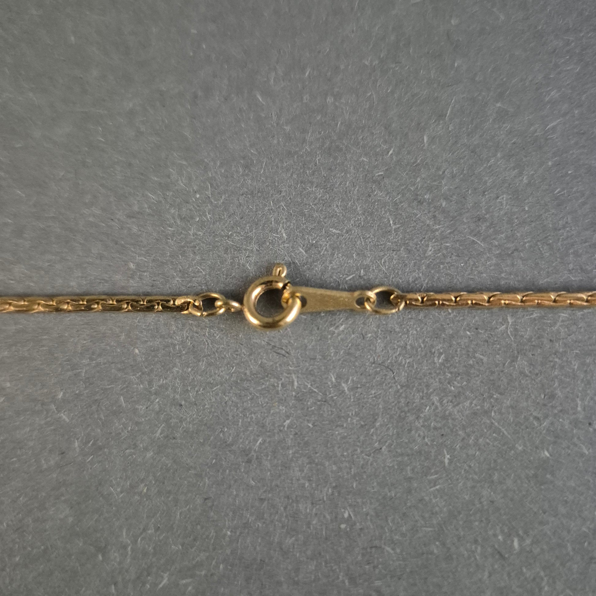 Diese filigrane Vintage-Goldkette vereint schlichte Eleganz mit zeitlosem Design. Das zentrale Element ist kunstvoll gewunden und verleiht dem Schmuckstück eine edle, feminine Note. Die feine Gliederkette sorgt für einen angenehmen Tragekomfort und rundet das stilvolle Erscheinungsbild harmonisch ab. Perfekt für Liebhaber klassischer Schmuckstücke mit dezentem Charme.