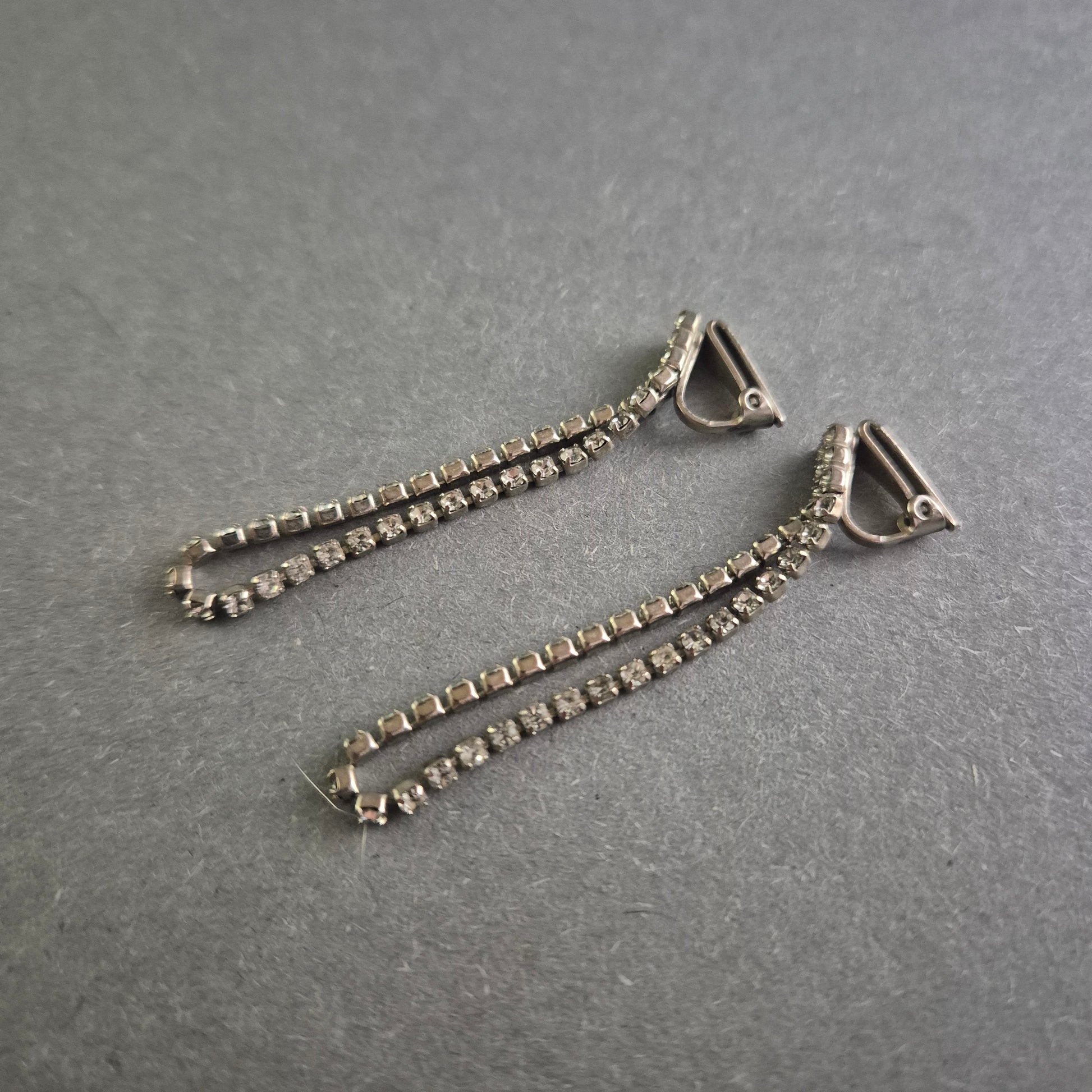 Diese eleganten Vintage-Ohrclips bezaubern durch ihr glamouröses Design mit funkelnden Strasssteinen in zweireihiger Anordnung. Die dezenten silberfarbenen Fassungen verleihen den Clips eine zeitlose Eleganz und machen sie zum perfekten Accessoire für festliche Anlässe oder besondere Momente. Mit ihrem klassischen Look fügen sie jedem Outfit eine edle Note hinzu und strahlen zeitlose Raffinesse aus.
