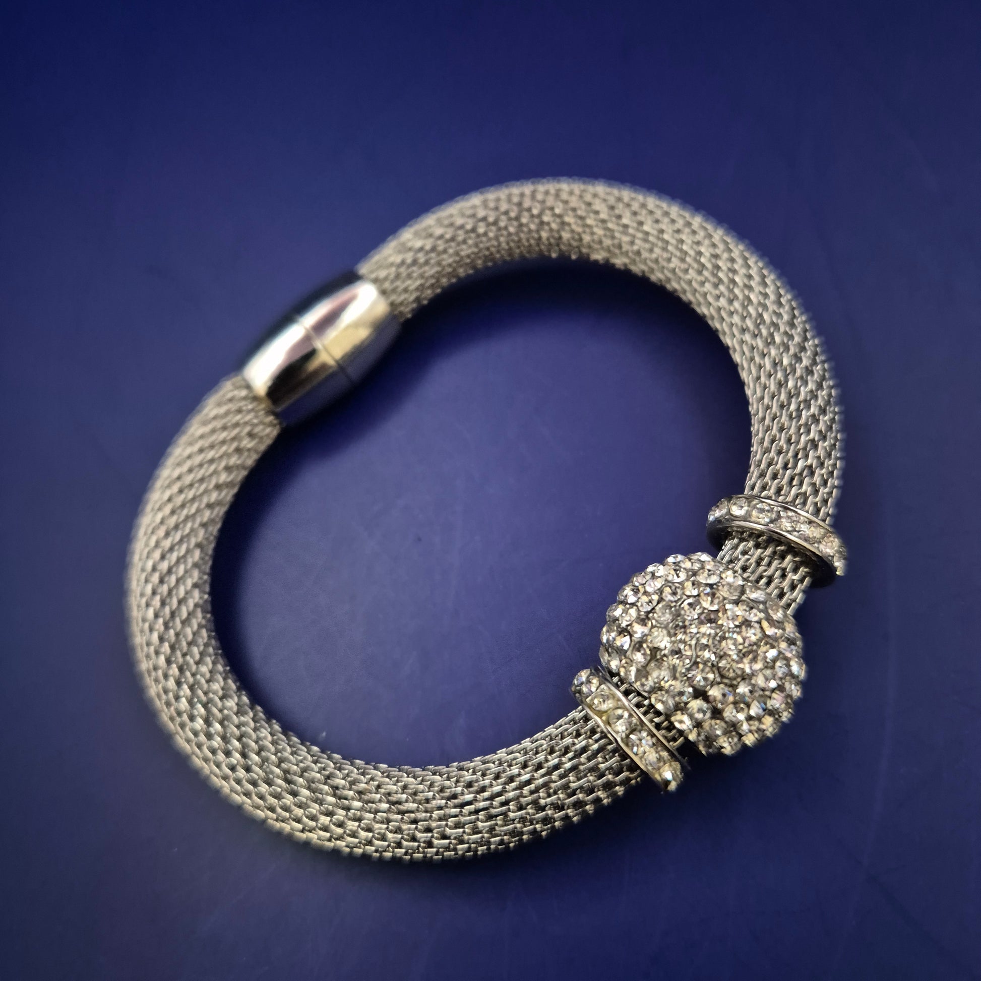 Dieses stilvolle Armband kombiniert modernes Mesh-Design mit funkelnden Akzenten. Der breite, silberfarbene Netzstrang wird von einer auffälligen Kugel mit klaren Strasssteinen sowie zwei funkelnden Ringen geschmückt. Der Magnetverschluss sorgt für einfaches Anlegen und sicheren Halt. Ein ideales Schmuckstück für besondere Anlässe oder um Alltagslooks aufzuwerten.