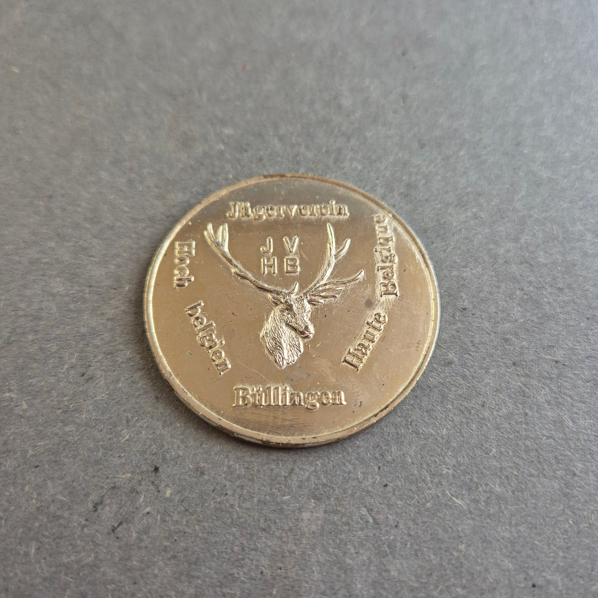 Diese Gedenkmedaille stammt vom Jagdschießen des Jägervereins Büllingen im Jahr 1991. Auf der Vorderseite ist ein stilisiertes Hirschmotiv mit der Inschrift „Jägerverein JVHB Büllingen – Hoch halten – Heute Bekennen“ eingeprägt. Die Rückseite trägt den Text „JAGD SCHIESSEN 1991“ sowie die Prägung „INSIGNA“. Ein geschichtsträchtiges Sammlerstück für Liebhaber von Jagdtraditionen und historischen Vereinsmedaillen.