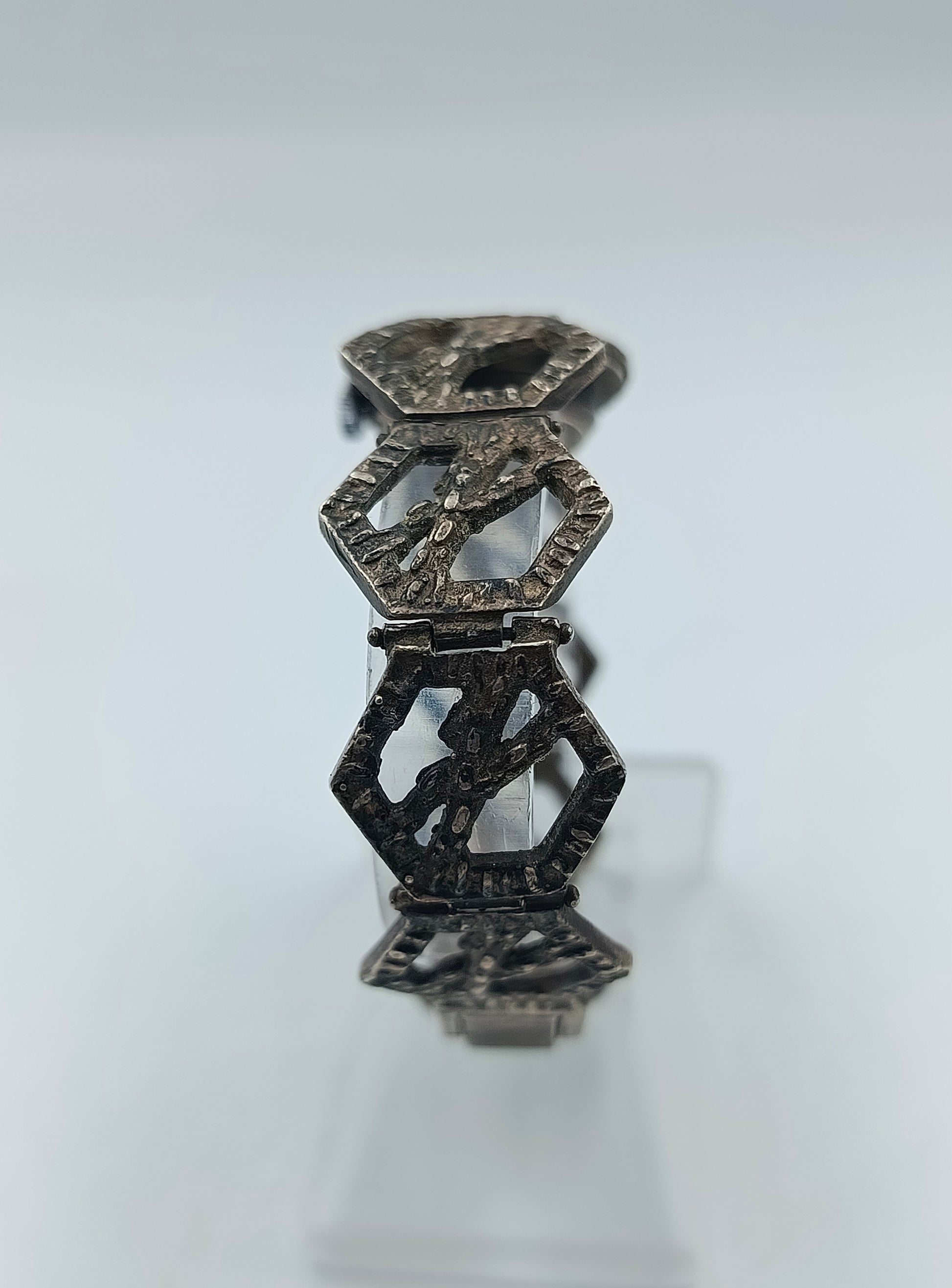 Ausdrucksstarke Vintage-Armbanduhr der Marke Eura aus 800er Silber. Das massive Gliederdesign mit strukturierten Oberflächen verleiht der Uhr einen markanten Charakter. Auf dem dunklen Zifferblatt sorgen silberfarbene Indizes und Zeiger für guten Kontrast. Ein außergewöhnliches Sammlerstück mit historischem Charme.