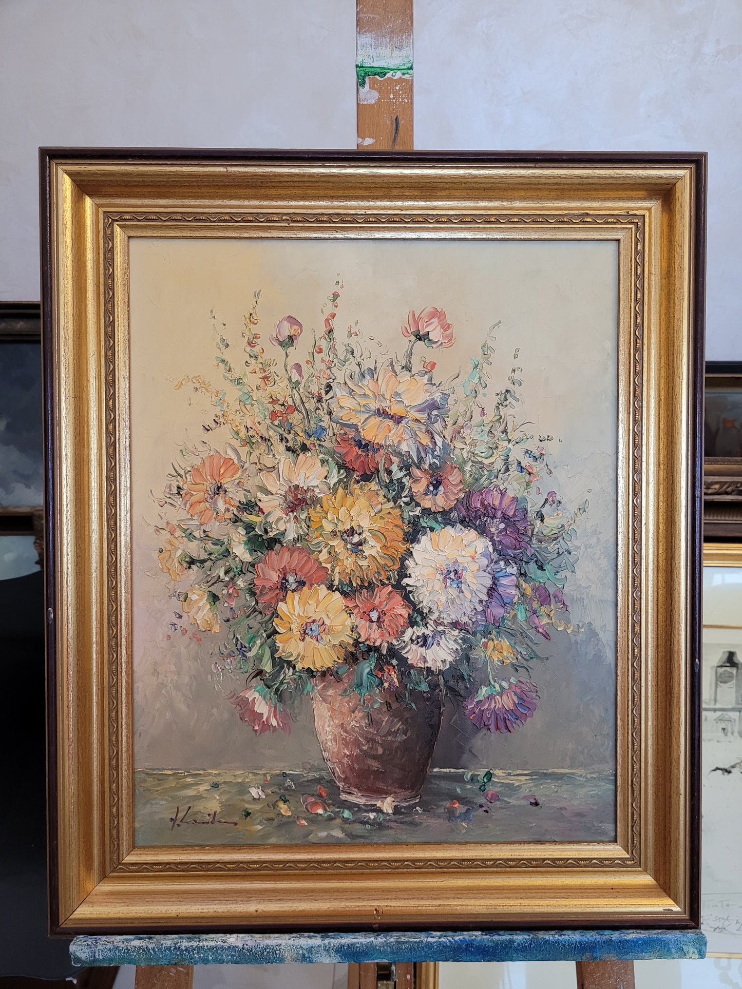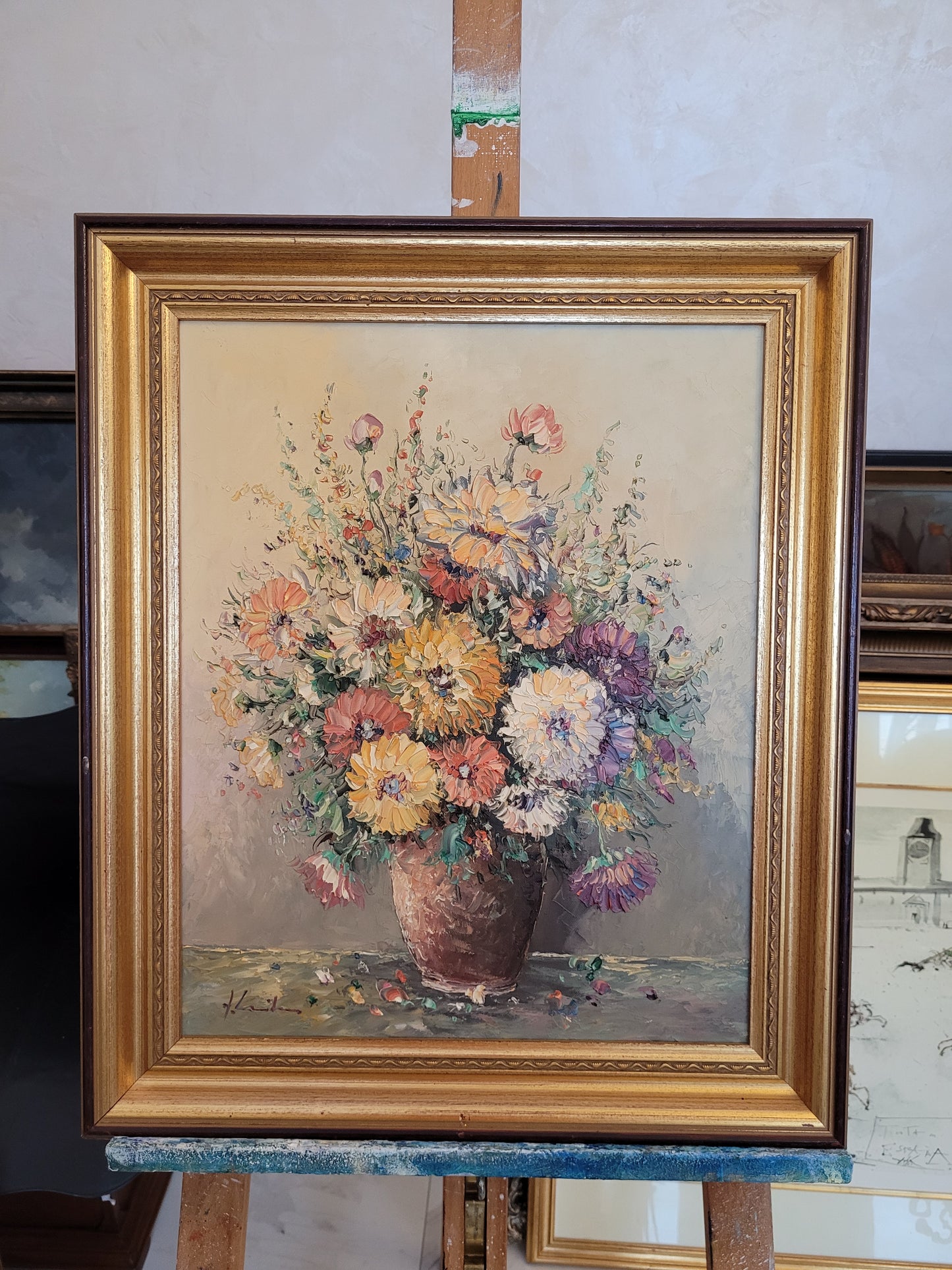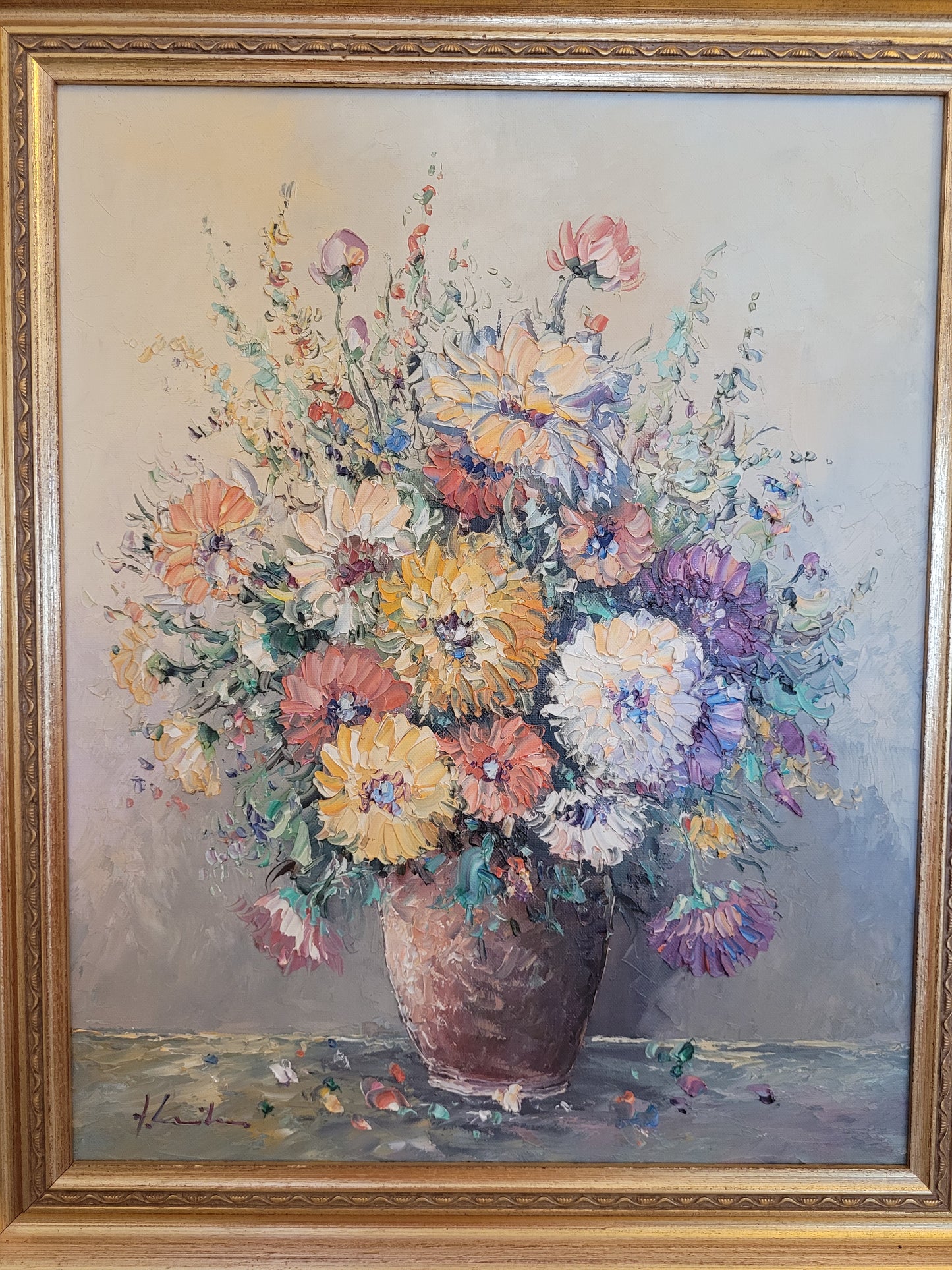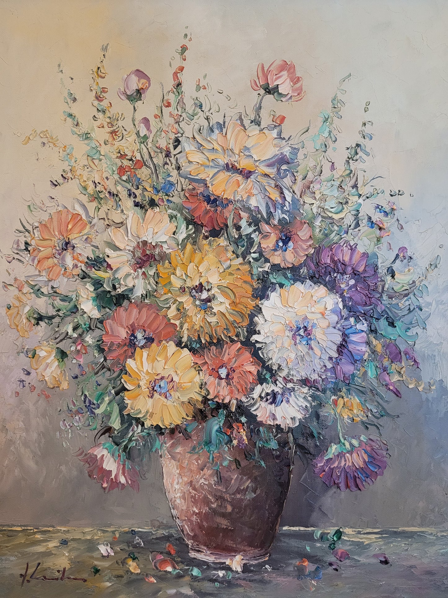 Beschreibung: Dieses beeindruckende Ölgemälde der europäischen Schule (XX) präsentiert ein kräftiges Blumenstillleben in lebendigen Farben. Das Kunstwerk ist auf hochwertiger Leinwand gemalt und von Hand signiert.