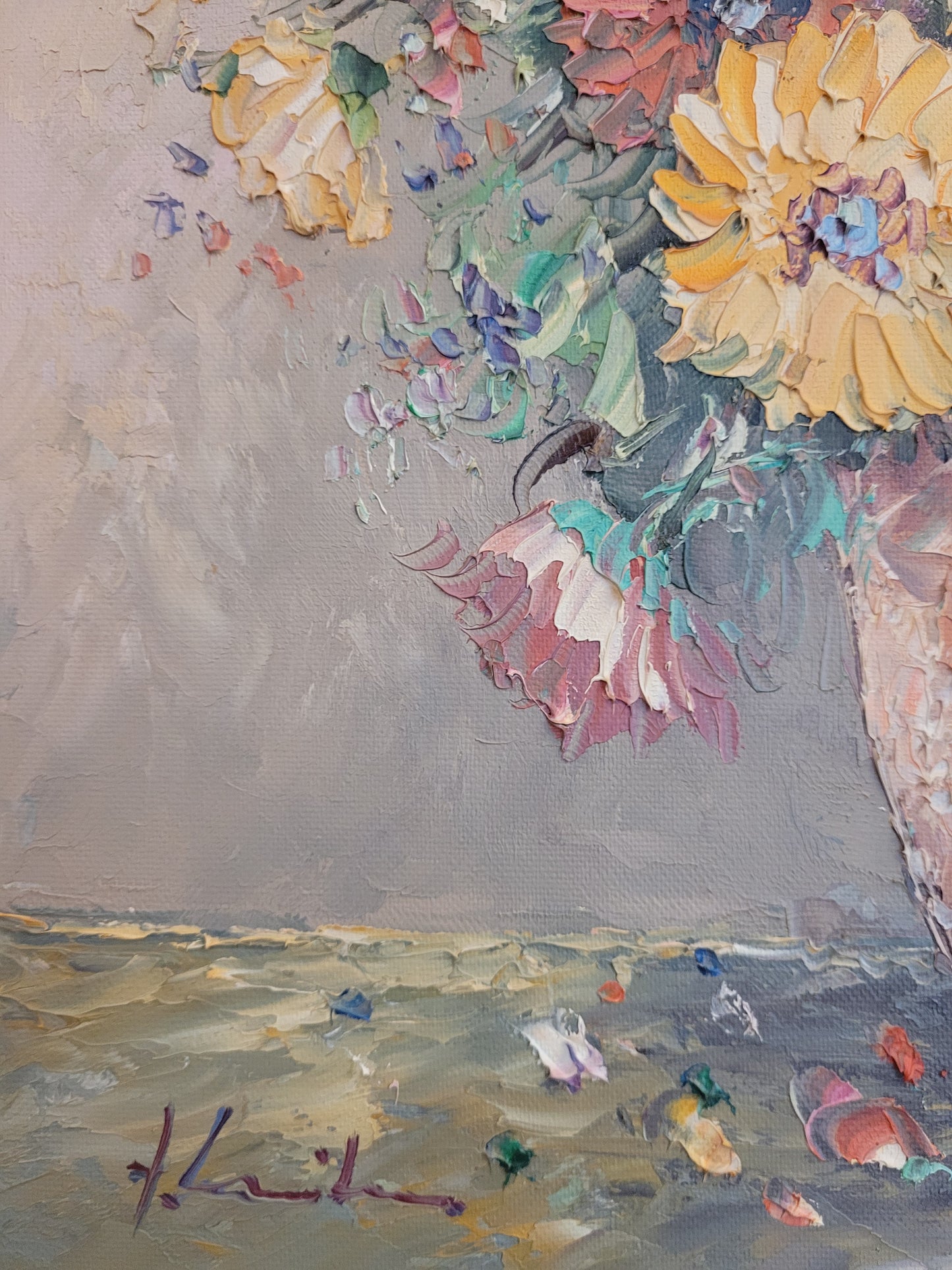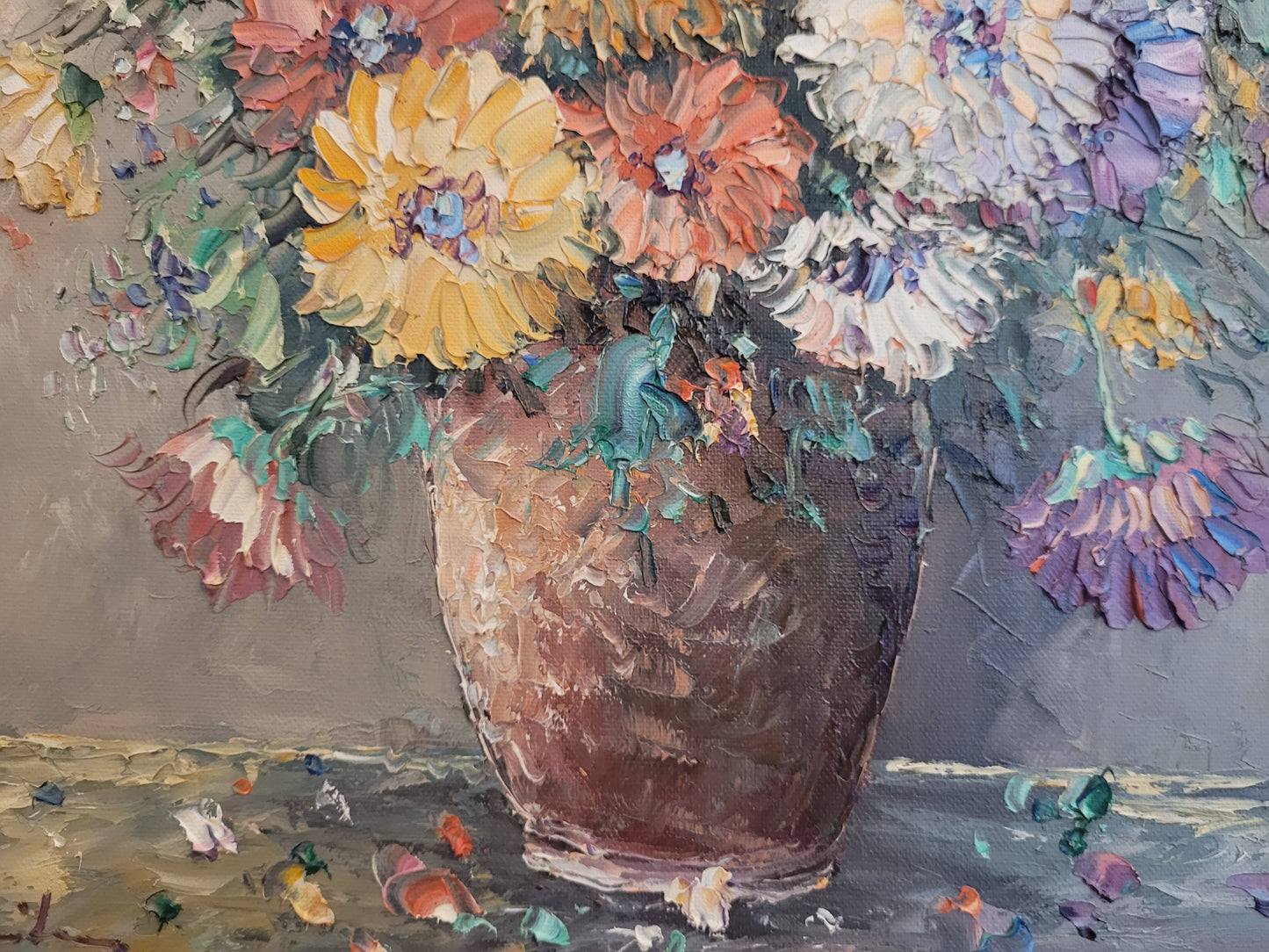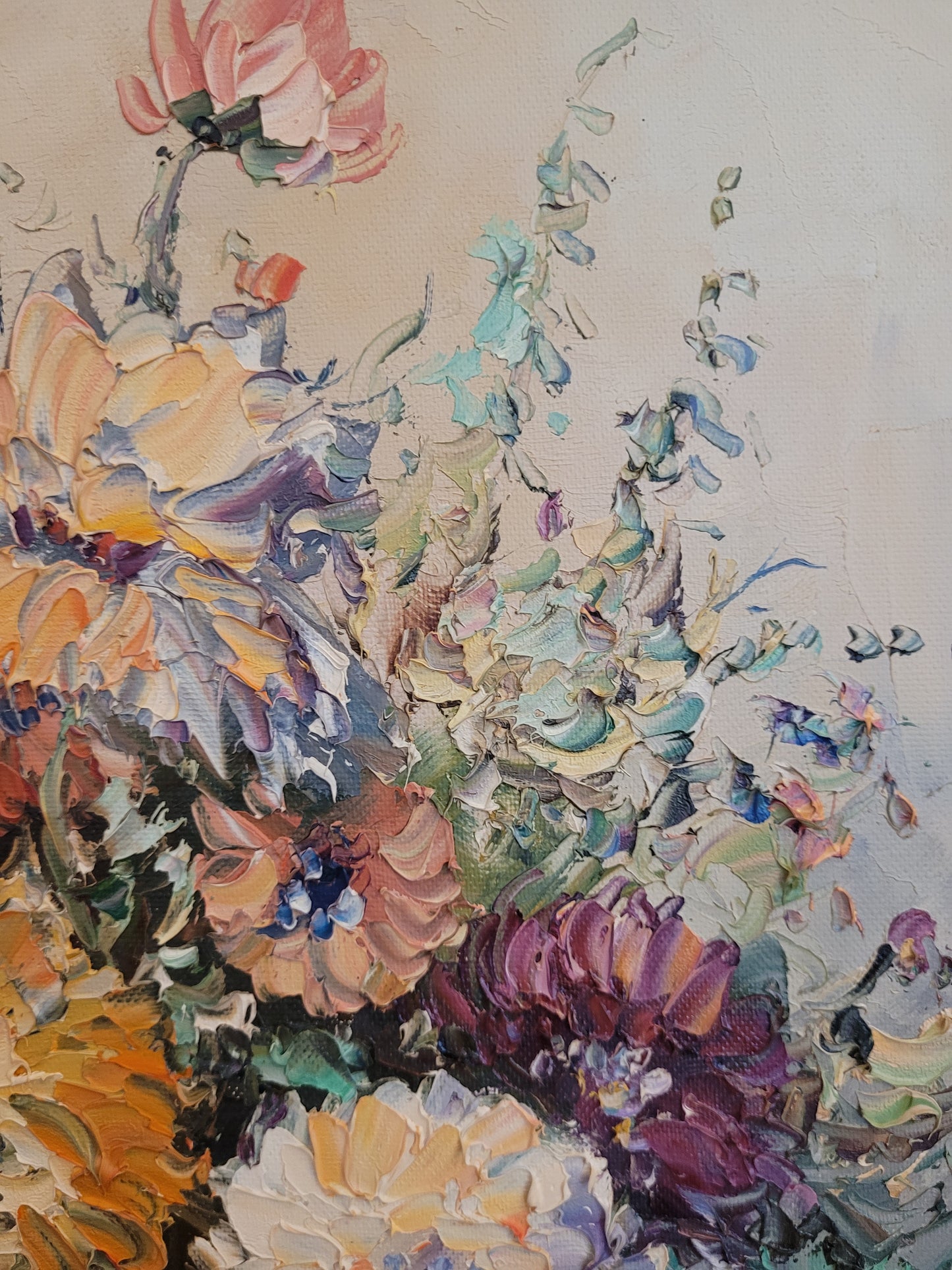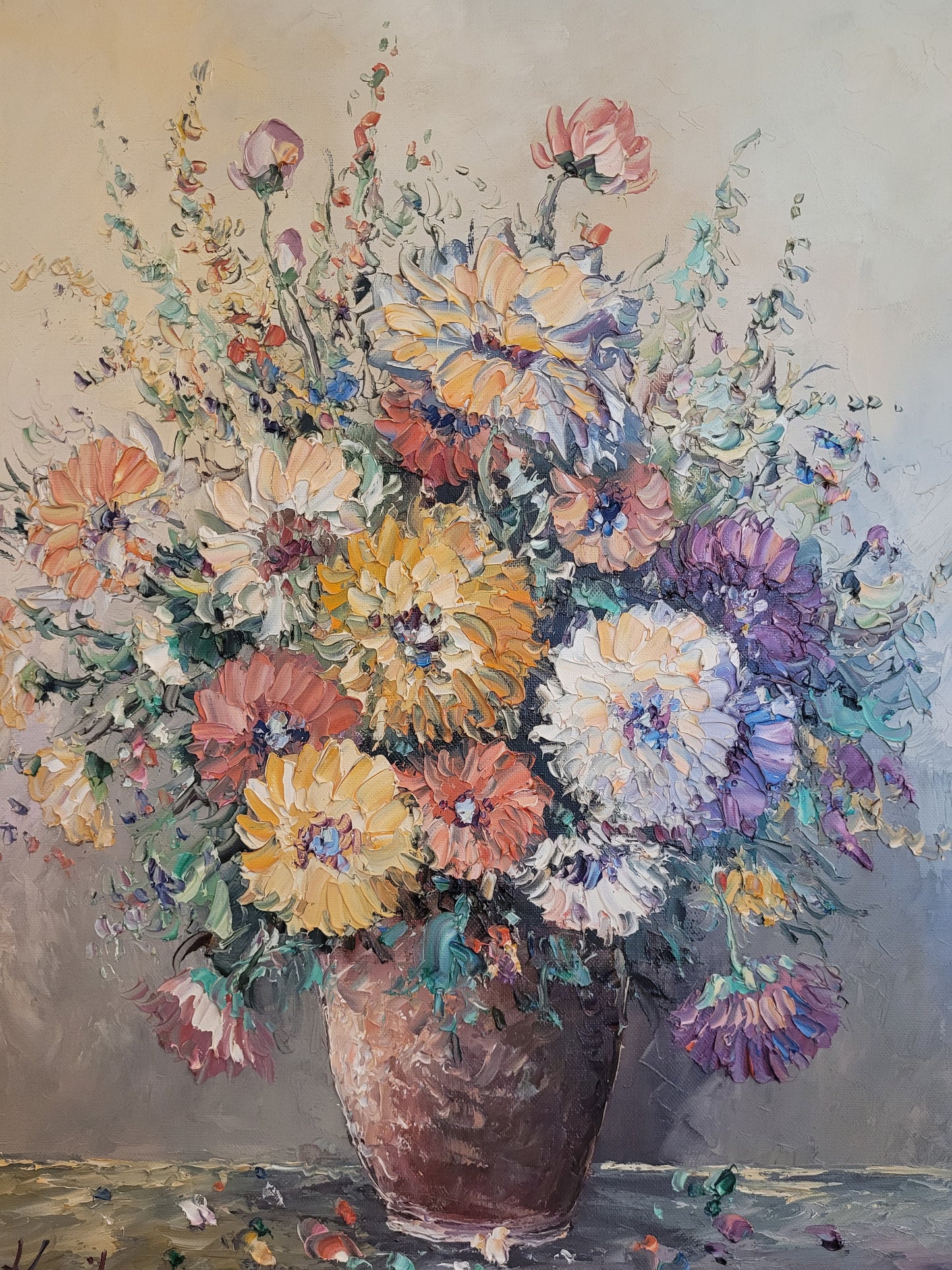 Die kraftvollen Farben und die geschickte Pinselarbeit machen dieses Gemälde zu einem ausdrucksstarken Kunstwerk. Es ist eine wunderbare Ergänzung für jeden Kunstliebhaber, der die Schönheit und Energie von Blumenstillleben schätzt.
