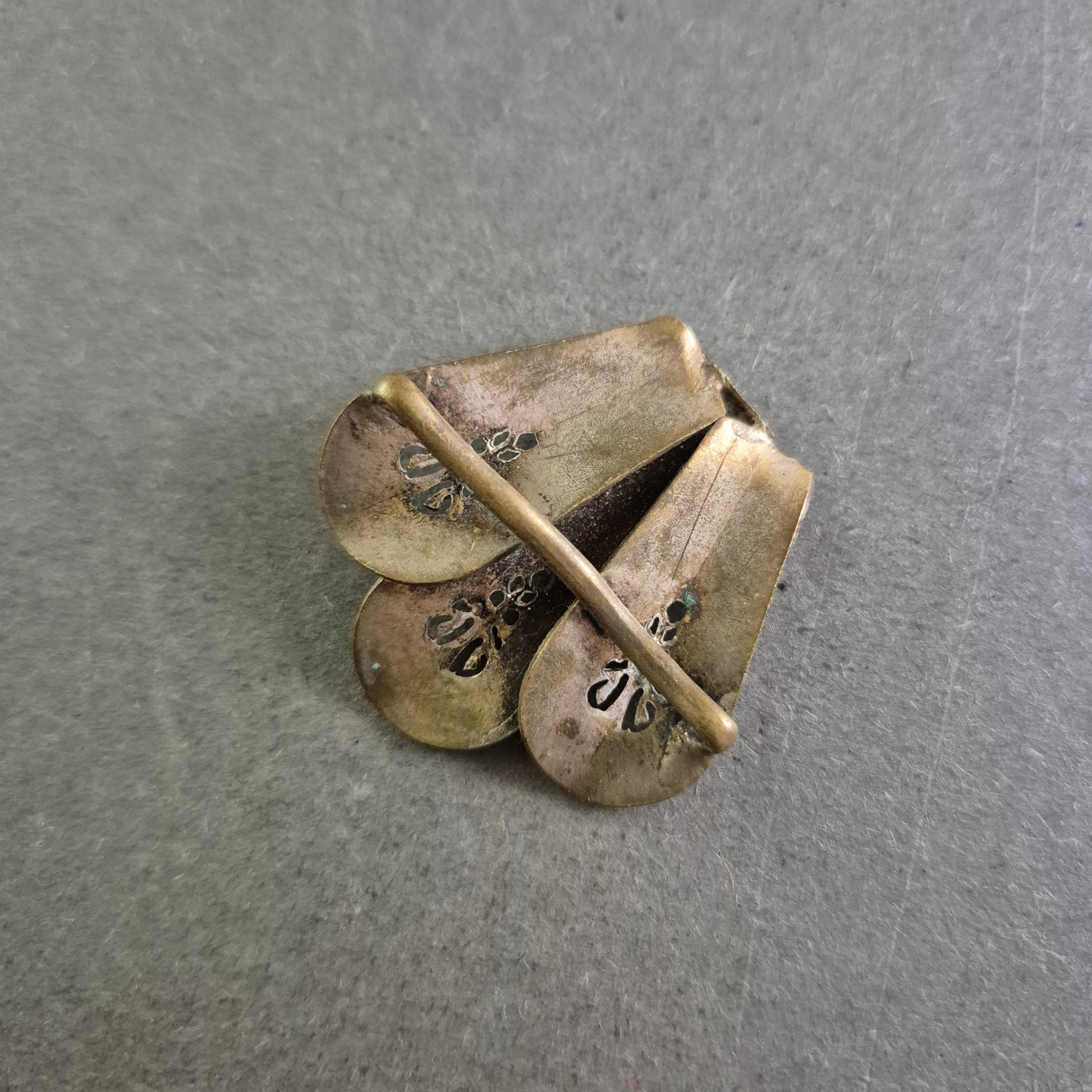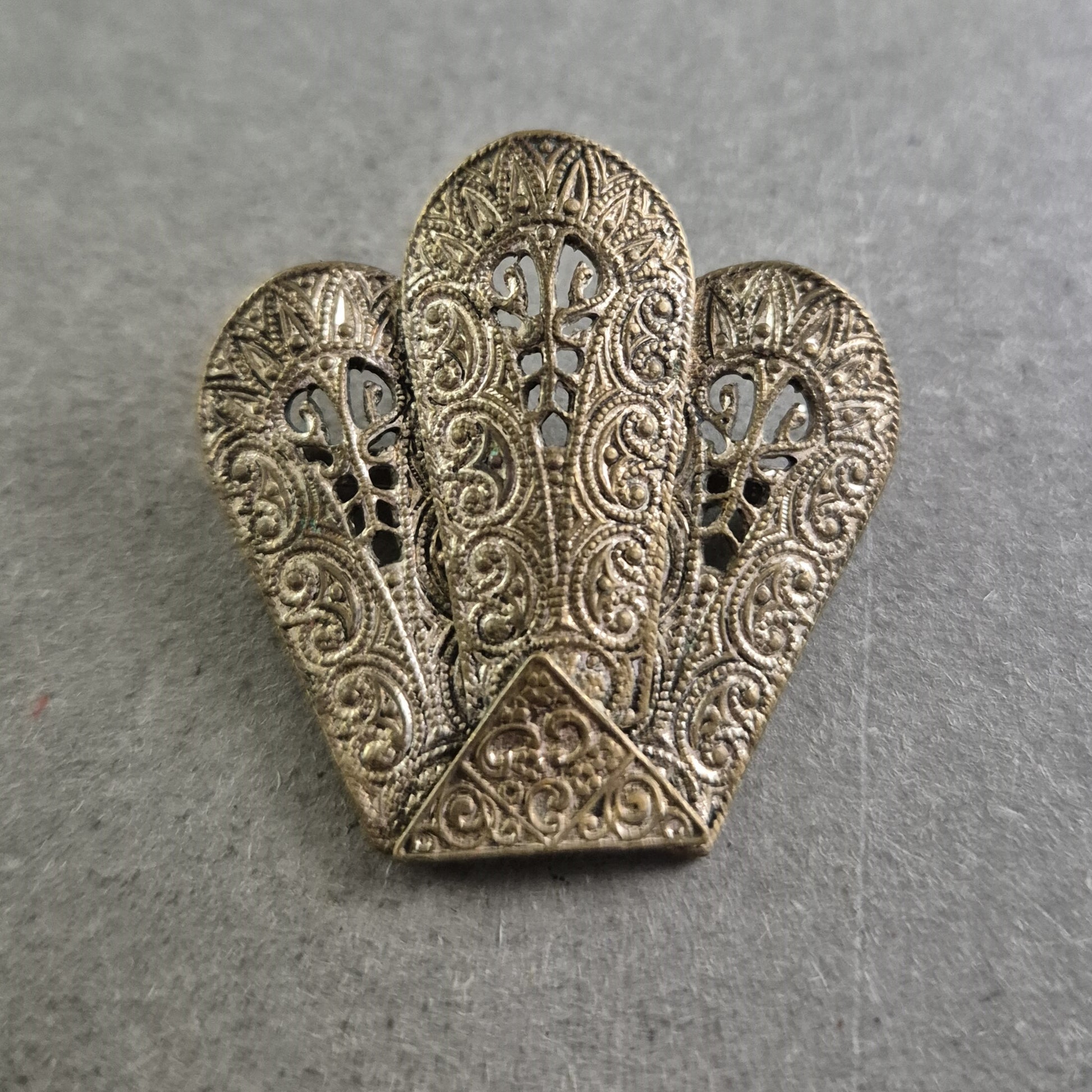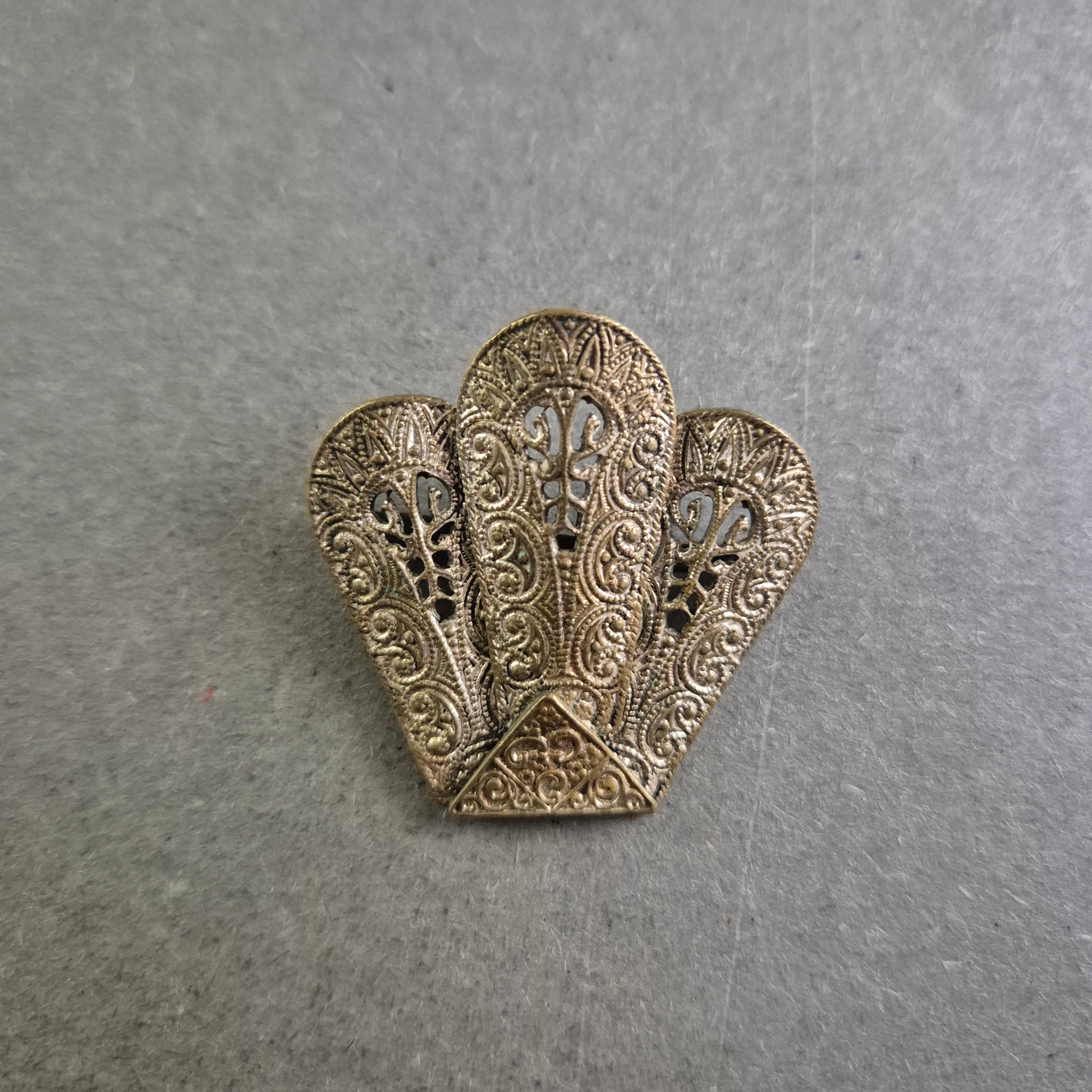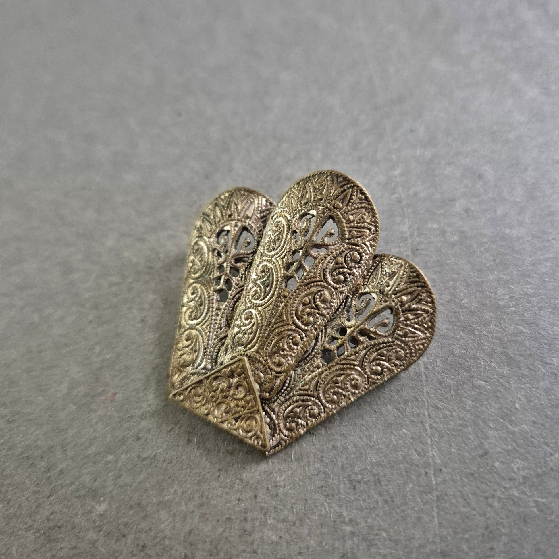 Diese kunstvolle Brosche in Form eines dreifachen Fächers begeistert mit ihrem detailreichen und ornamentalen Design. Die feine Gravur auf der Vorderseite erinnert an traditionelle Handwerkskunst und verleiht dem Schmuckstück eine antike Ausstrahlung. Rückseitig ist eine klassische Nadelmechanik angebracht, die das Anbringen an Kleidung oder Tuch erleichtert. Ein ausdrucksstarkes Accessoire für Vintage-Liebhaber.