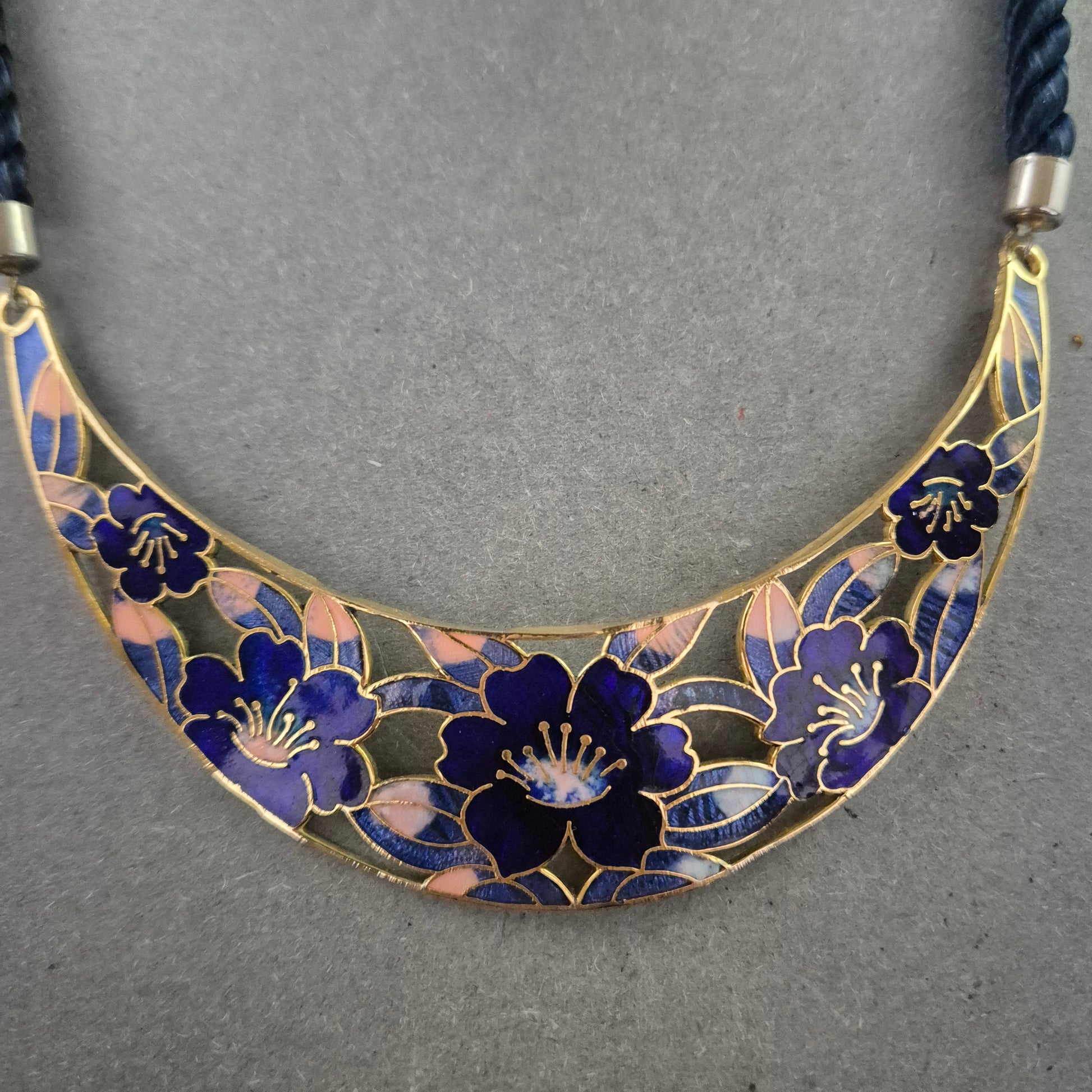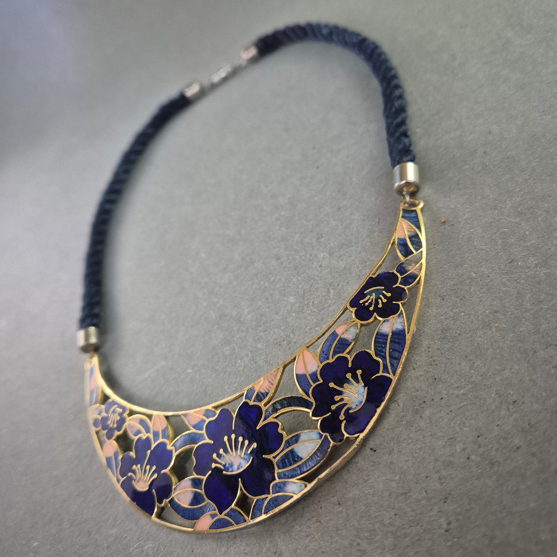 Dieses auffällige Collier ist ein wahres Kunstwerk und verbindet florale Eleganz mit traditioneller Emaillekunst. Die goldfarben eingefassten Blütenmotive in Violett und Rosé verleihen dem Halsschmuck einen luxuriösen Look, während das dunkelblaue Textilband für einen angenehmen Tragekomfort sorgt. Ideal für stilbewusste Trägerinnen, die gerne ein Statement setzen.