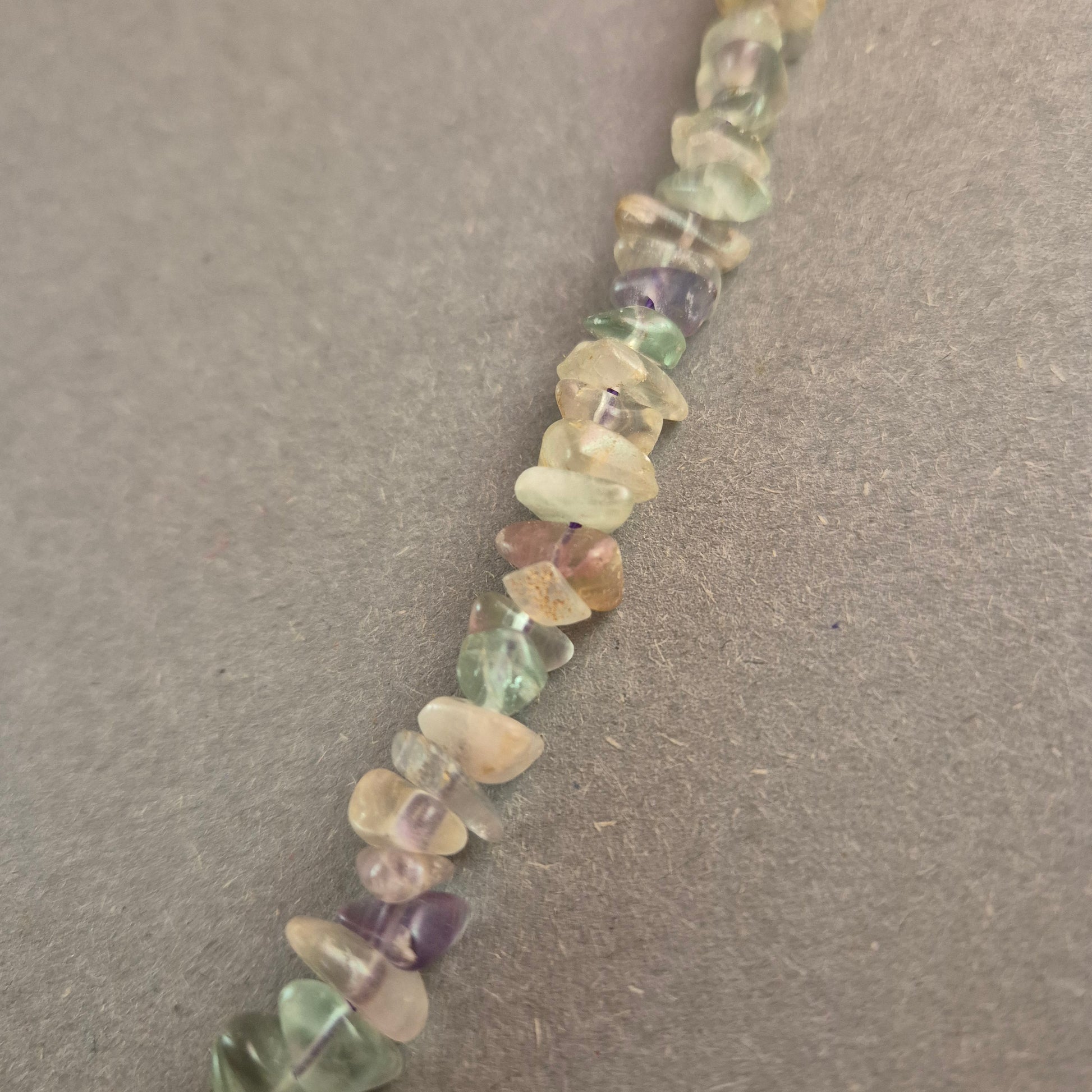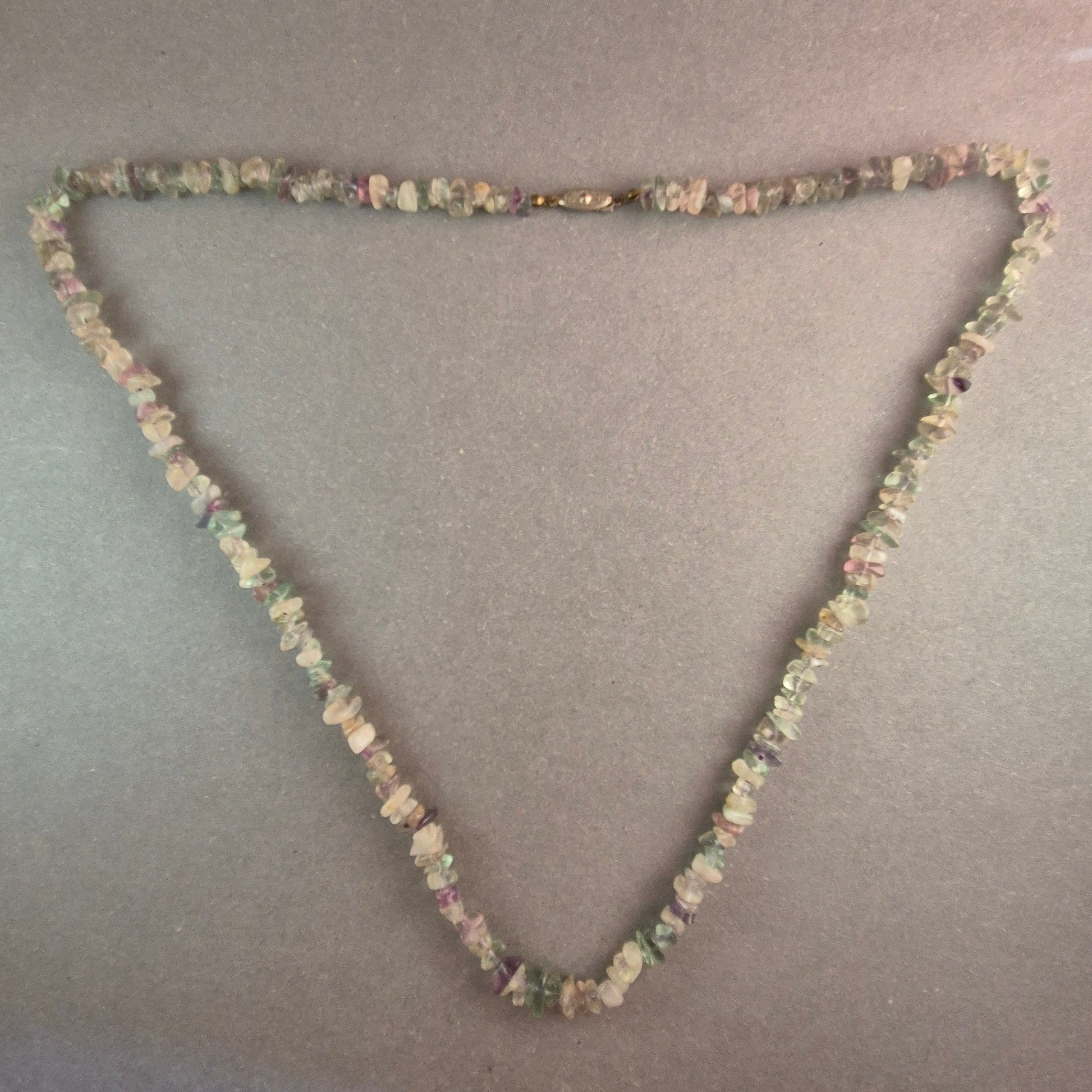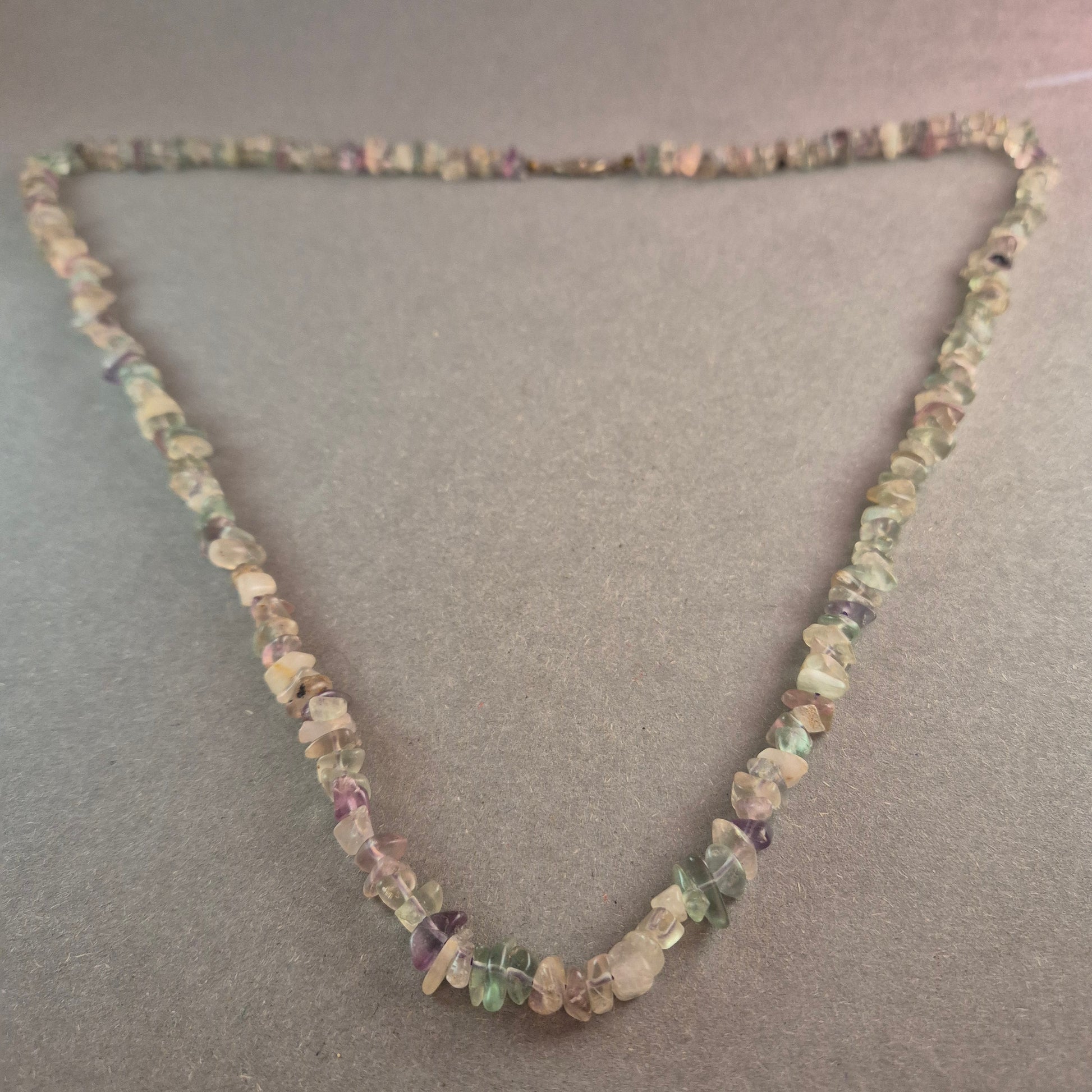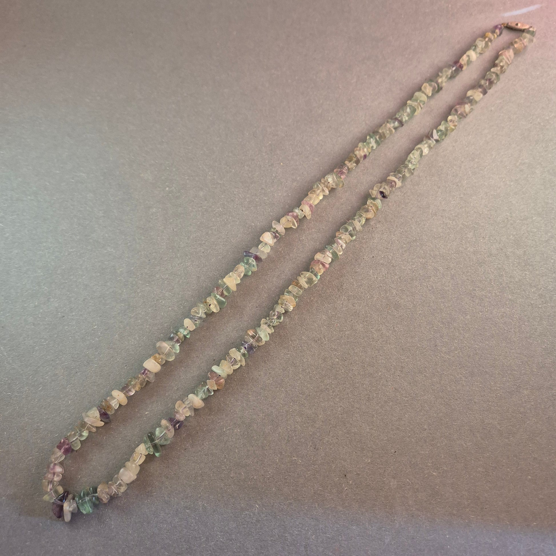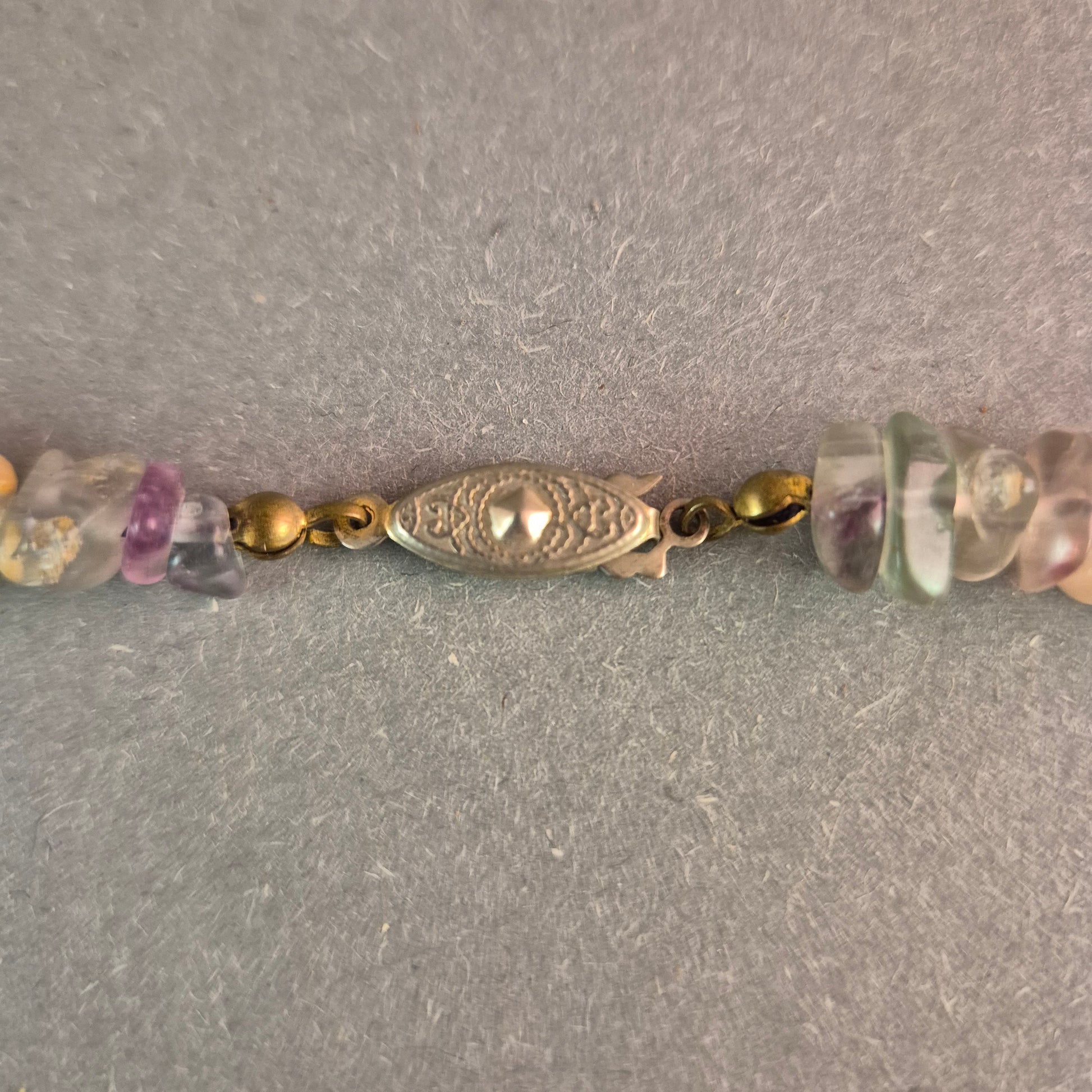 Diese wunderschöne Halskette aus Fluorit-Edelsteinen besticht durch ihre sanften, natürlichen Farbnuancen von Grün, Lila und Transparent. Die einzelnen Fluorit-Chips sind kunstvoll aneinandergereiht und sorgen für einen einzigartigen, organischen Look. Der stilvolle Vintage-Verschluss mit filigraner Verzierung rundet das Design ab und macht die Kette zu einem besonderen Schmuckstück für Liebhaber von Natursteinen und Vintage-Schmuck.