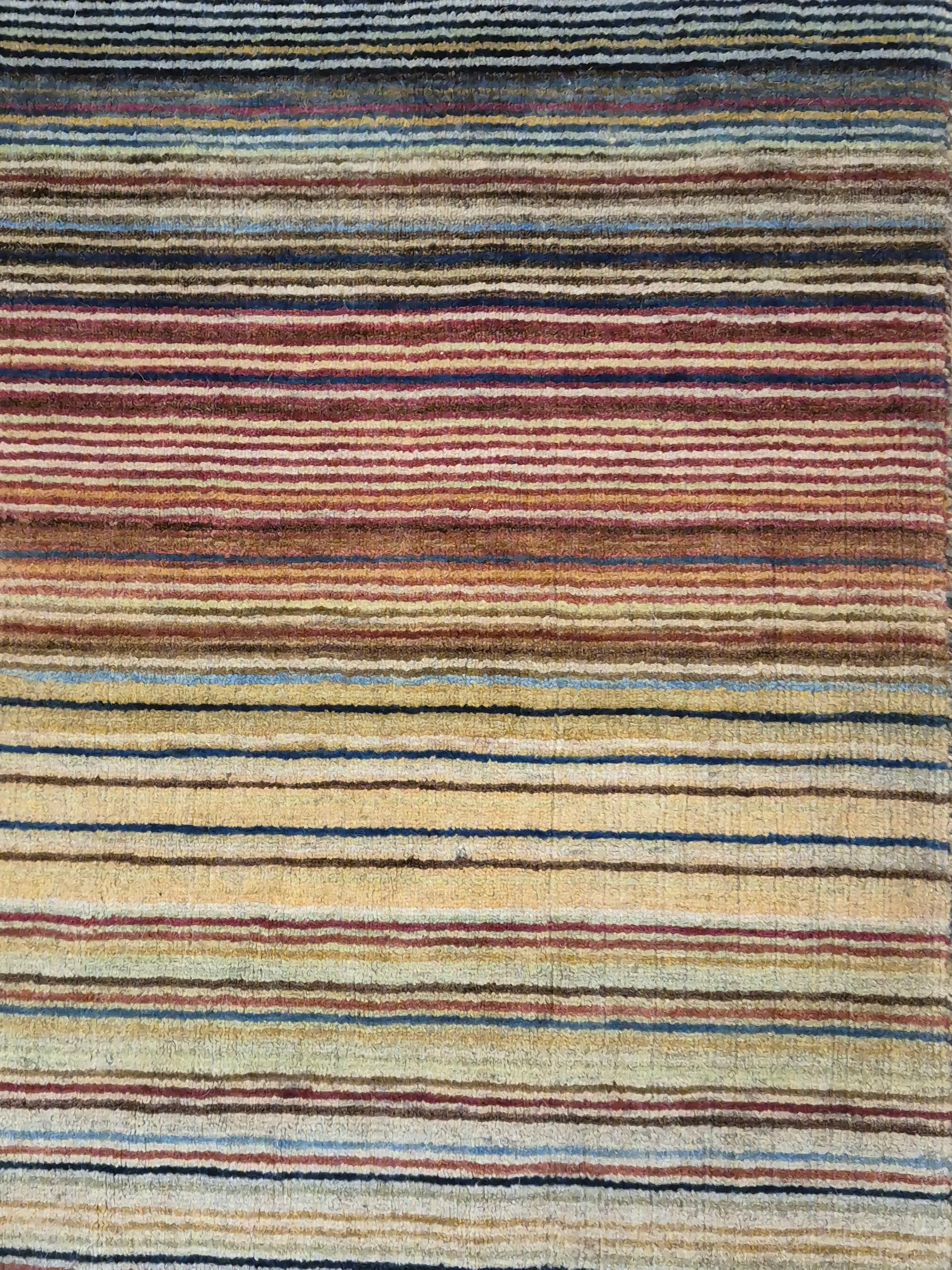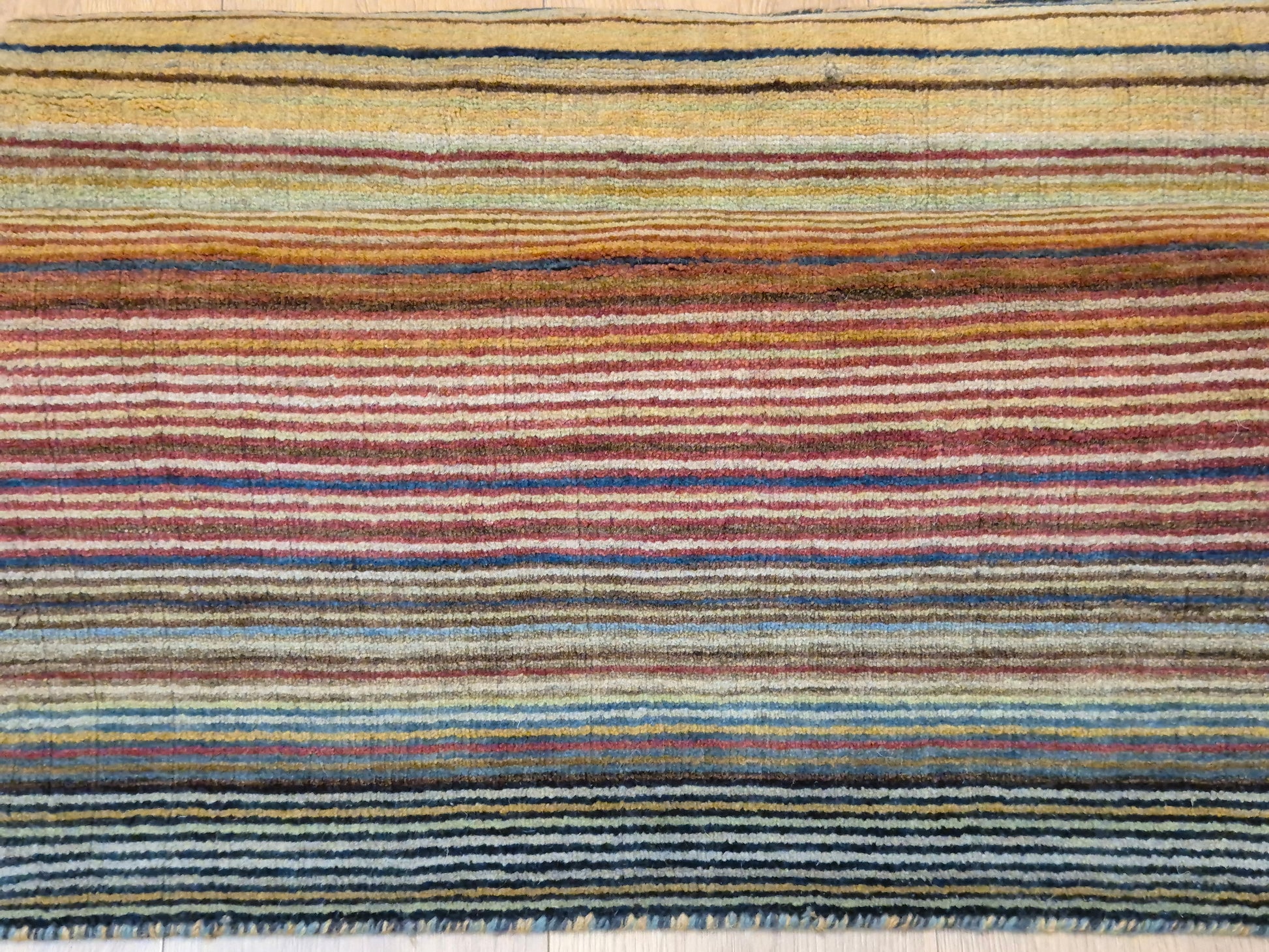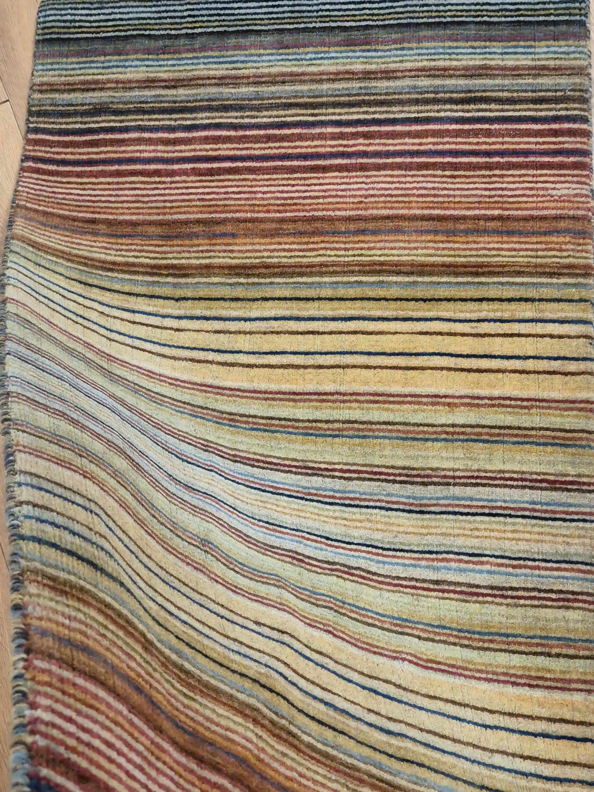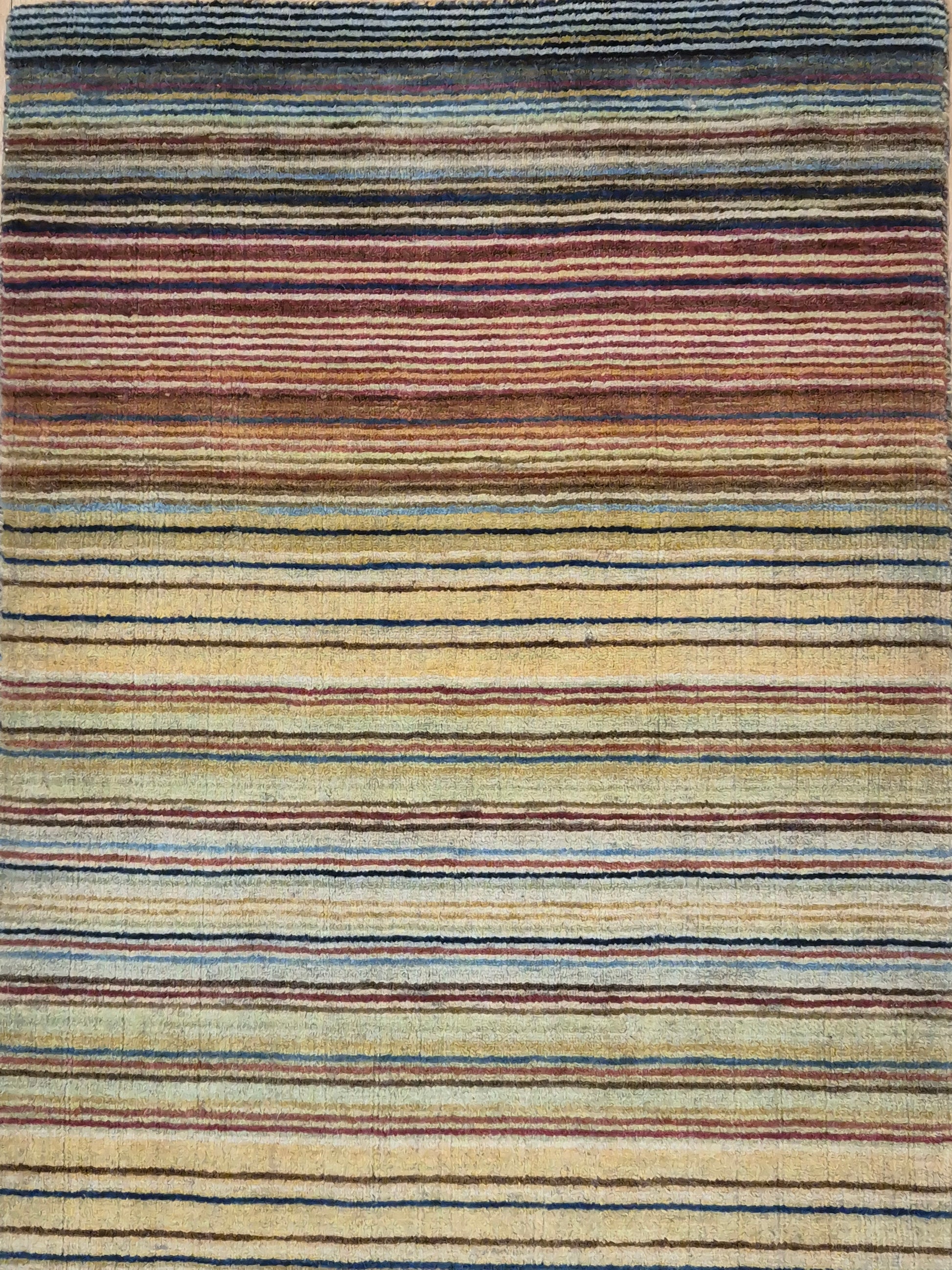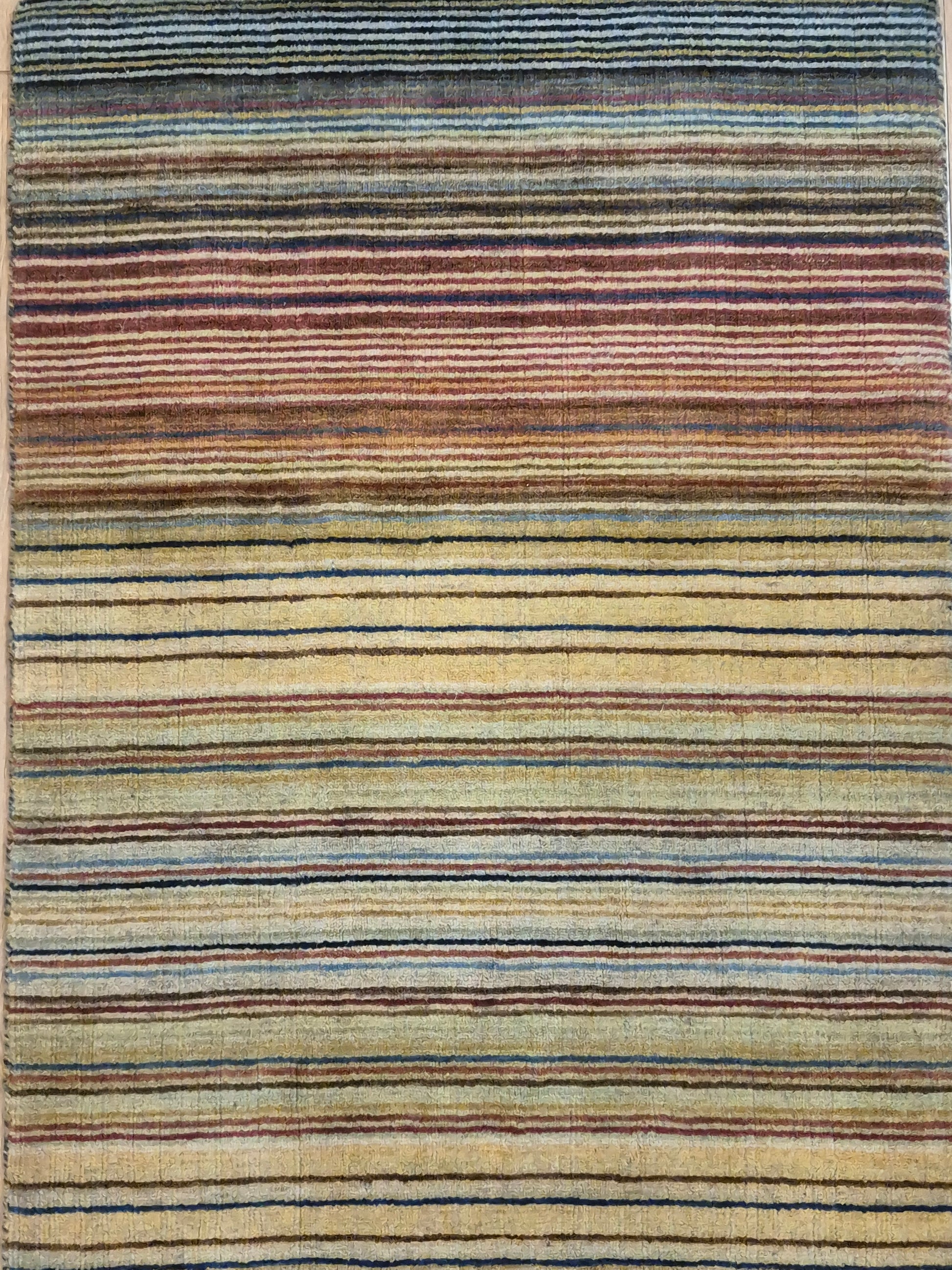 angeboten wird ein charmanter Gabbeh Teppich aus reiner Schurwolle, handgeknüpft in traditioneller Knüpfkunst. Das Design ist von lebhaften Streifenmustern geprägt, die in harmonischer Reihenfolge von warmen Rot- und Brauntönen über Gelb bis hin zu kühlem Blau und Grün verlaufen. Diese farbliche Vielfalt verleiht dem Teppich eine moderne, zugleich naturverbundene Ausstrahlung.
