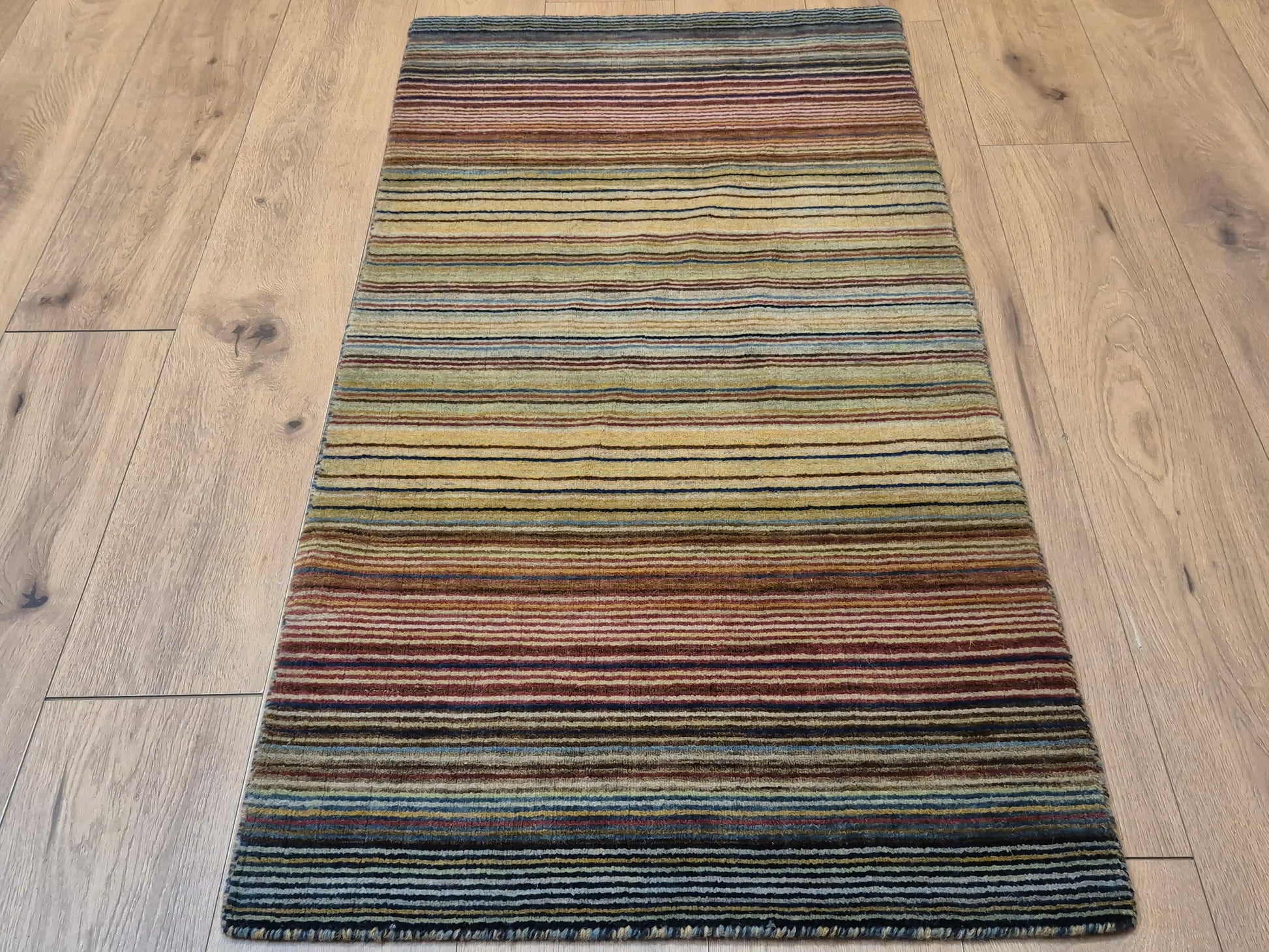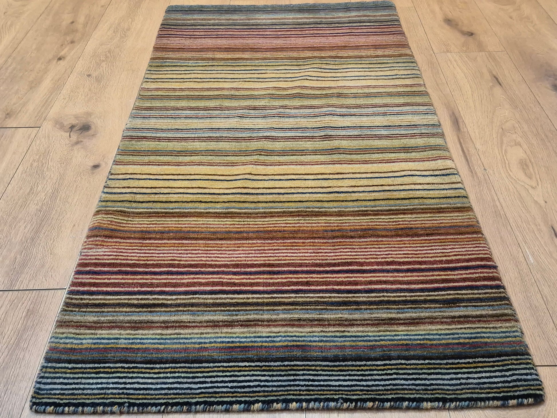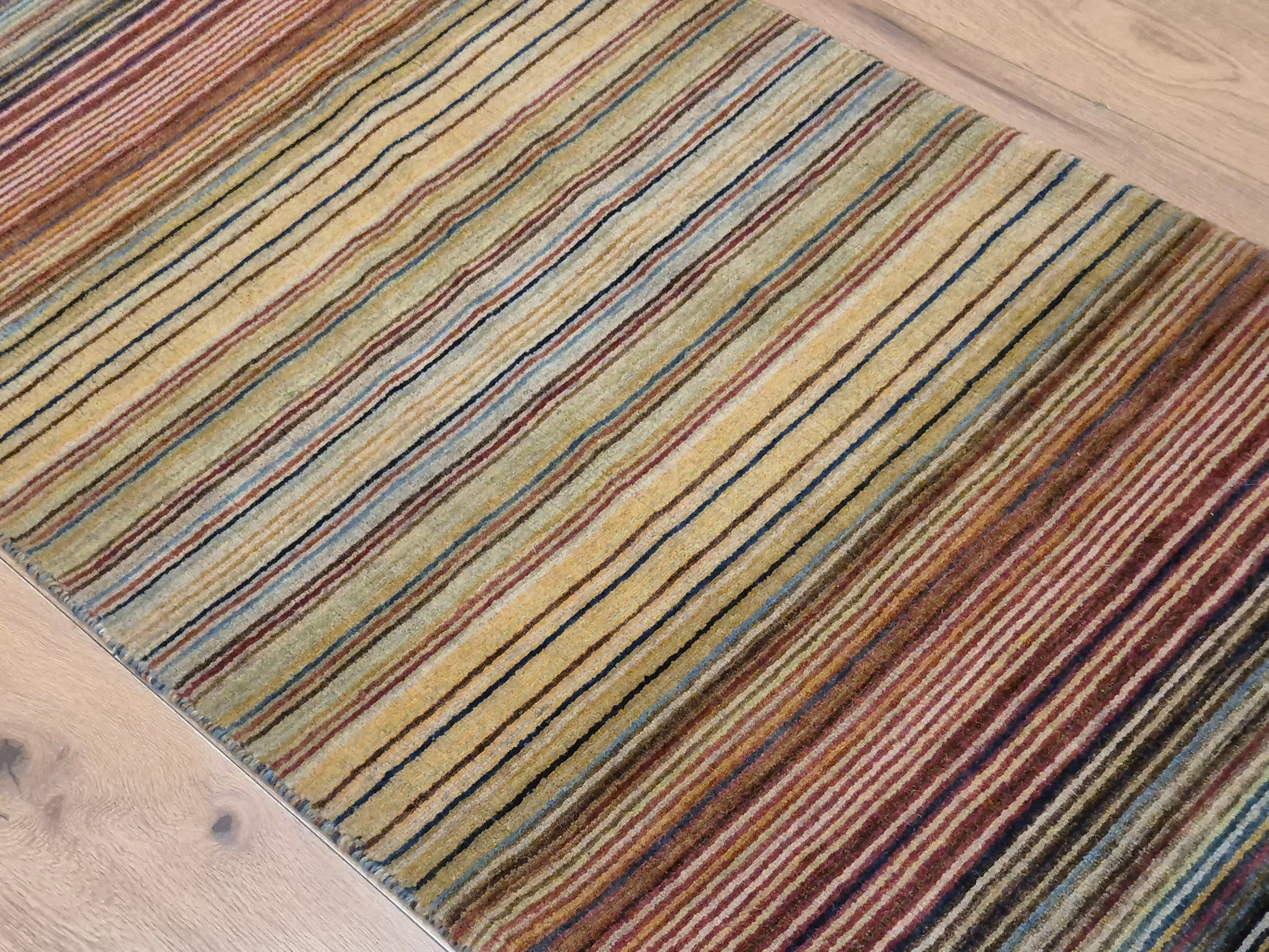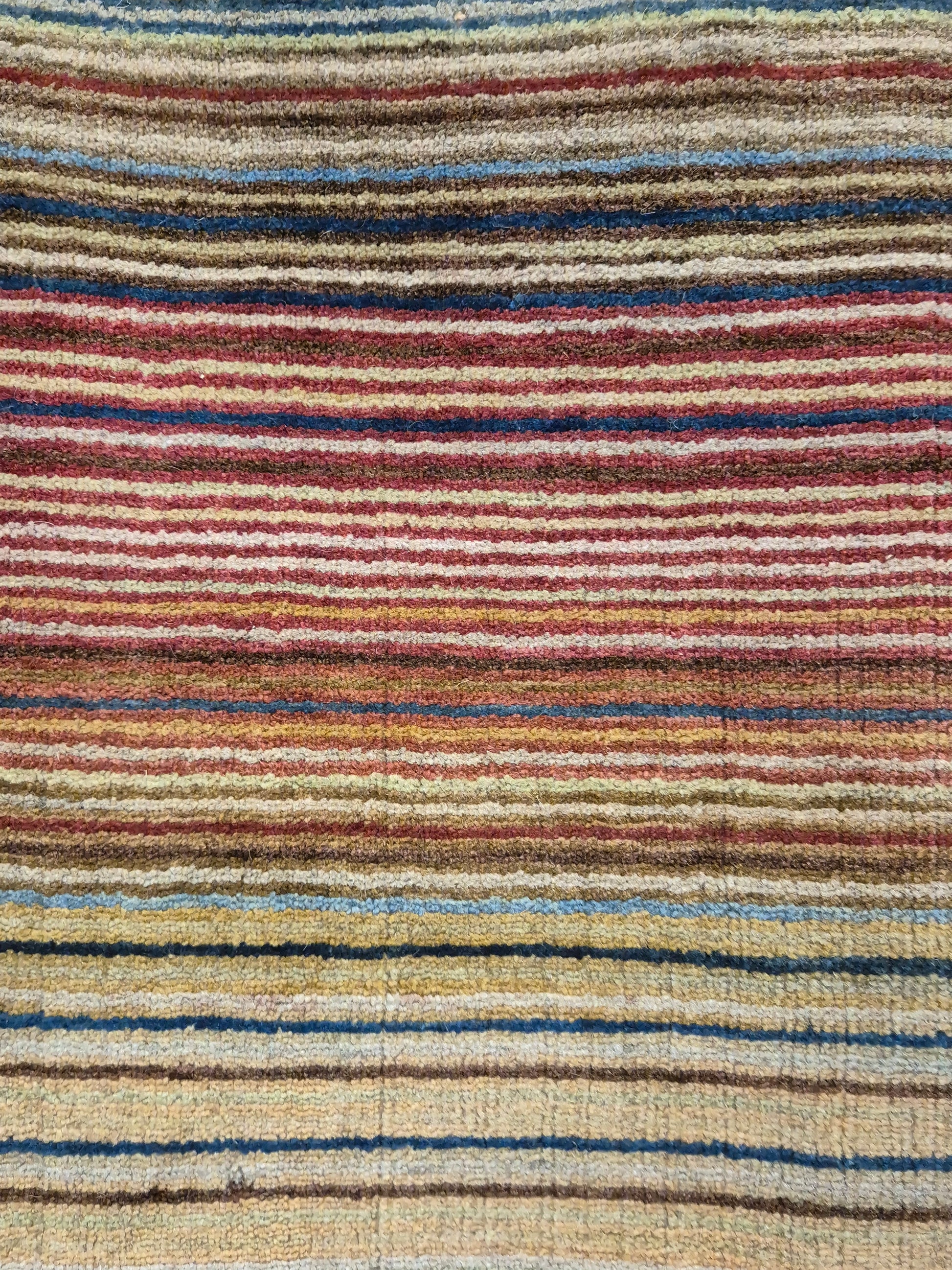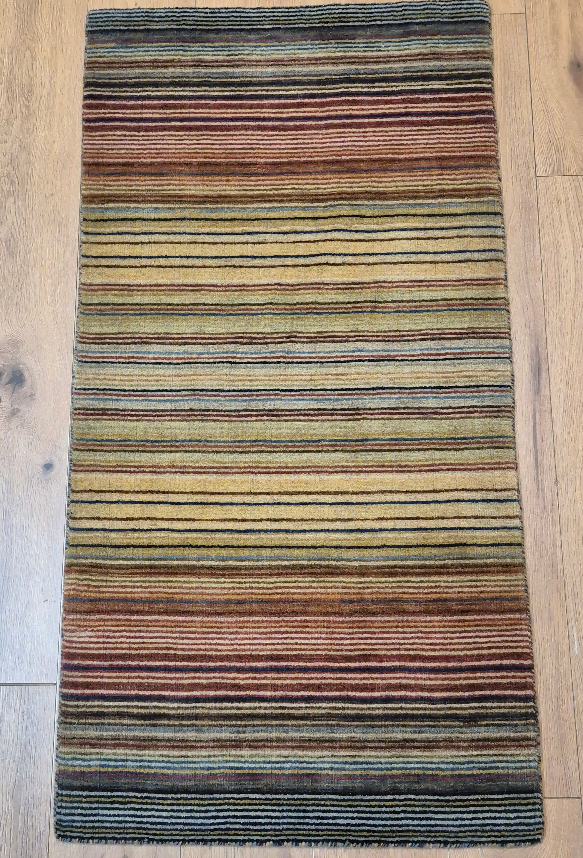 angeboten wird ein charmanter Gabbeh Teppich aus reiner Schurwolle, handgeknüpft in traditioneller Knüpfkunst. Das Design ist von lebhaften Streifenmustern geprägt, die in harmonischer Reihenfolge von warmen Rot- und Brauntönen über Gelb bis hin zu kühlem Blau und Grün verlaufen. Diese farbliche Vielfalt verleiht dem Teppich eine moderne, zugleich naturverbundene Ausstrahlung.