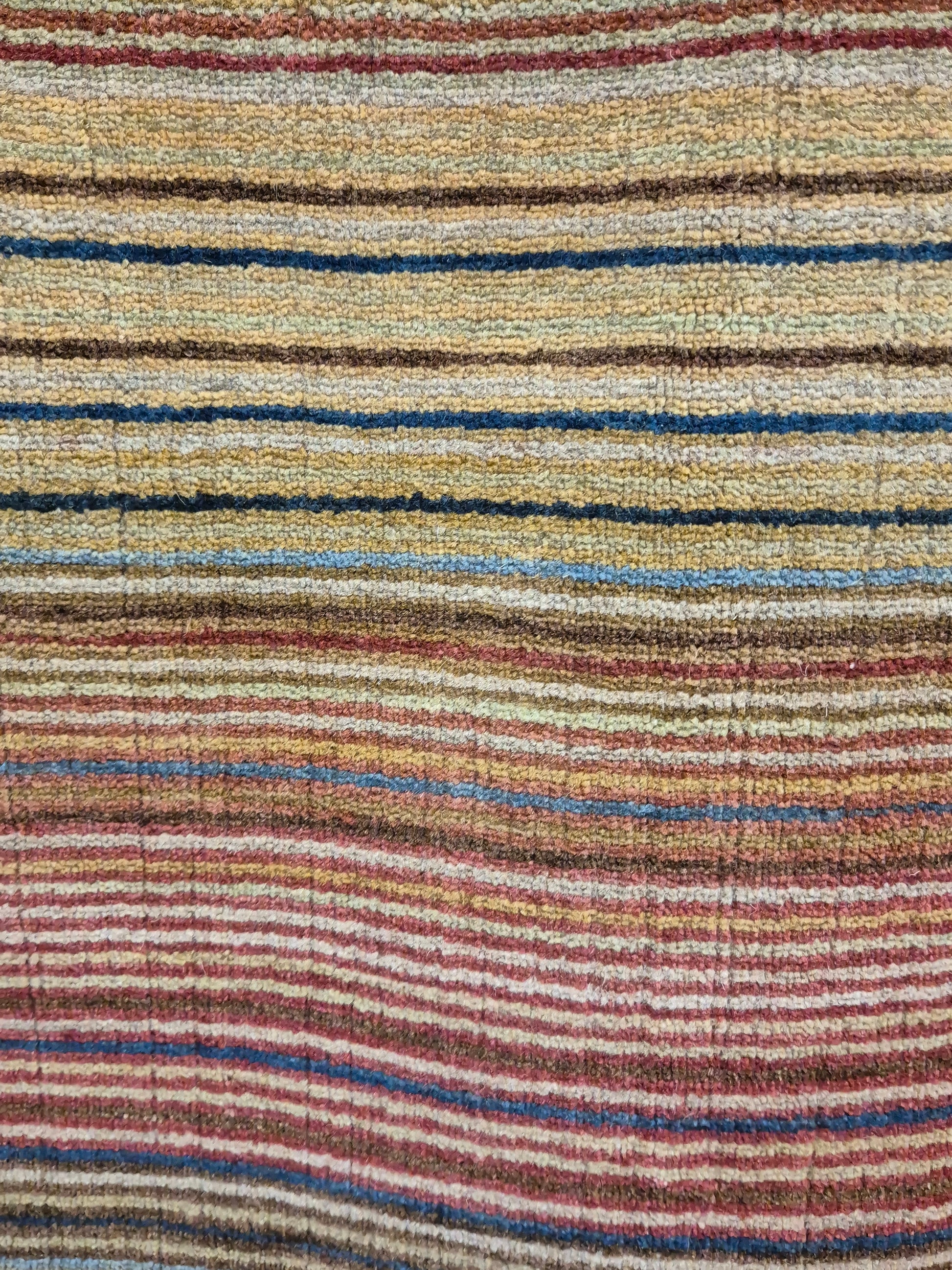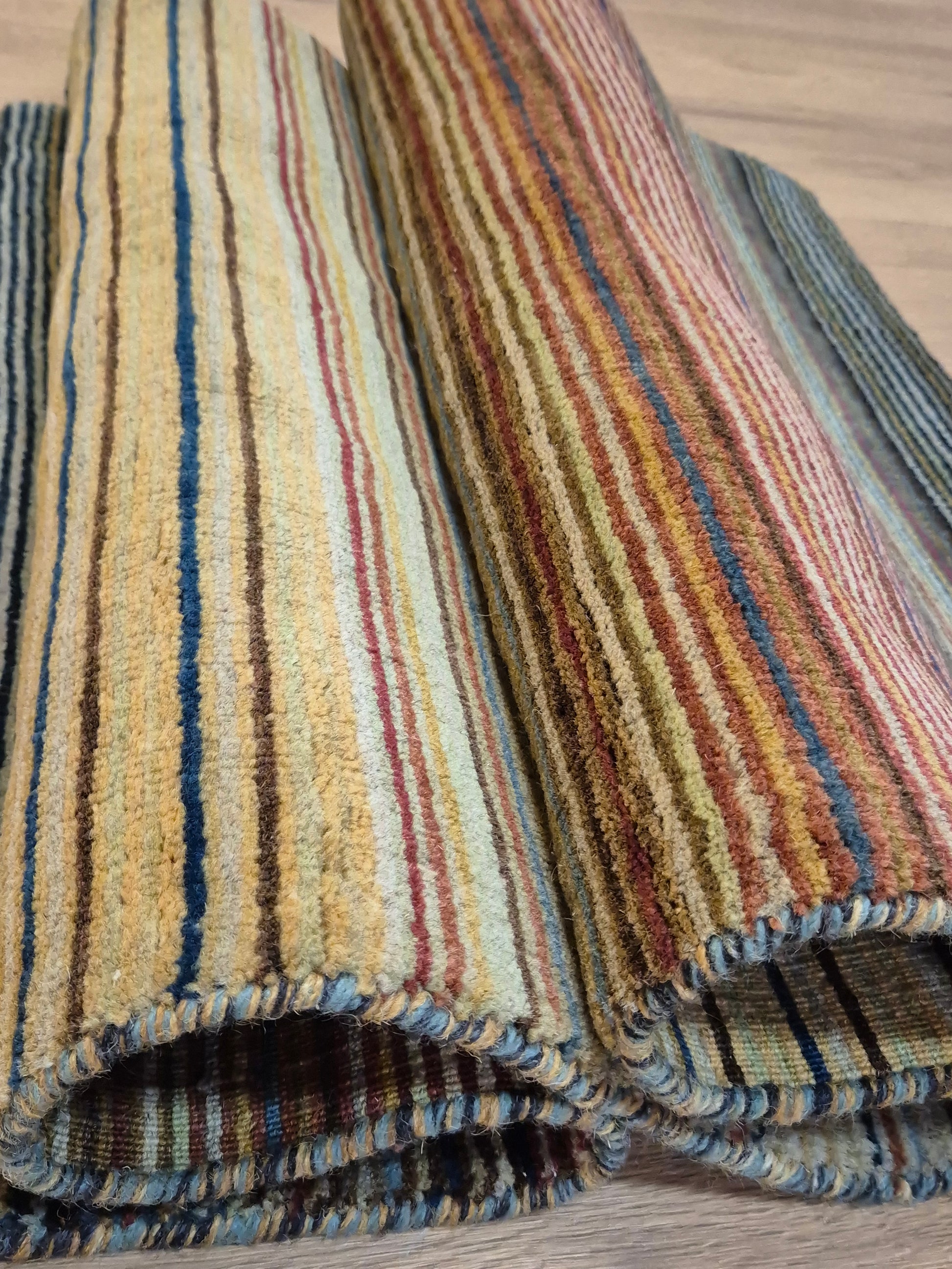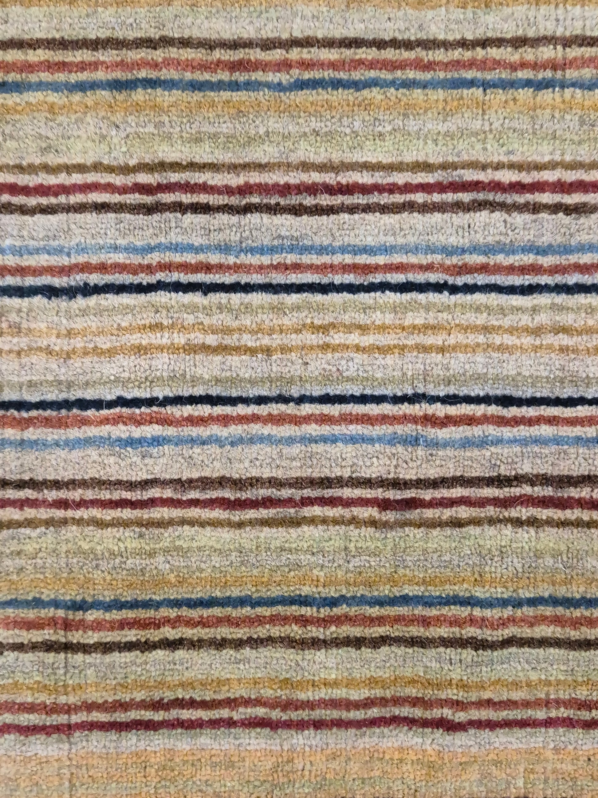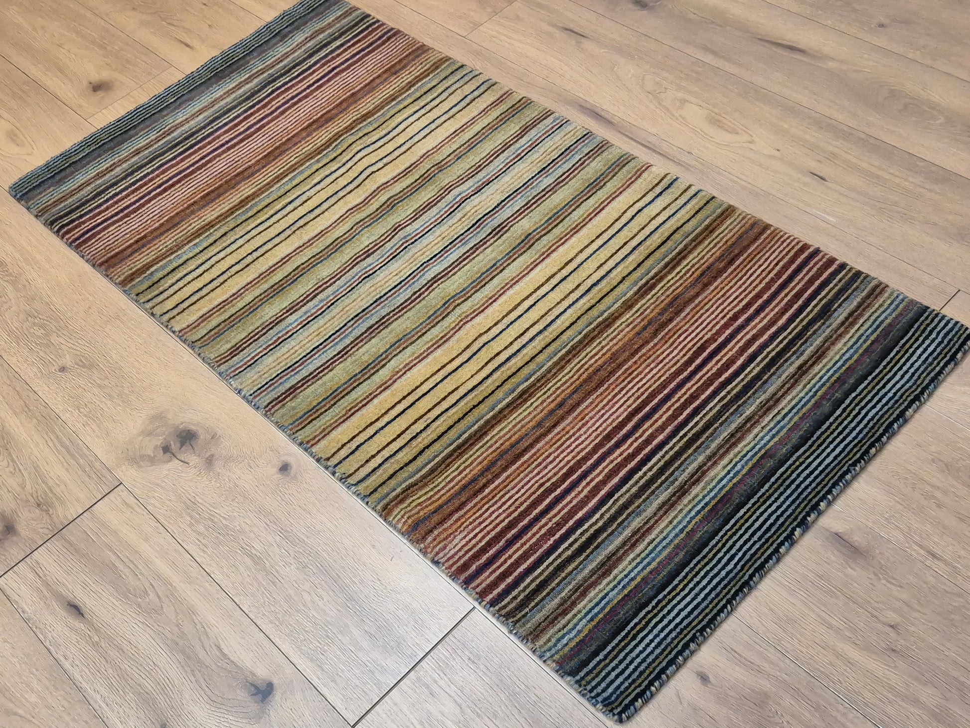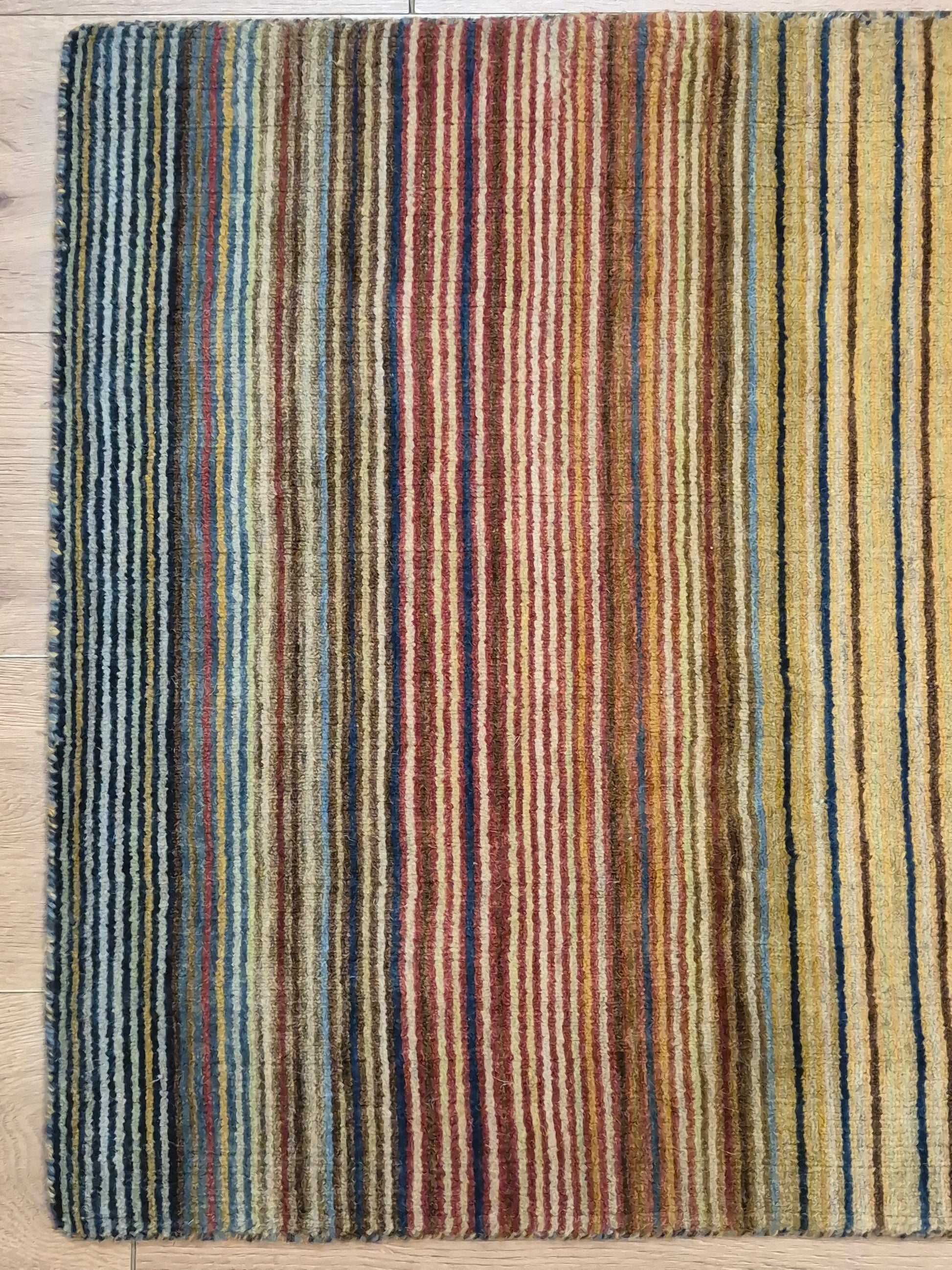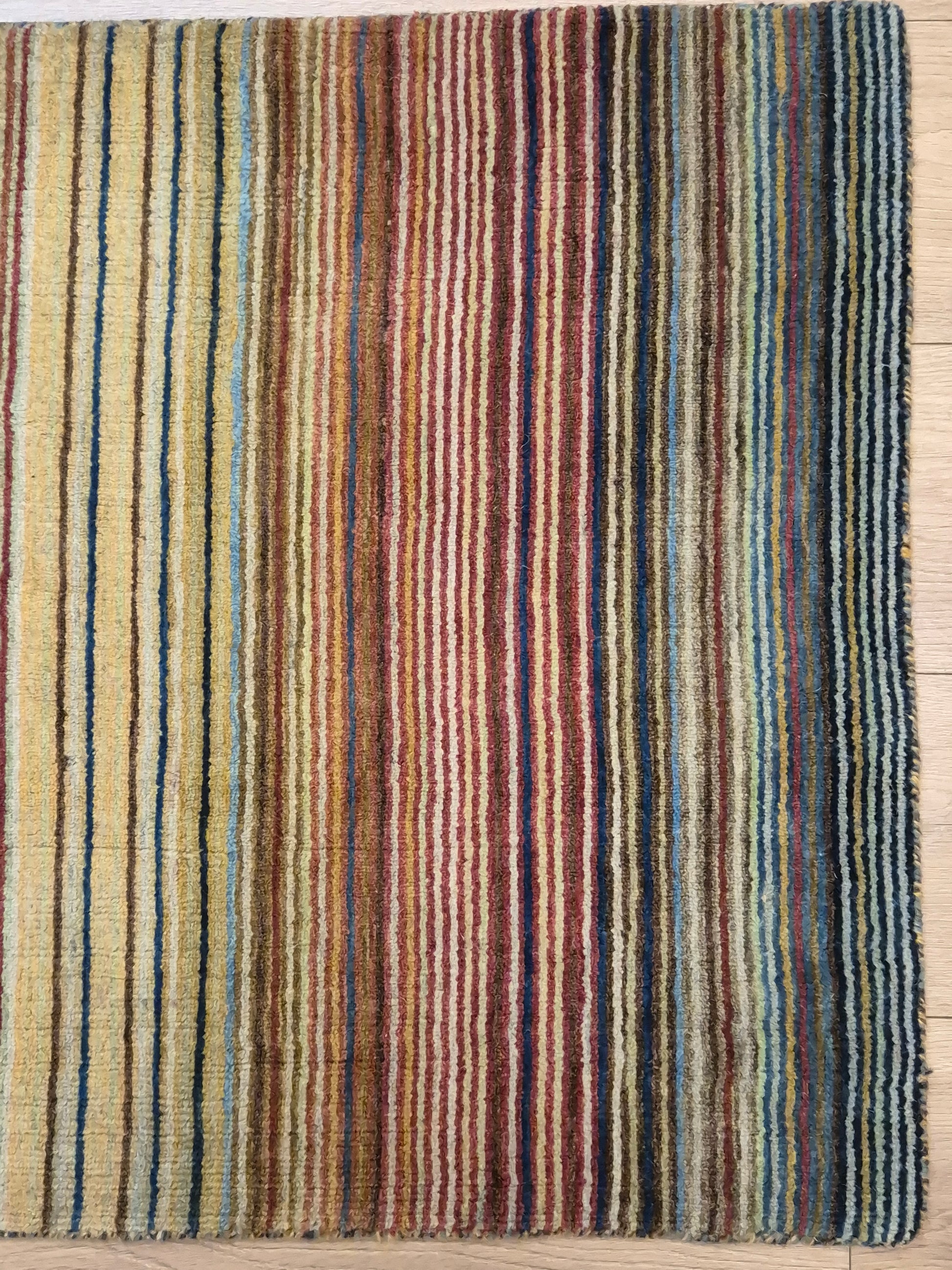 angeboten wird ein charmanter Gabbeh Teppich aus reiner Schurwolle, handgeknüpft in traditioneller Knüpfkunst. Das Design ist von lebhaften Streifenmustern geprägt, die in harmonischer Reihenfolge von warmen Rot- und Brauntönen über Gelb bis hin zu kühlem Blau und Grün verlaufen. Diese farbliche Vielfalt verleiht dem Teppich eine moderne, zugleich naturverbundene Ausstrahlung.