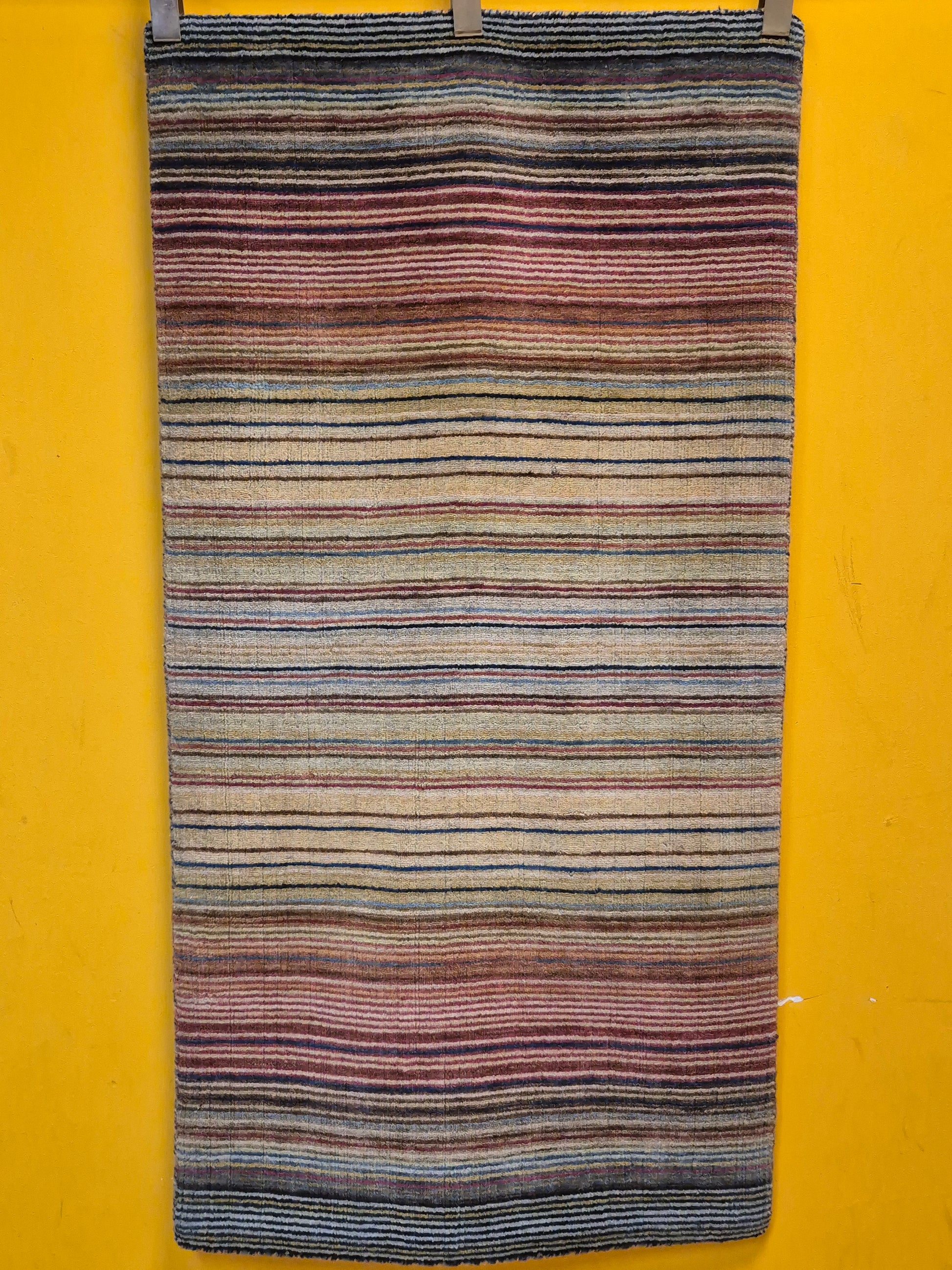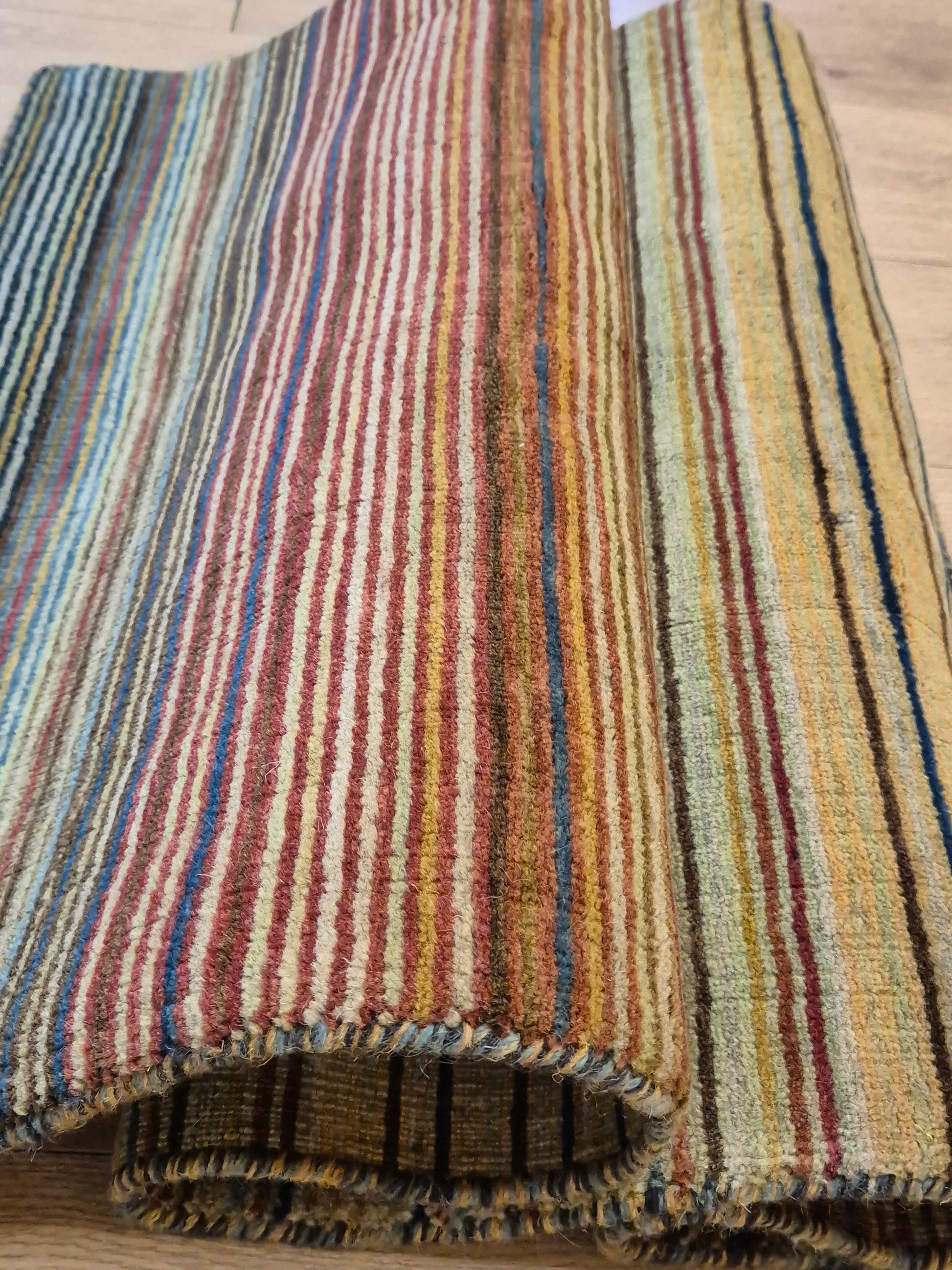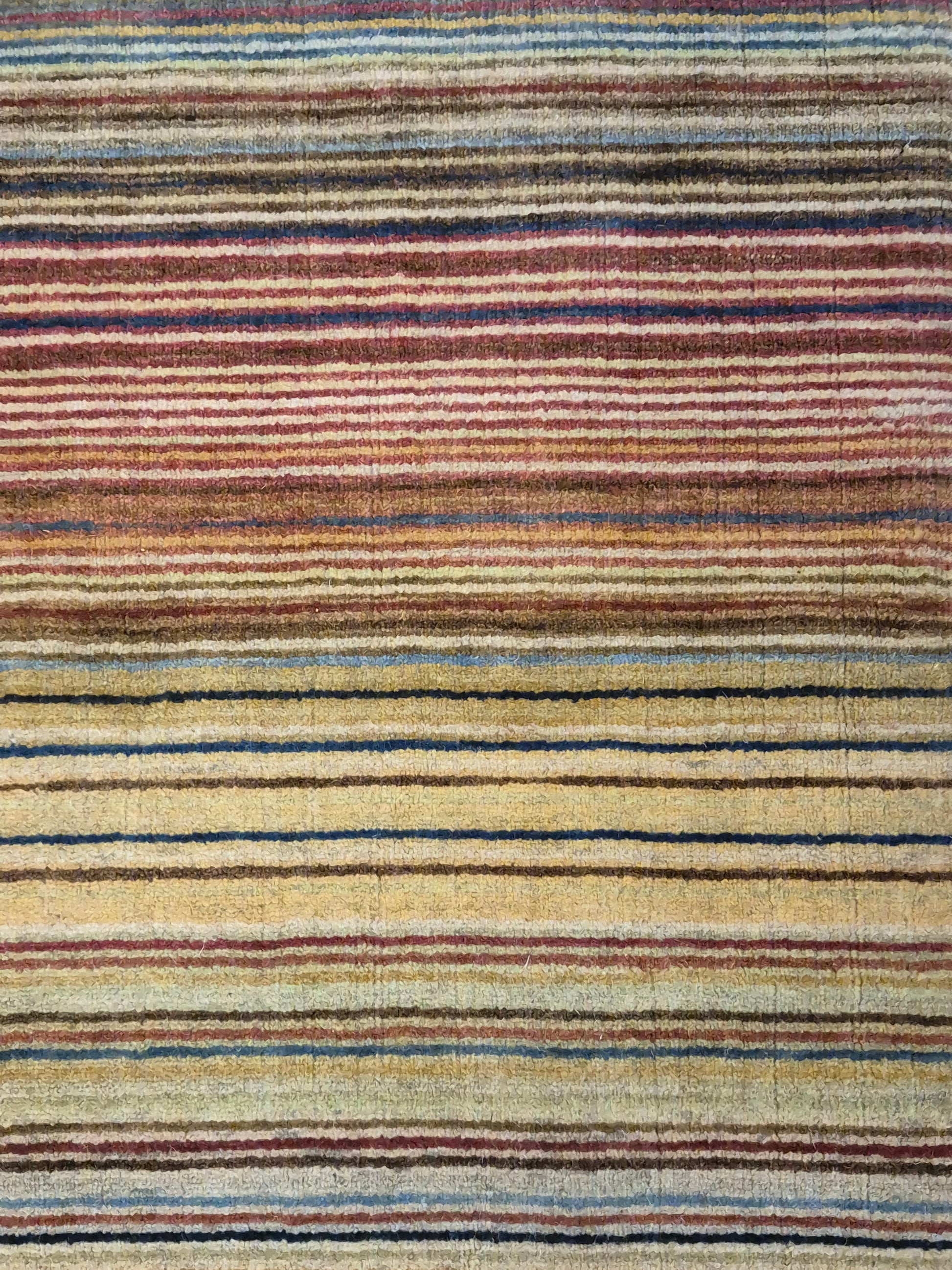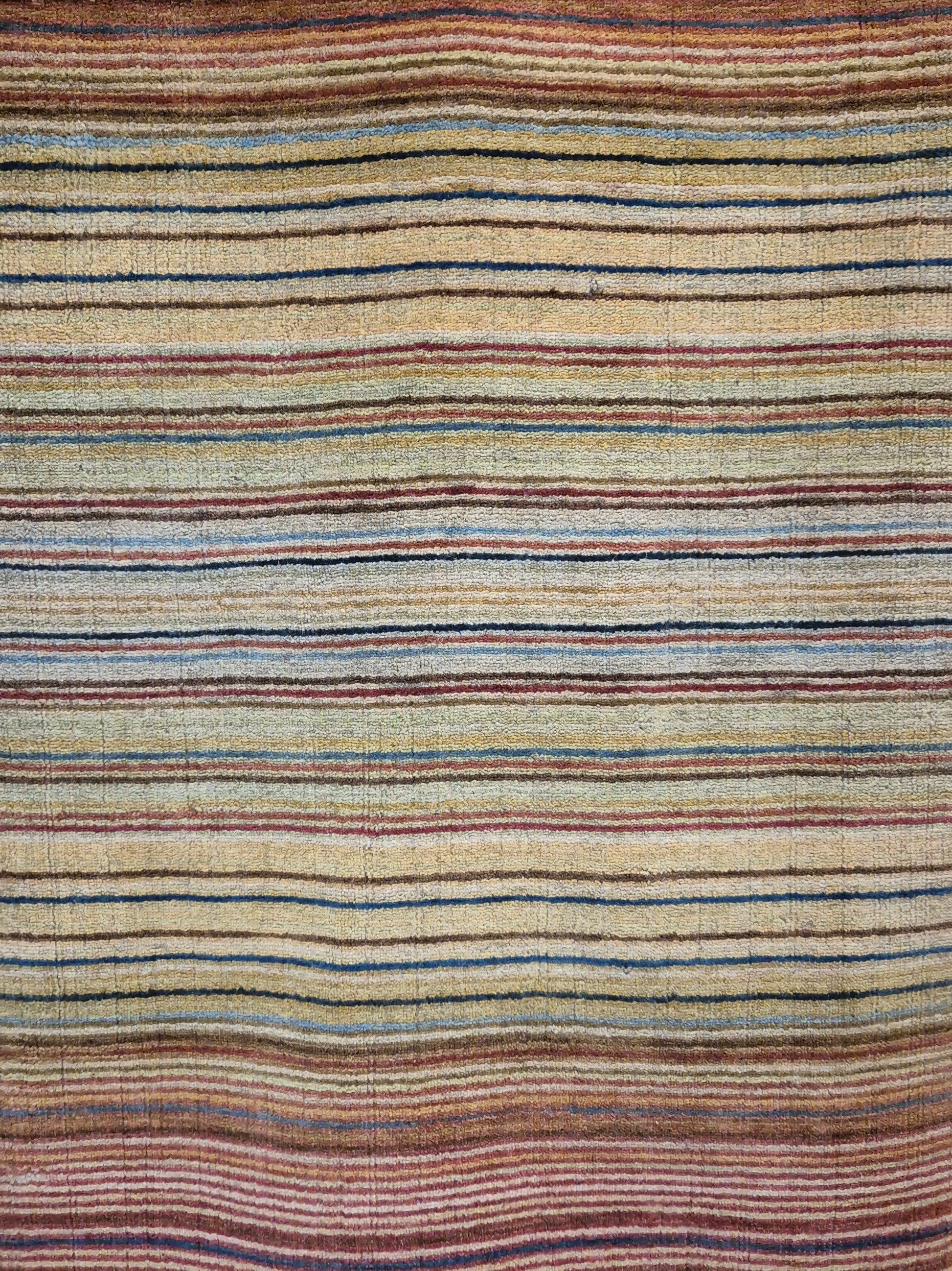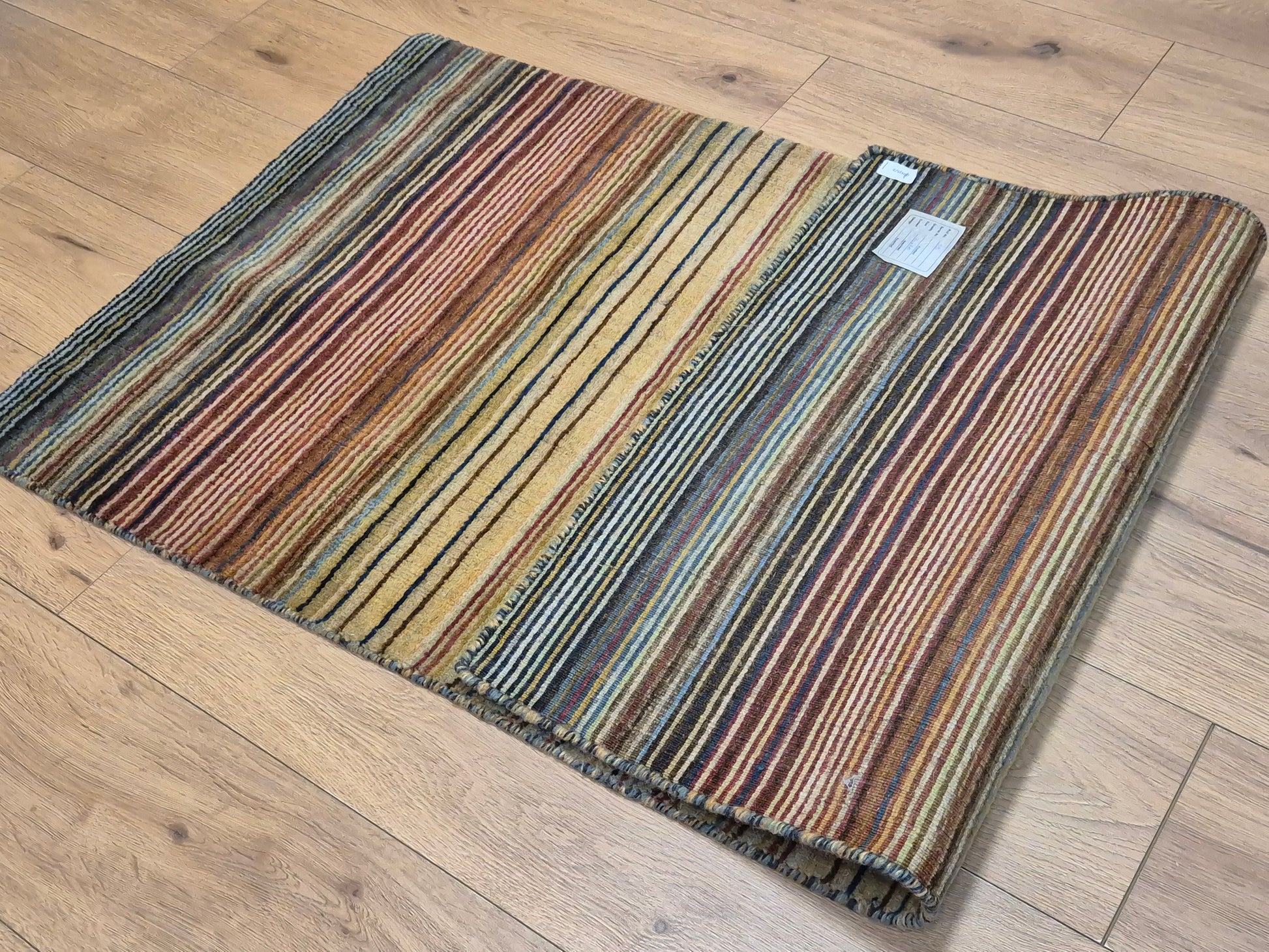 angeboten wird ein charmanter Gabbeh Teppich aus reiner Schurwolle, handgeknüpft in traditioneller Knüpfkunst. Das Design ist von lebhaften Streifenmustern geprägt, die in harmonischer Reihenfolge von warmen Rot- und Brauntönen über Gelb bis hin zu kühlem Blau und Grün verlaufen. Diese farbliche Vielfalt verleiht dem Teppich eine moderne, zugleich naturverbundene Ausstrahlung.