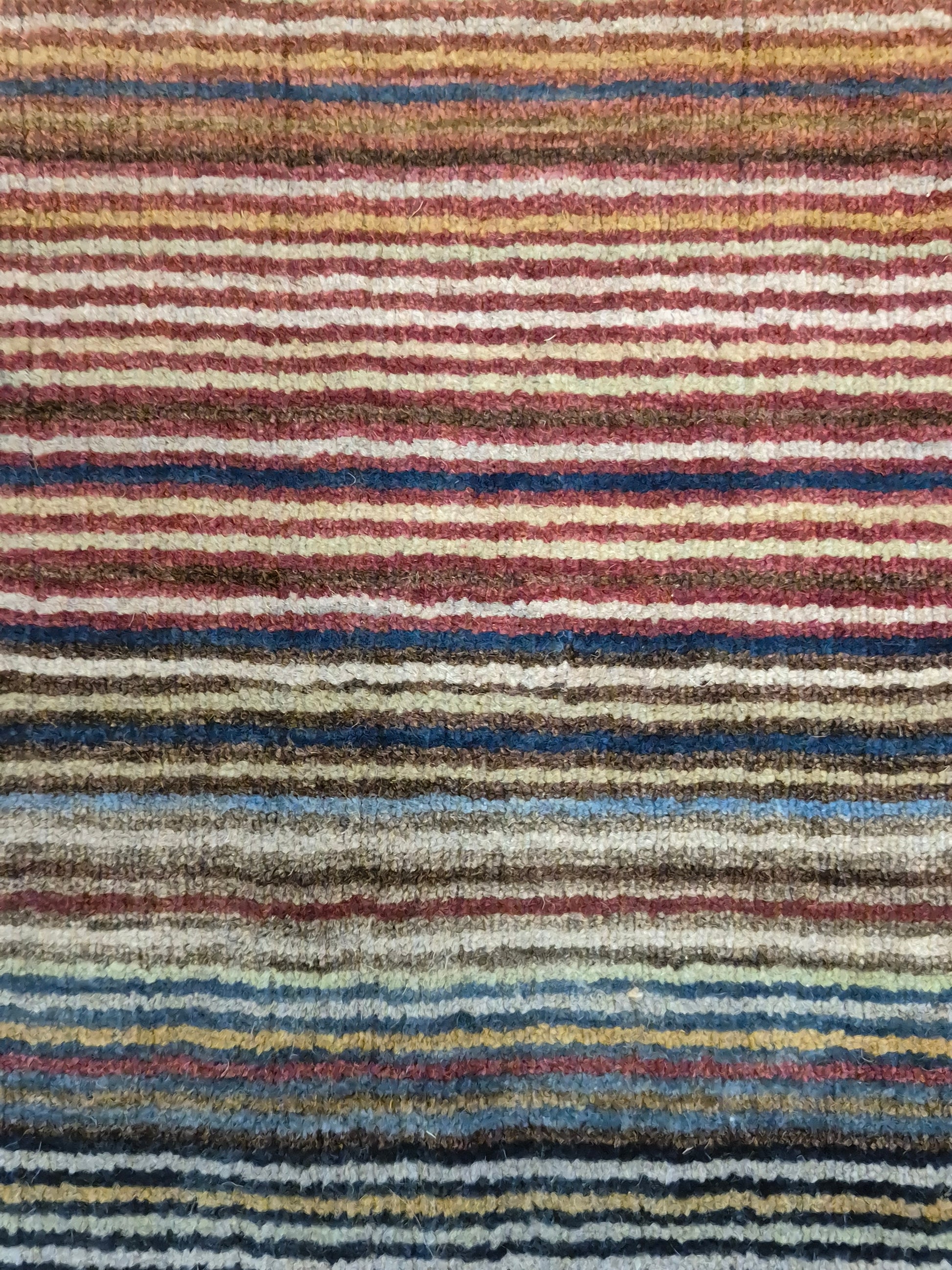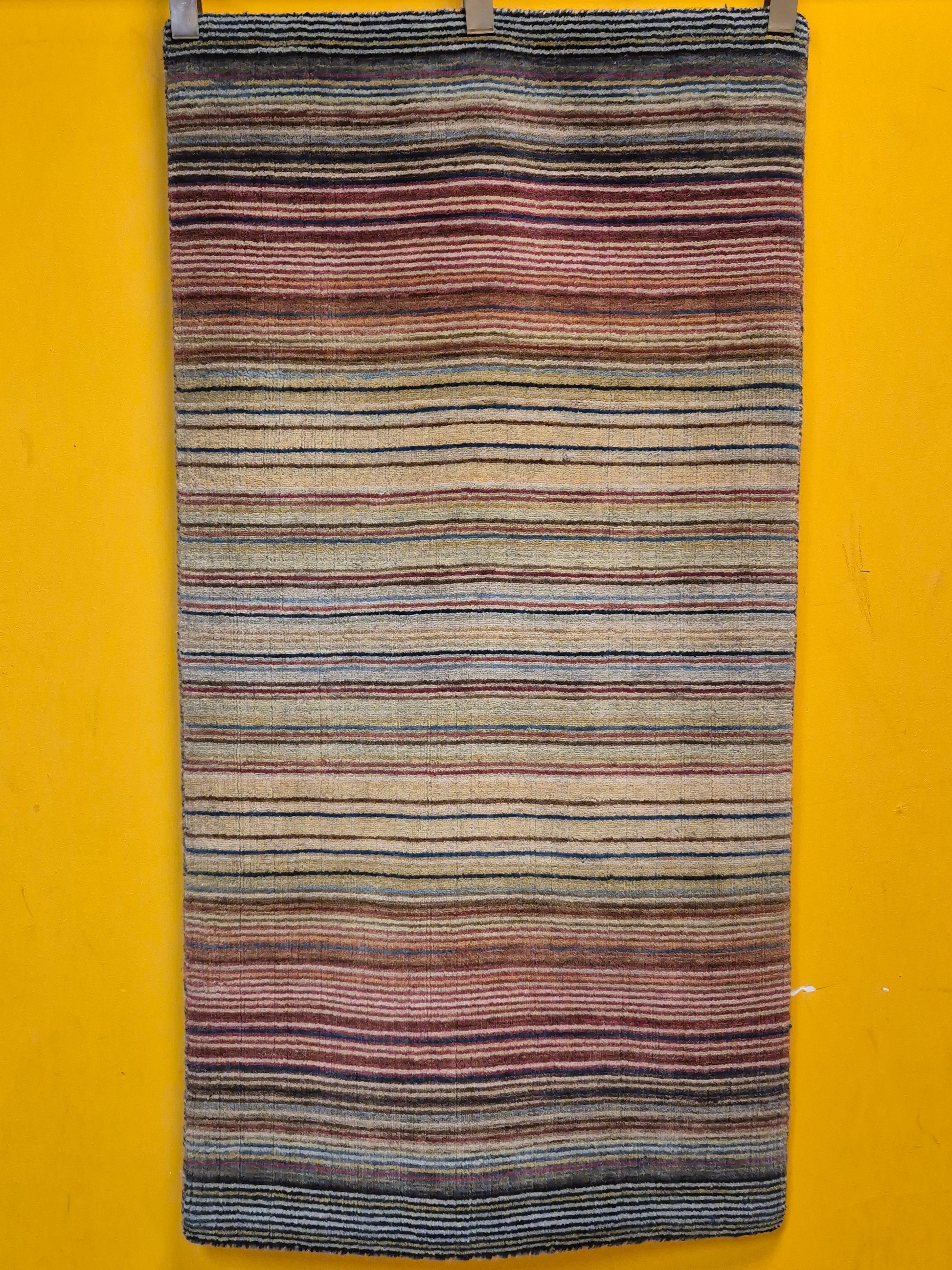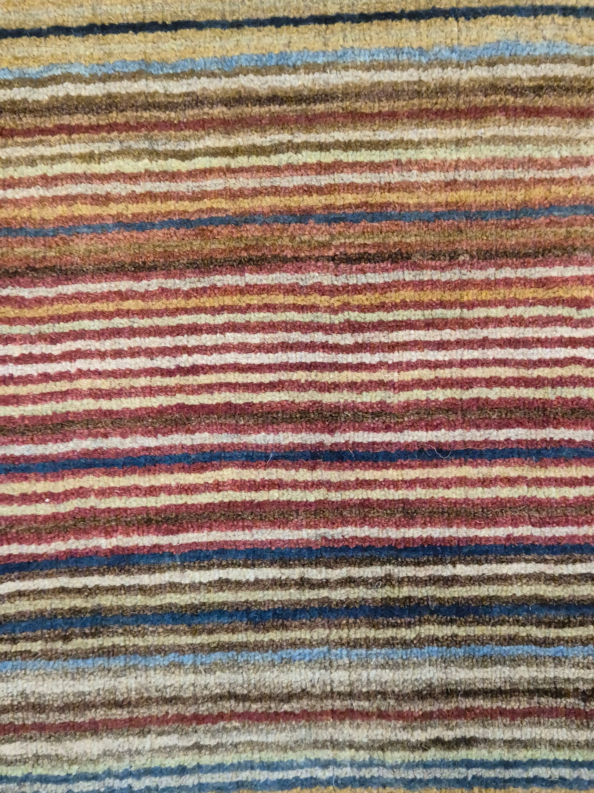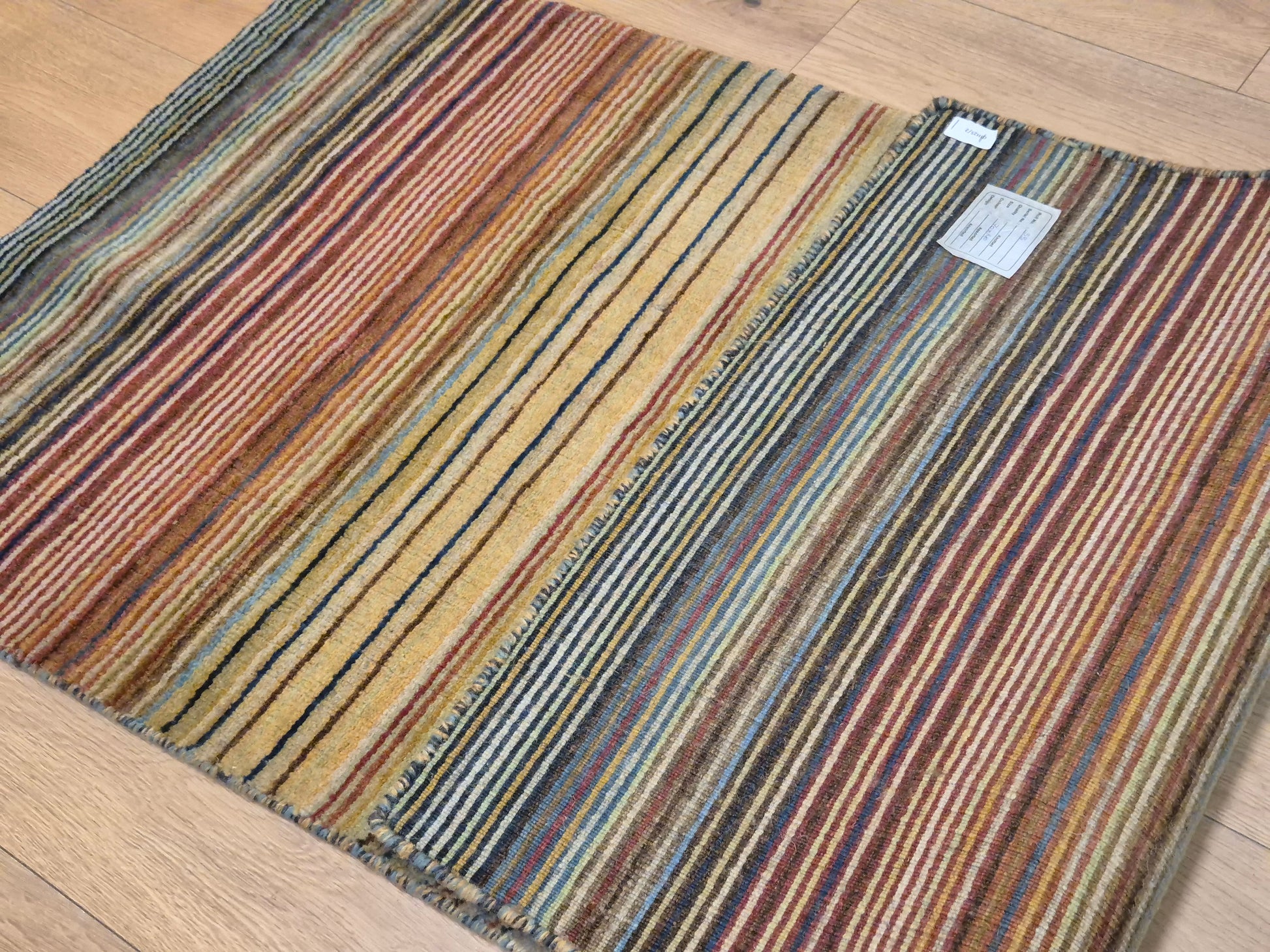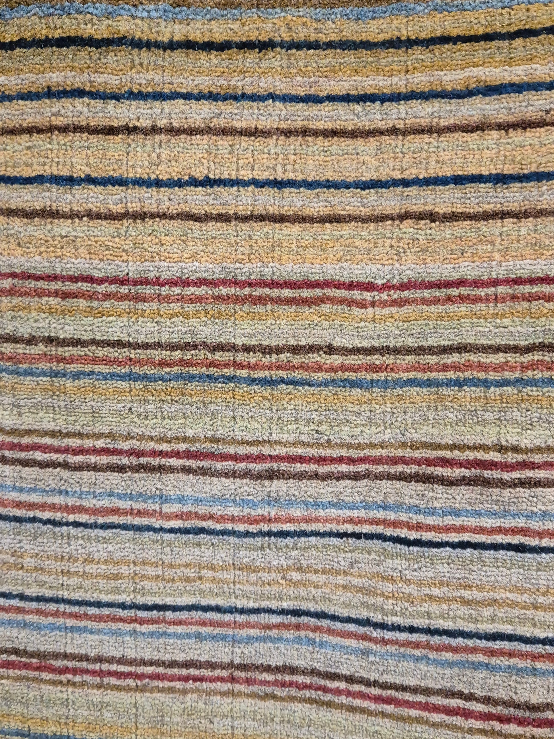 angeboten wird ein charmanter Gabbeh Teppich aus reiner Schurwolle, handgeknüpft in traditioneller Knüpfkunst. Das Design ist von lebhaften Streifenmustern geprägt, die in harmonischer Reihenfolge von warmen Rot- und Brauntönen über Gelb bis hin zu kühlem Blau und Grün verlaufen. Diese farbliche Vielfalt verleiht dem Teppich eine moderne, zugleich naturverbundene Ausstrahlung.
